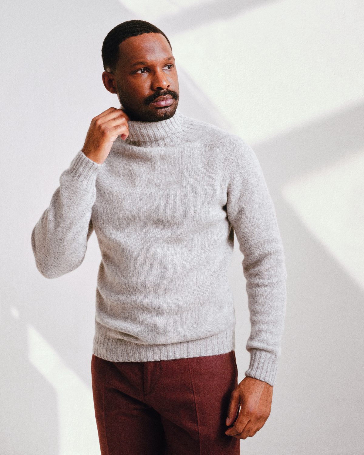 Découvrez notre pull col roulé en pure laine vierge Shetland, issu d’une filature écossaise, se distingue par son brossage unique à la cardère sauvage, offrant un effet duveteux. La laine est douce au toucher avec toute la résistance d’un fil shetland. D’épaisseur moyenne, il est chaud et confortable, doté d’une coupe droite et d’un col rond, il se porte facilement sur une chemise. Fabriqué en Écosse dans des lainages locaux de grande qualité.