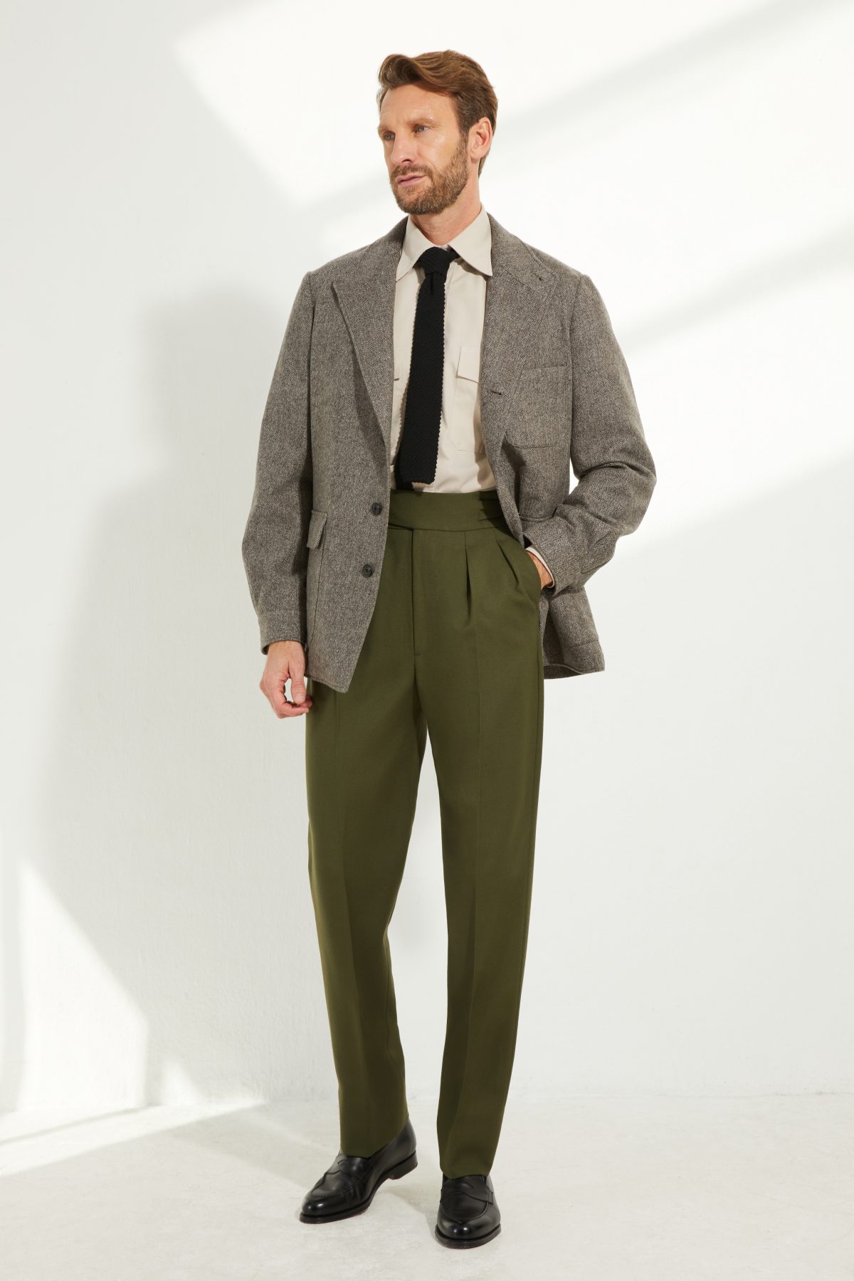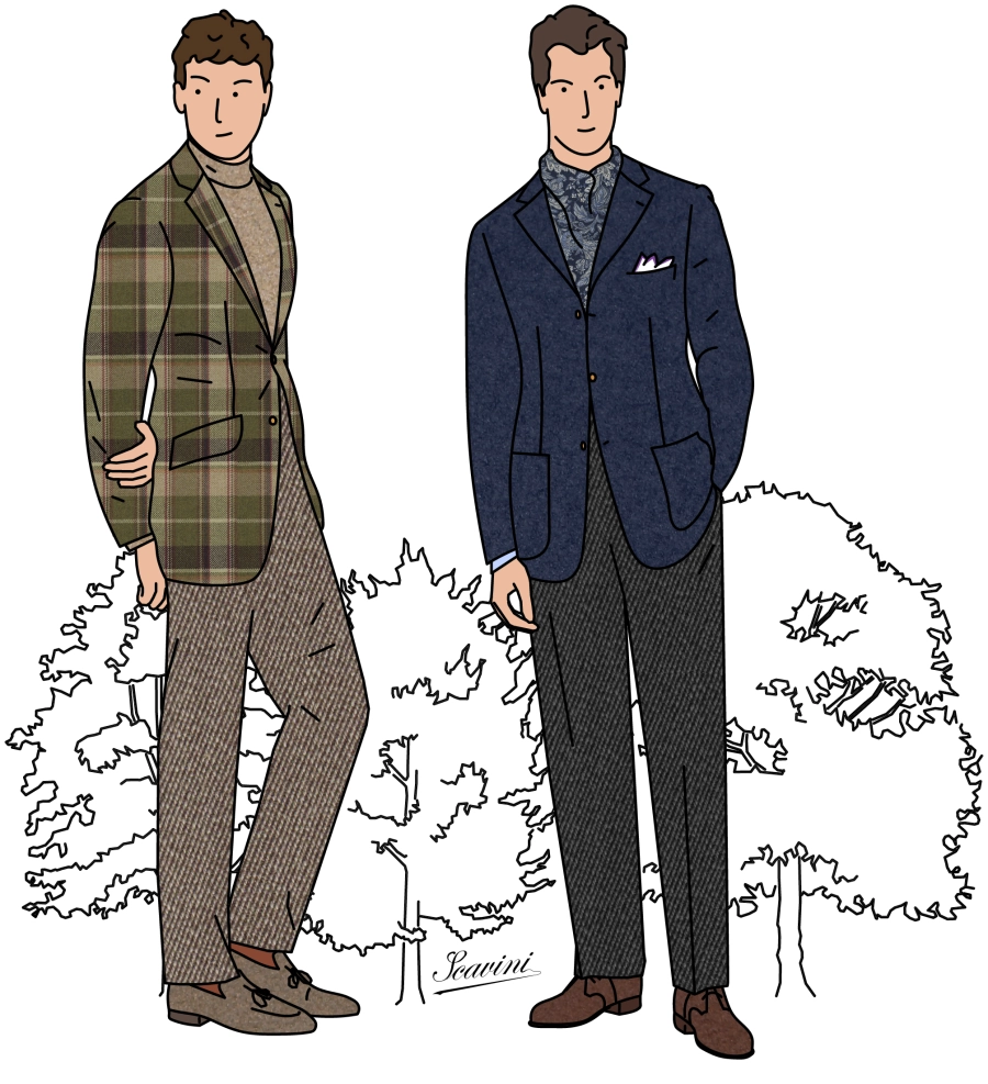 These thick, textured fabrics were historically used for breeches and outdoor trousers. Even today, they’re ideal for mid-season and winter: robust, warm, and elegant.