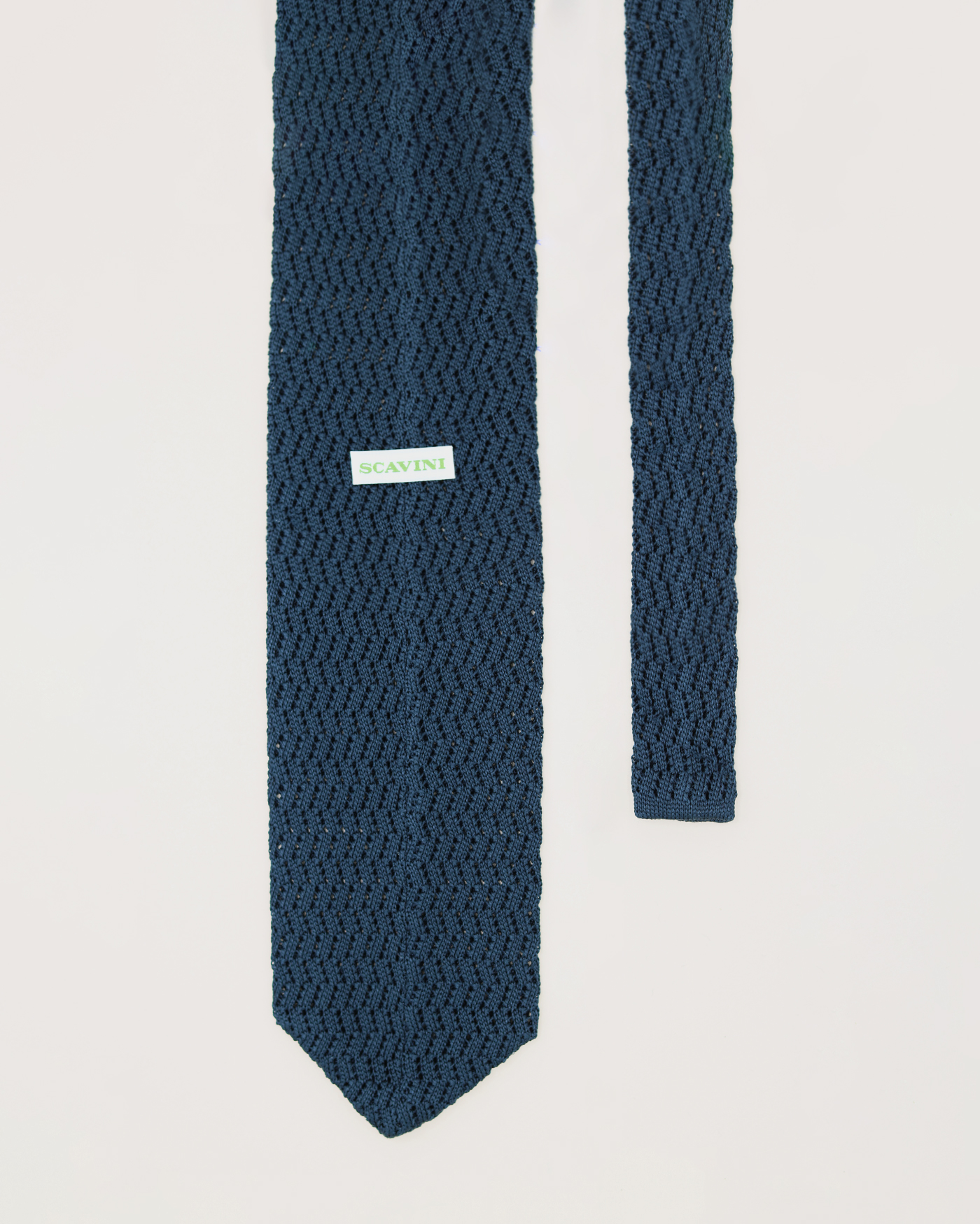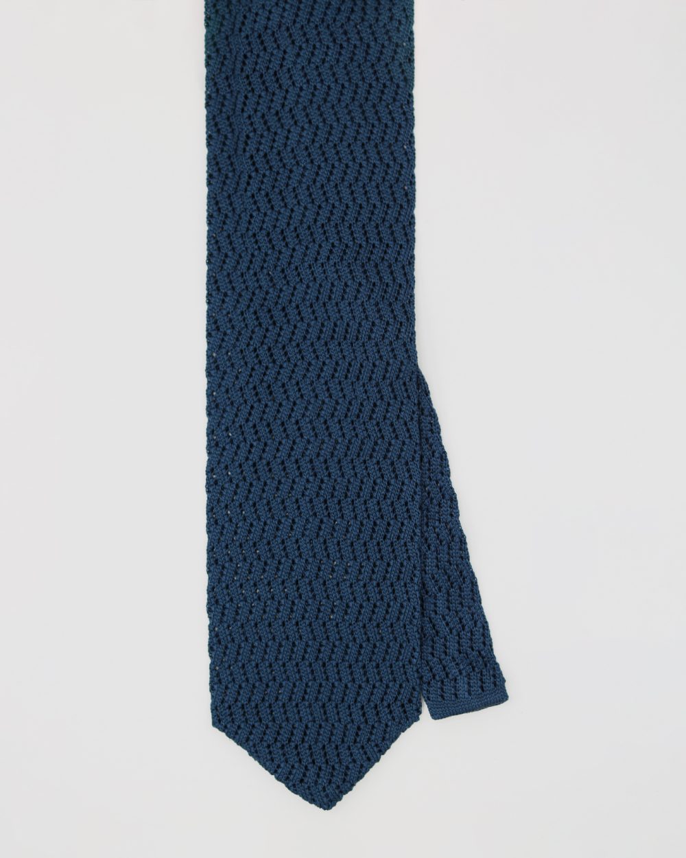 Our knitted tie is crafted from luxurious silk. It stands out with its zigzag knit pattern and wide tip, adding a touch of elegance to your outfits.