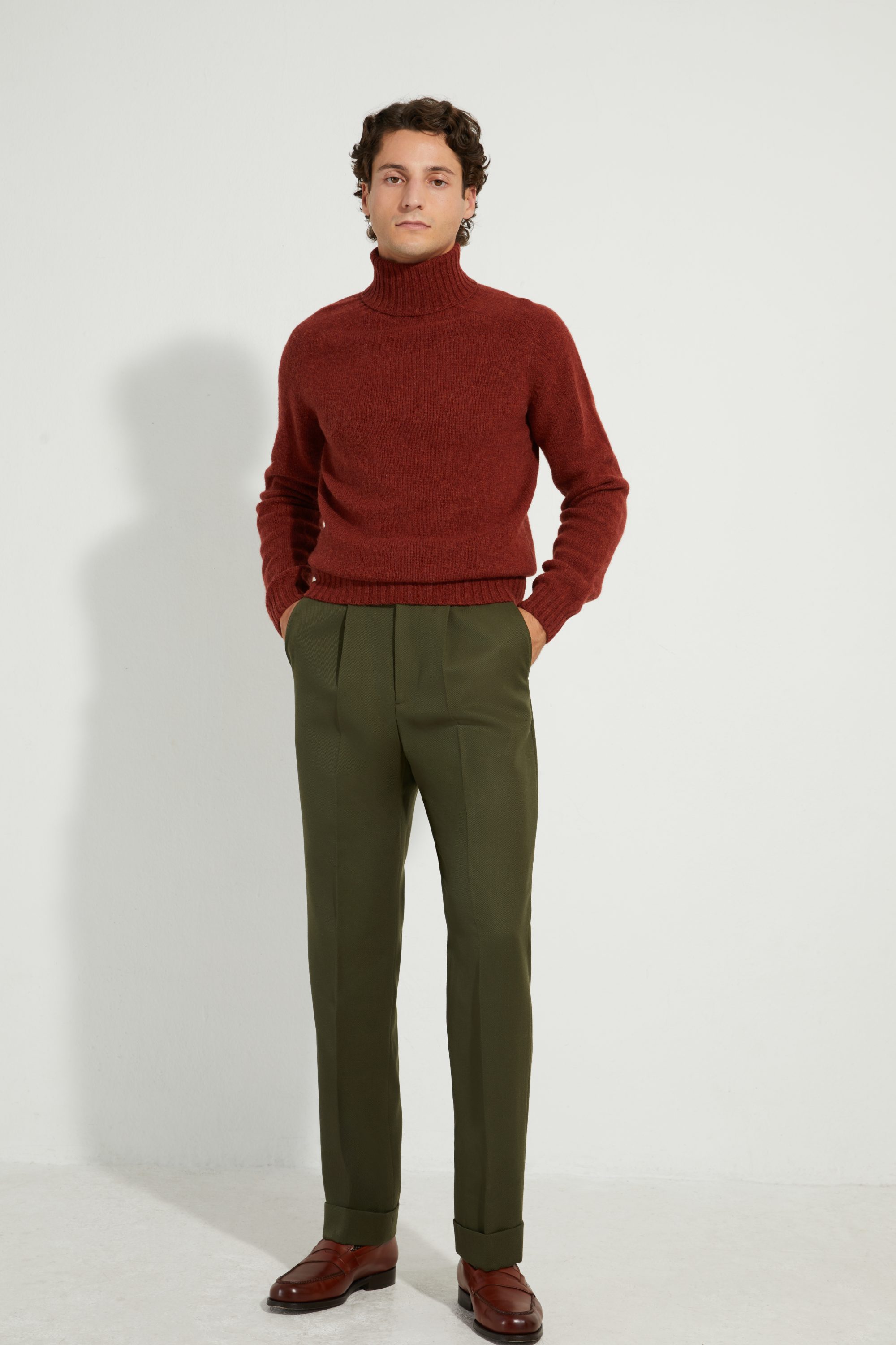With a medium thickness, it is warm and comfortable, featuring a straight cut and a turtleneck, making it easy to wear on its own or layered under a jacket.