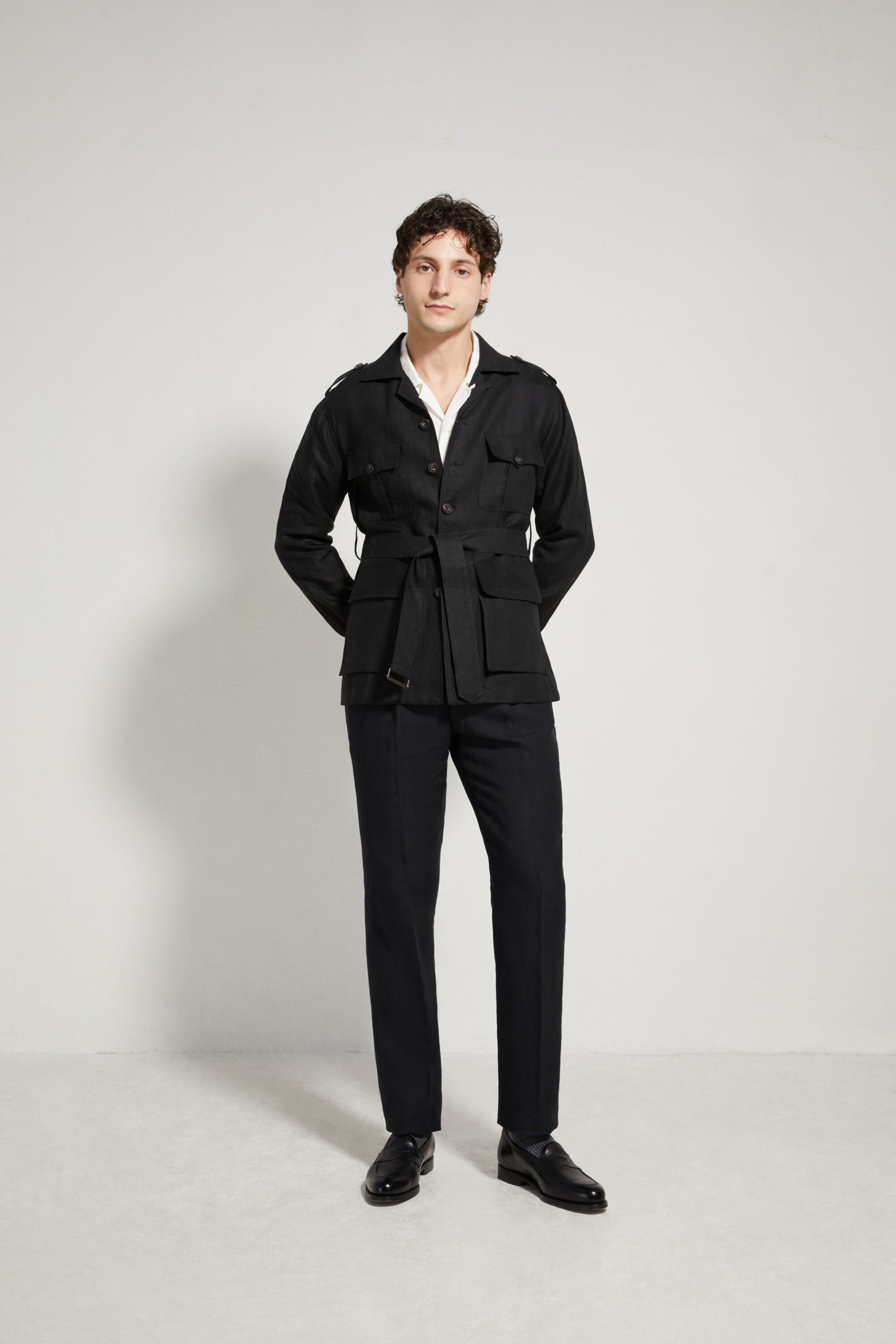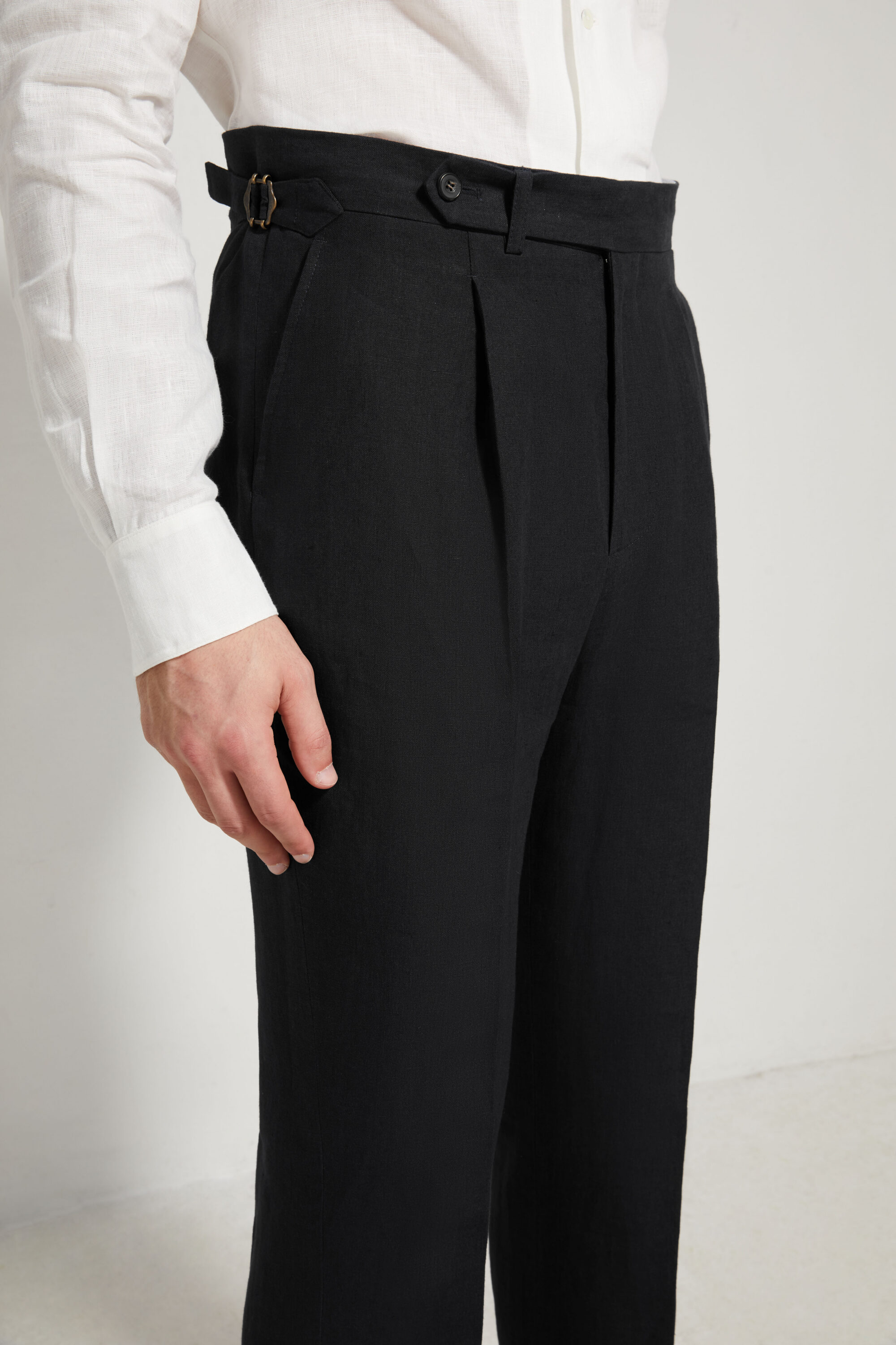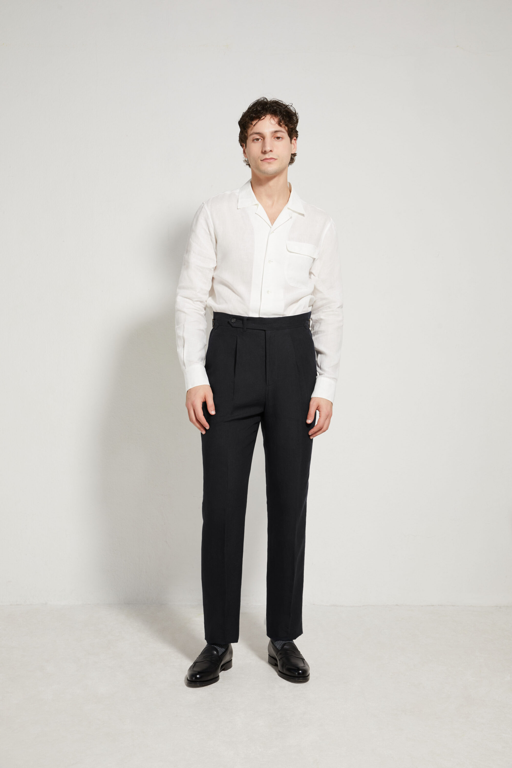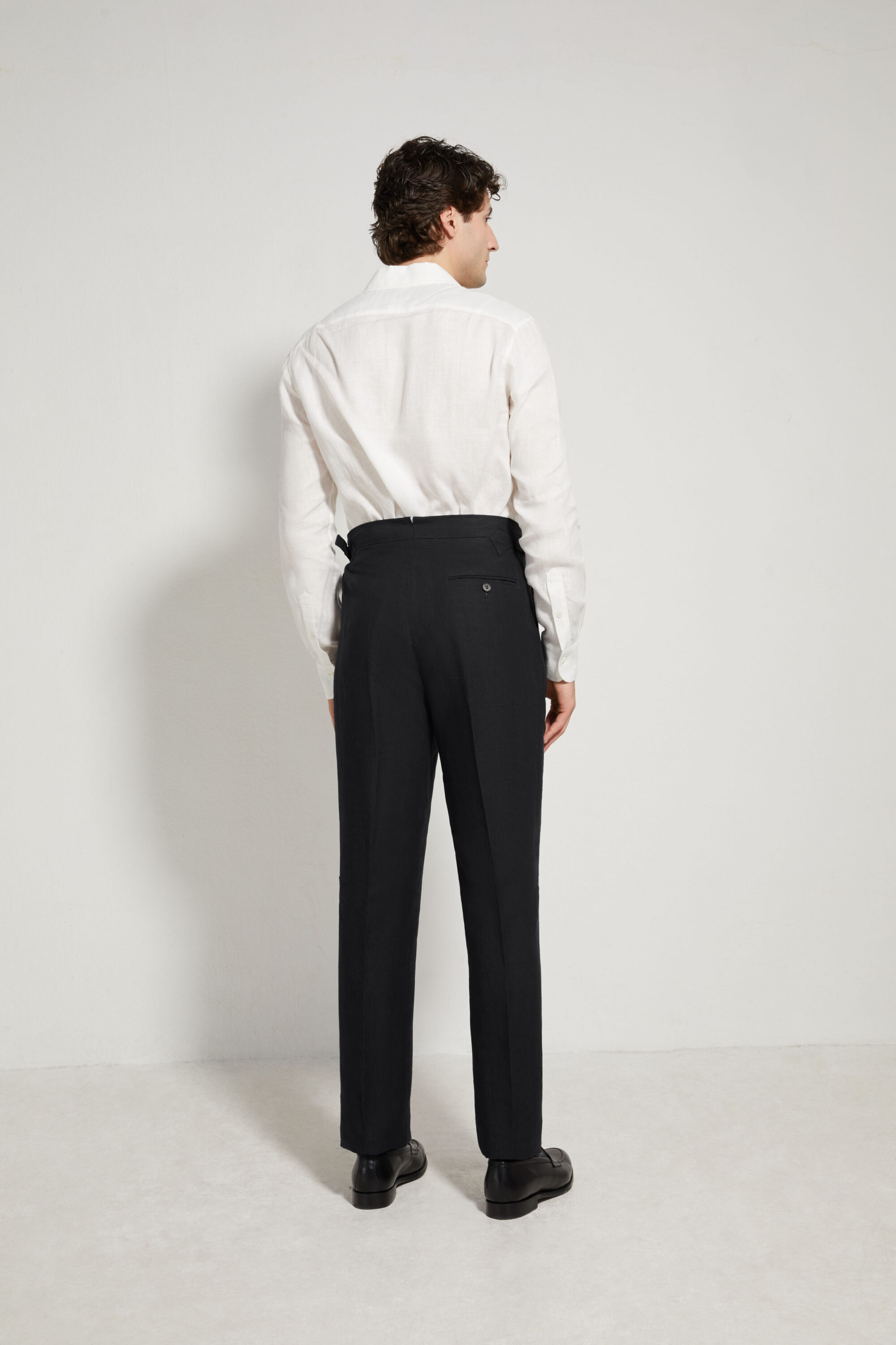 Our trousers feature a high-rise, straight cut, designed to structure the silhouette and elegantly elongate the leg. Worn at the waist, they provide a clean, balanced line, true to the spirit of tailoring.