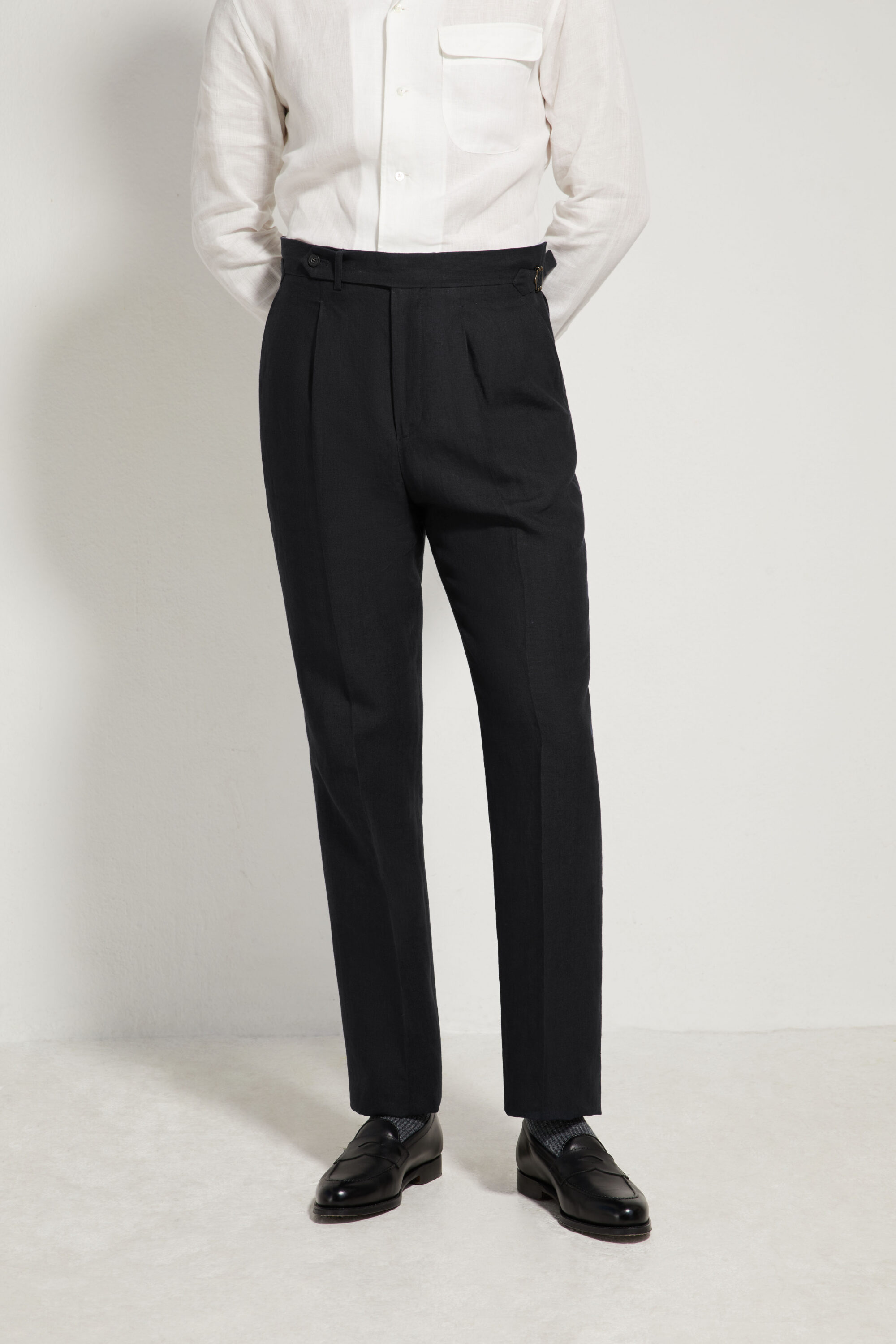They feature a single pleat for added comfort and ease of movement, while maintaining a classic, timeless look. The leg is straight, with enough room through the thigh and hem to ensure a fluid drape without being excessive.