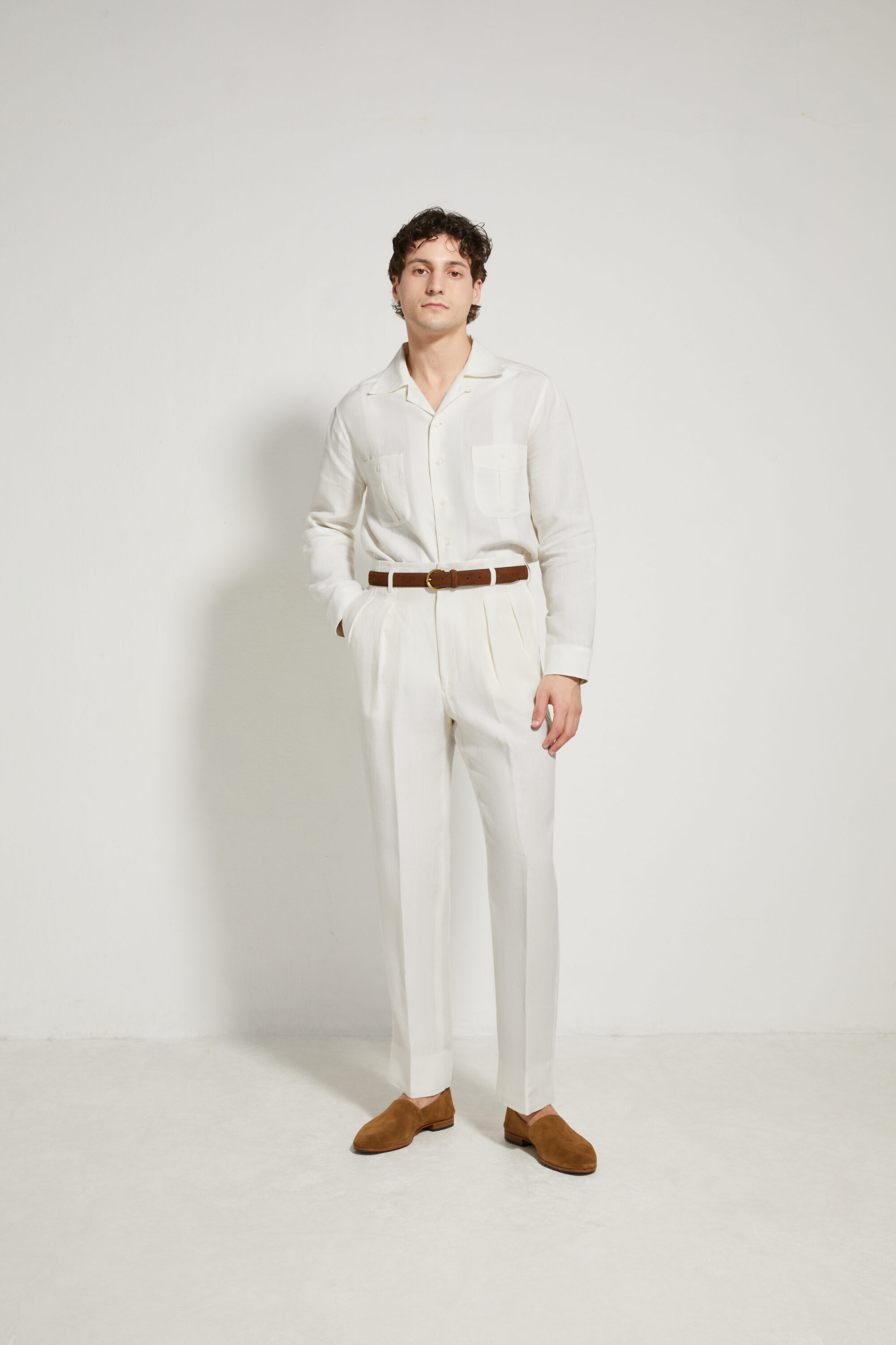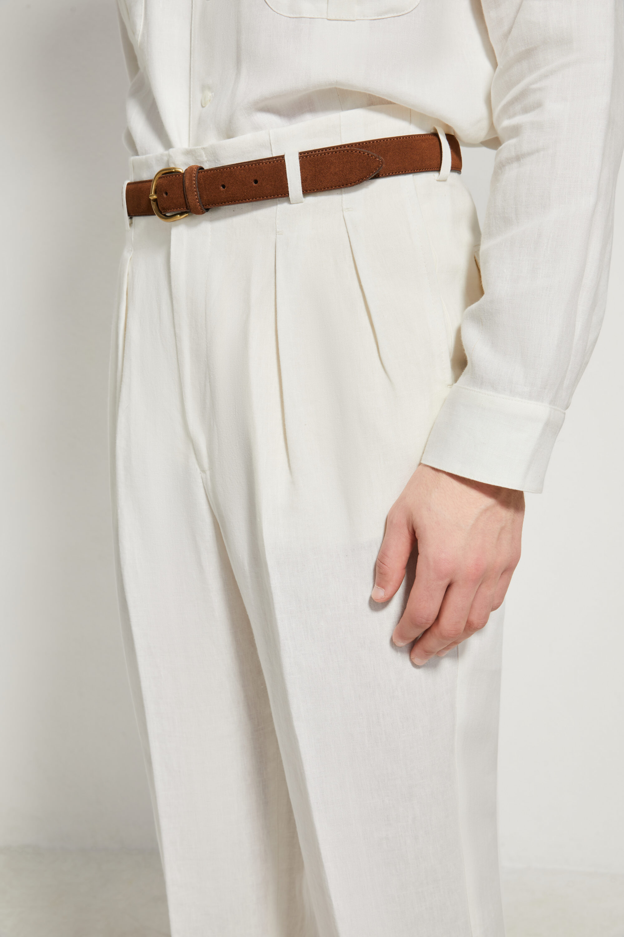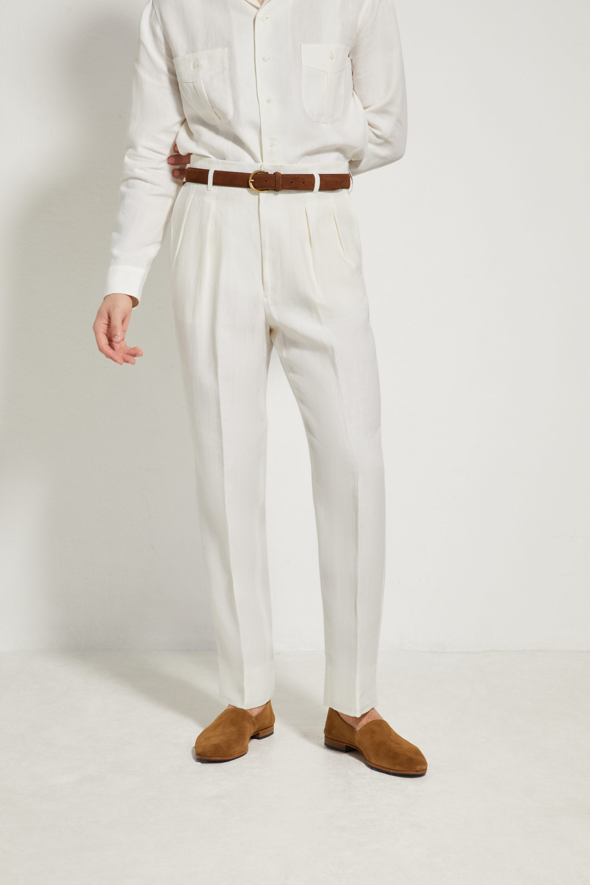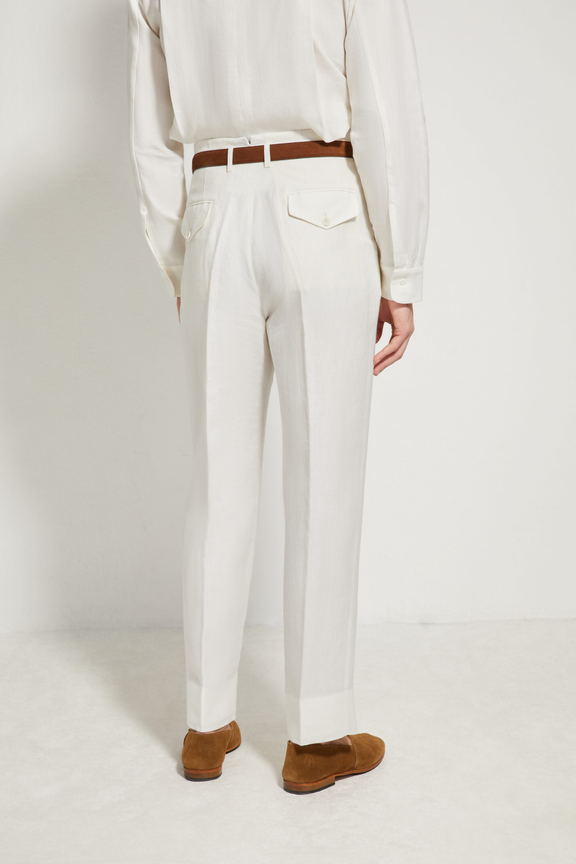 Our Hollywood trousers are inspired by American styles from the 1940s and 1950s. Characterized by the absence of a separate waistband, this unique construction extends the leg line all the way to the top, creating a sleek and uninterrupted silhouette. The pleats reach the very top of the waist, offering a refined look whether worn with or without a belt.