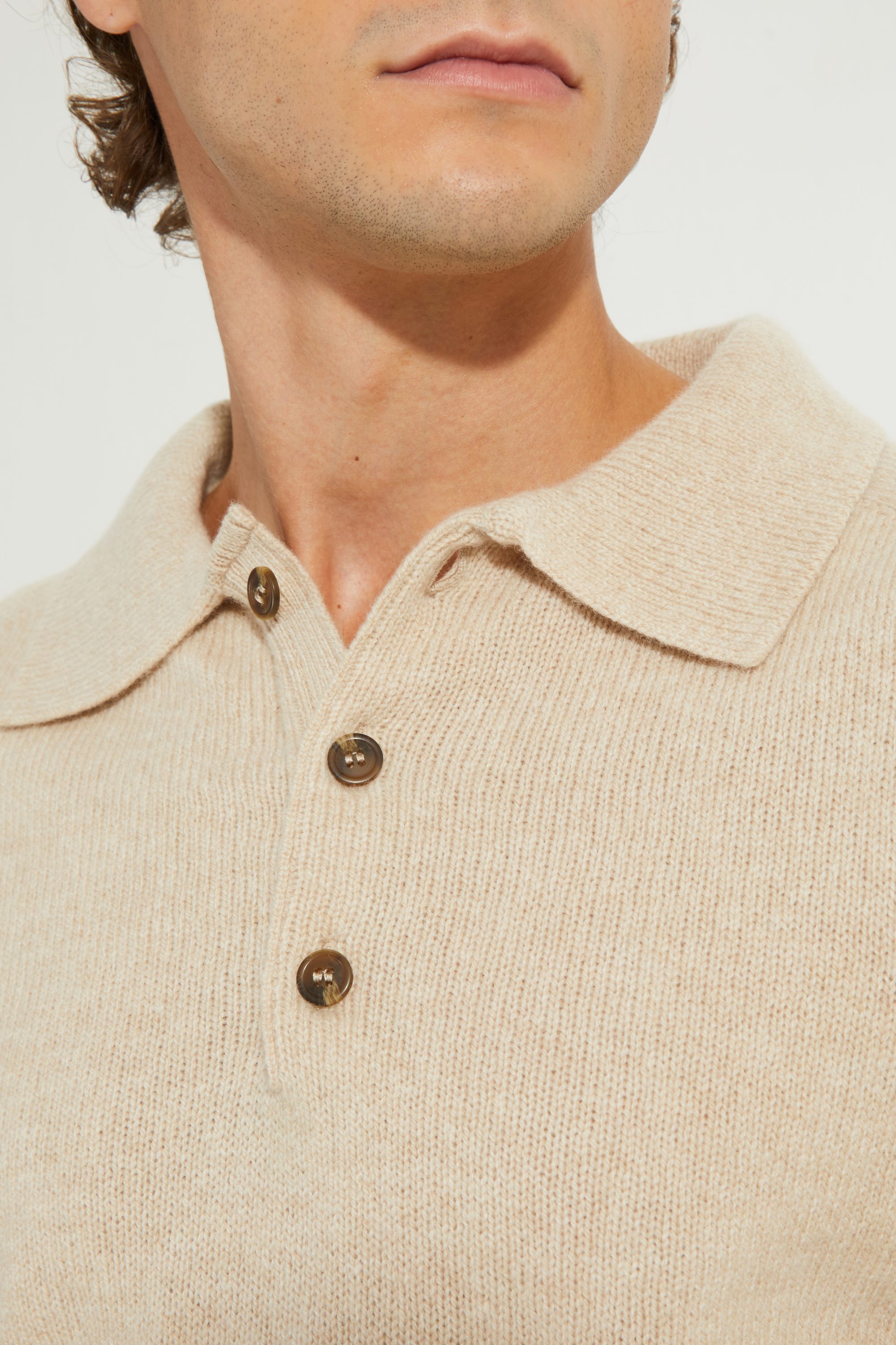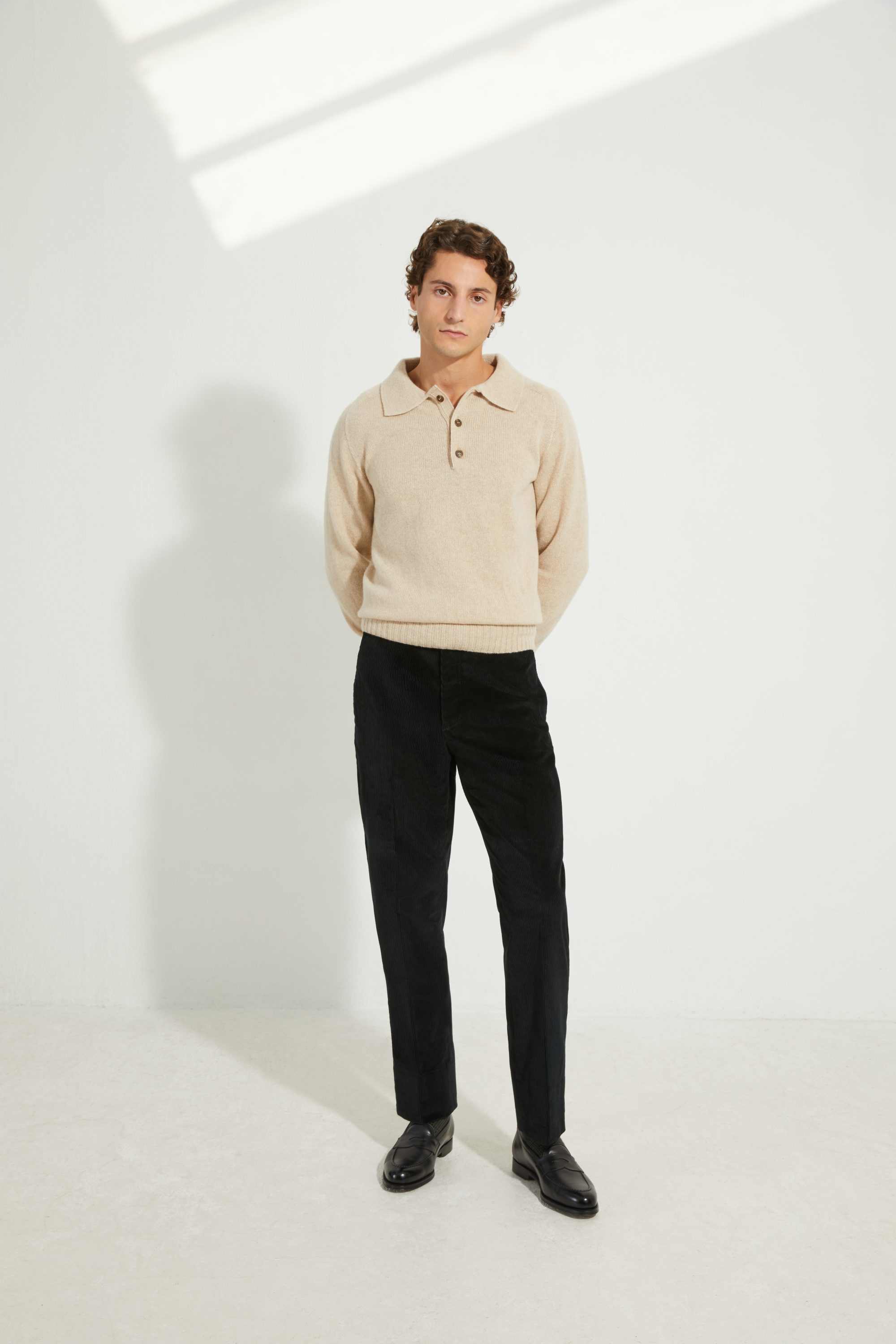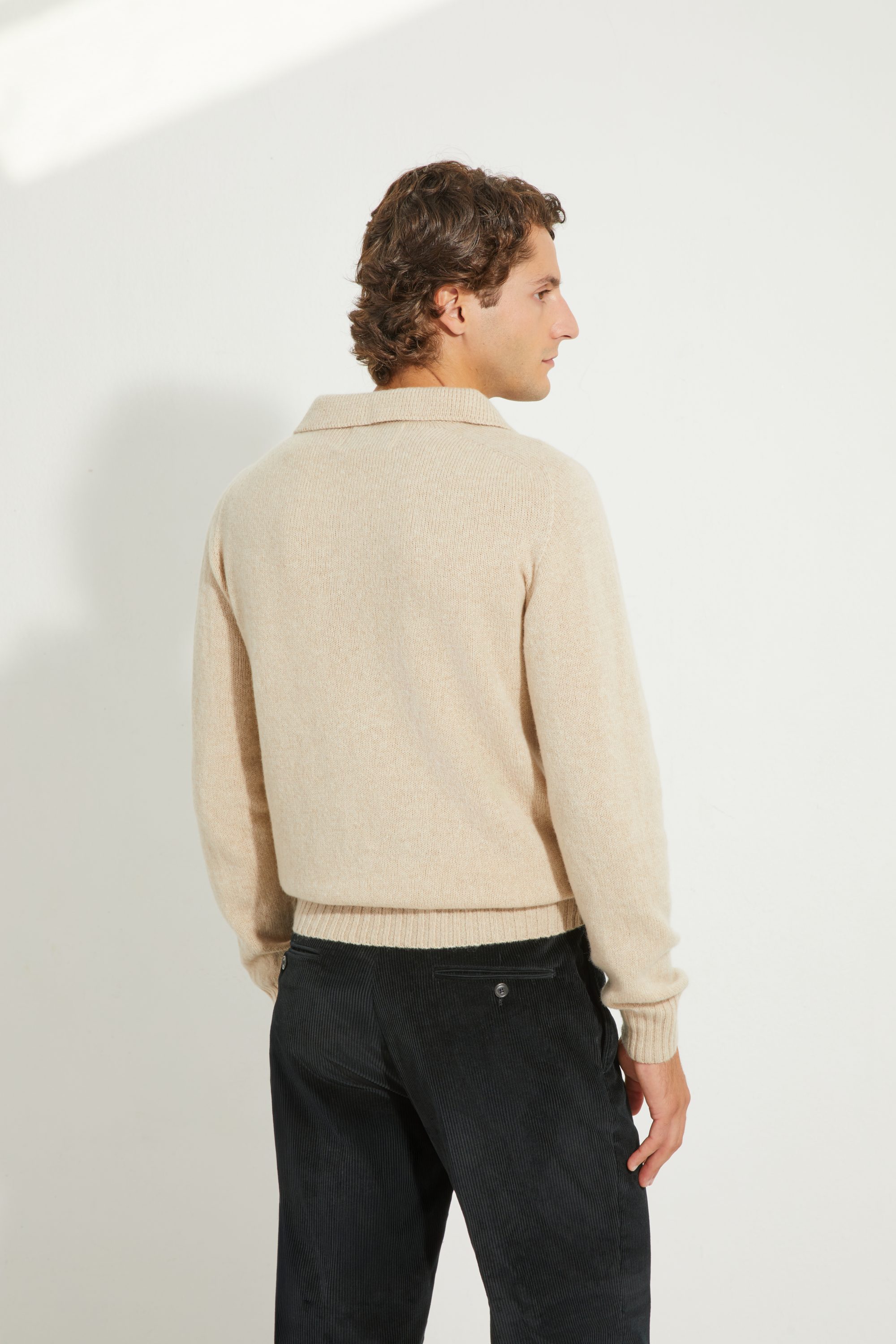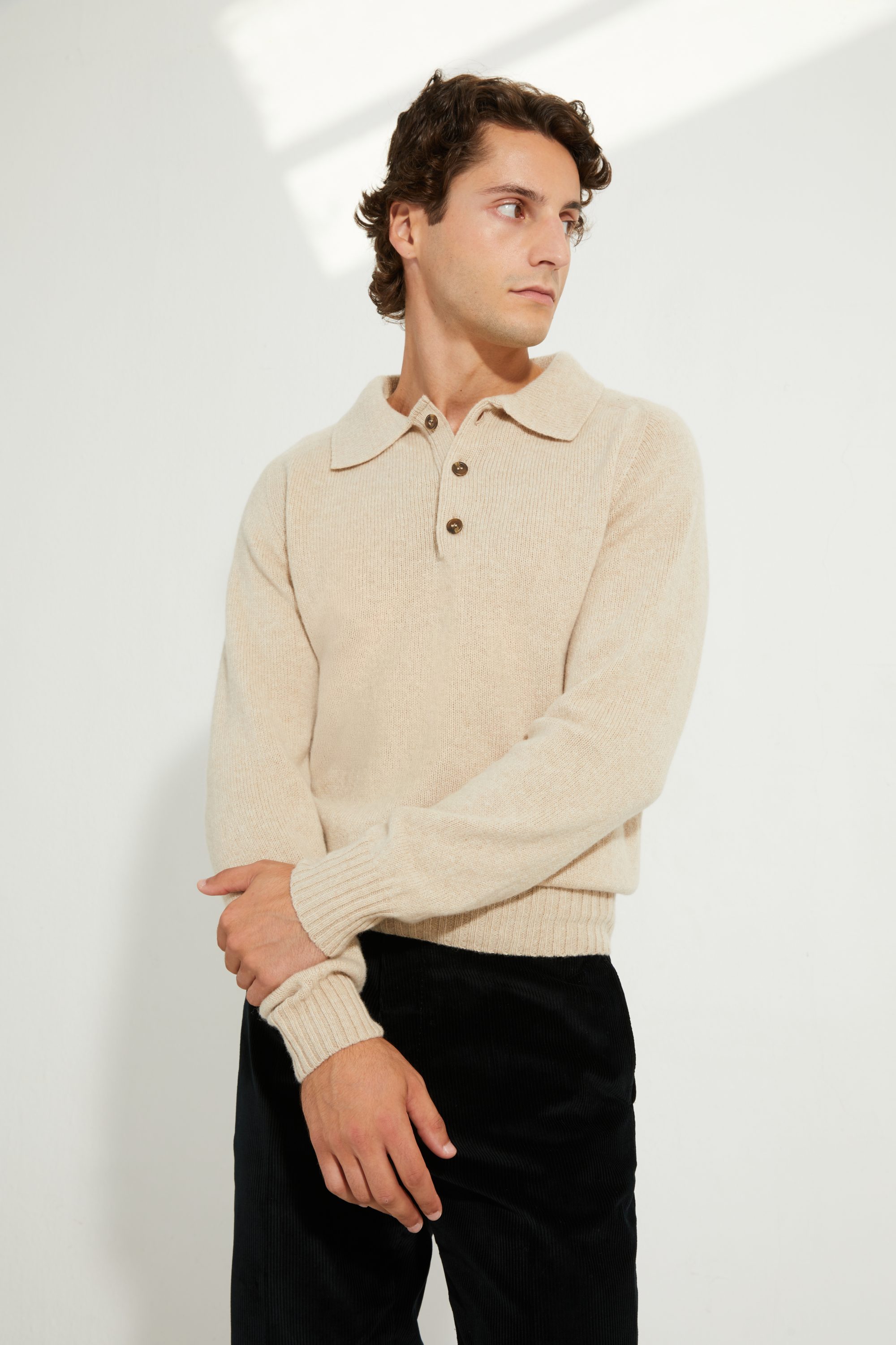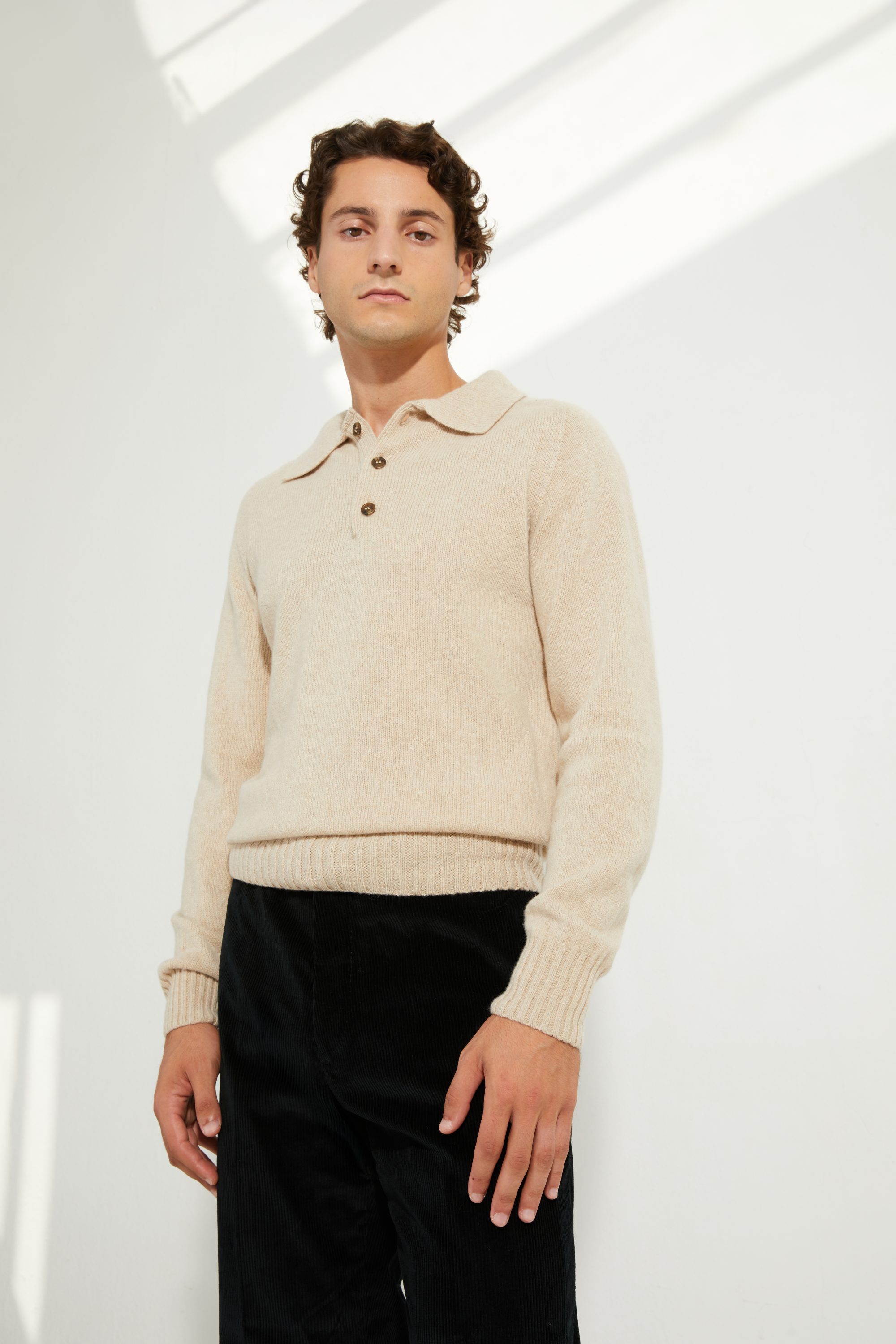 Our polo sweater in pure Shetland virgin wool, sourced from a Scottish mill.