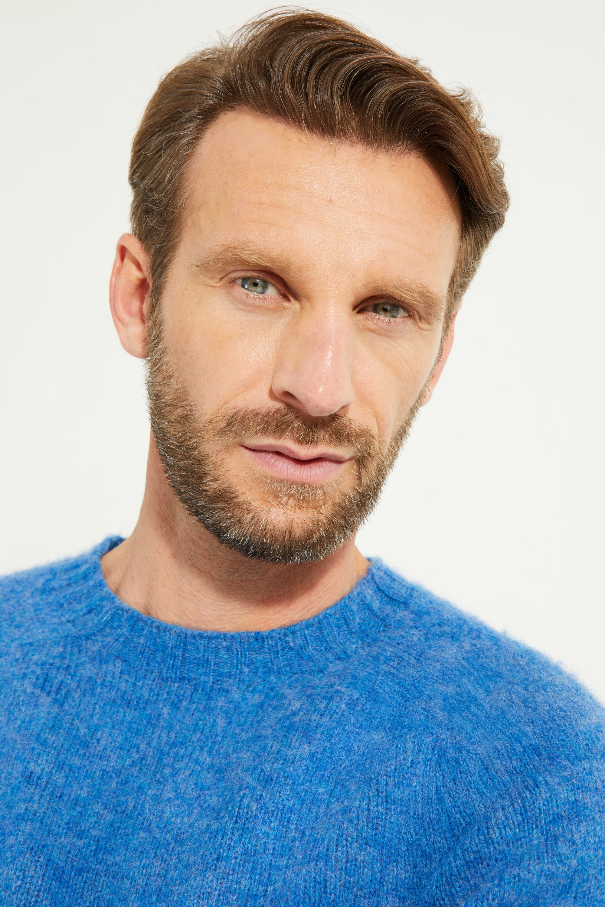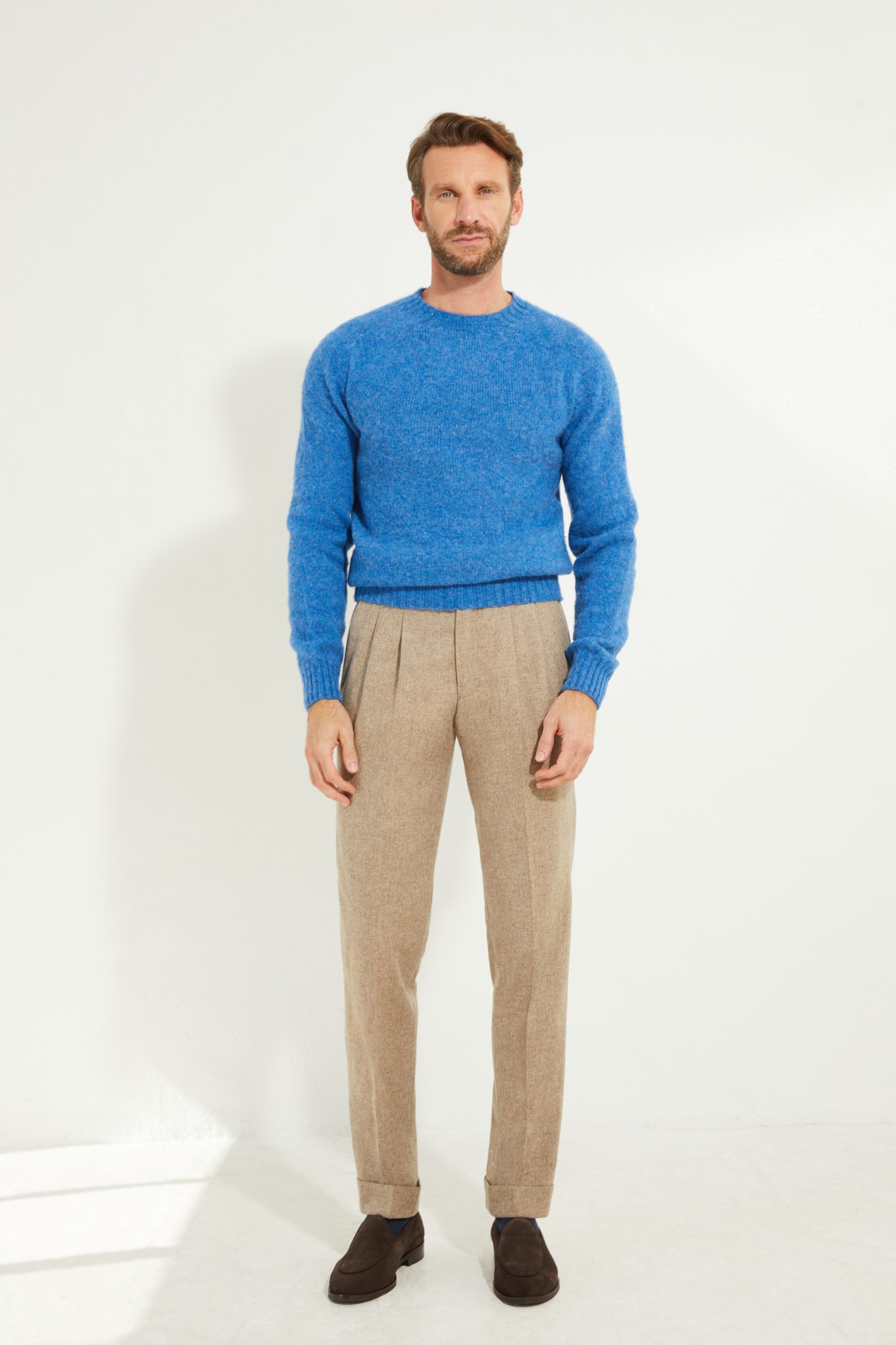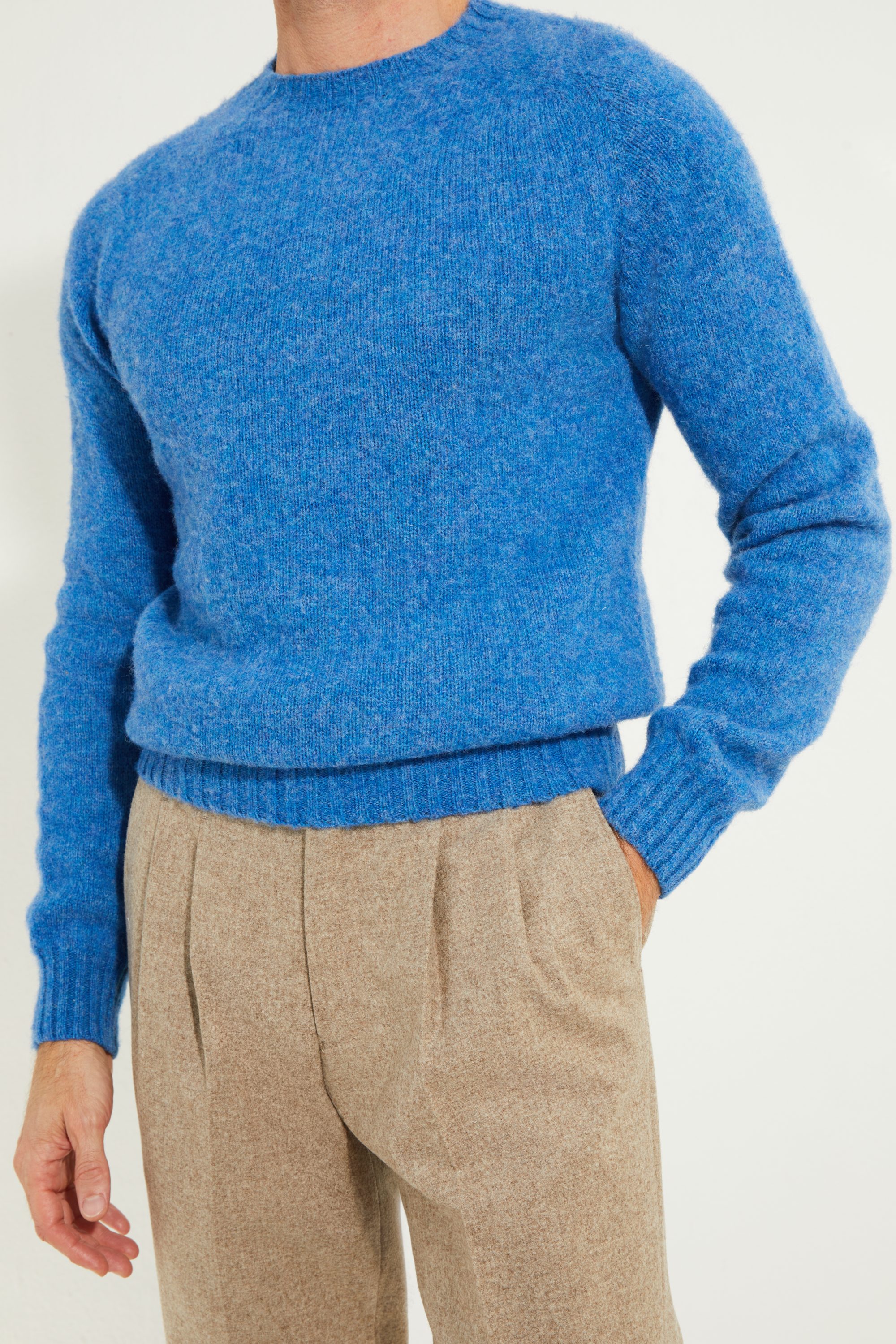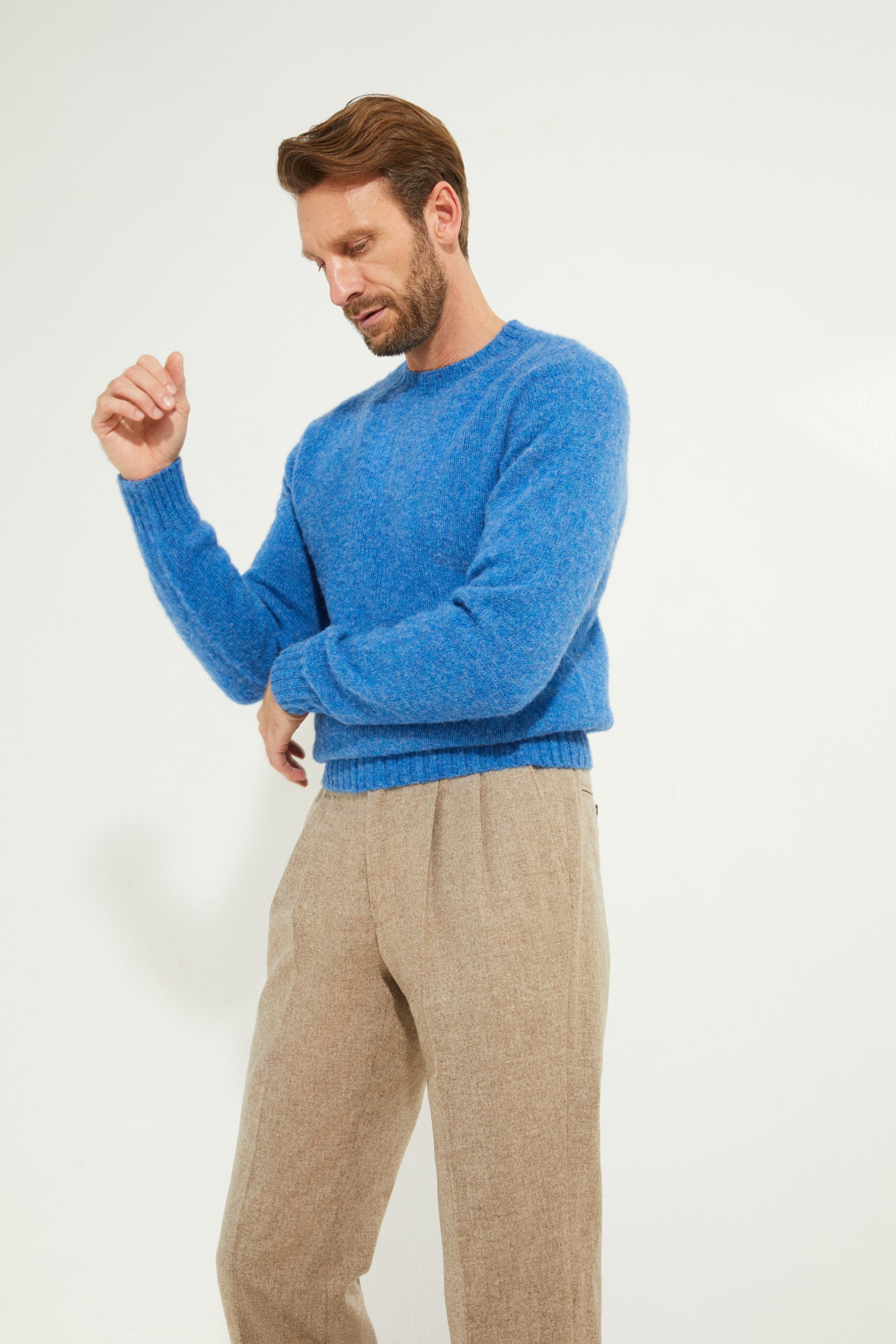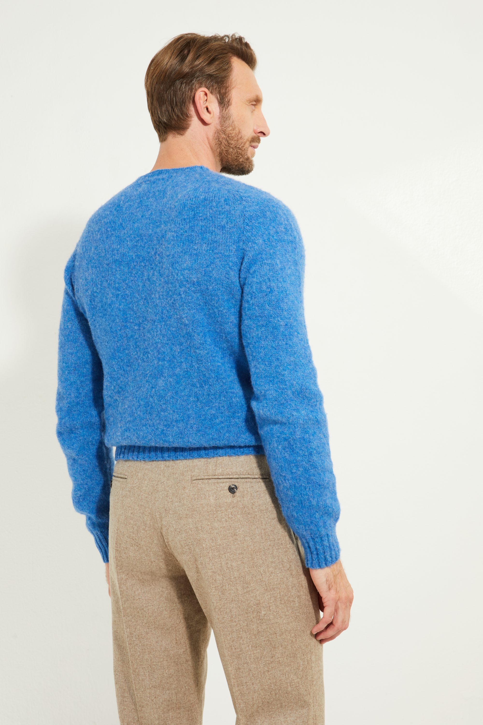 Our pure Shetland wool sweater, crafted from a Scottish mill, stands out for its unique finish, brushed with natural teasels to give it a soft, fuzzy texture. The wool is gentle to the touch while retaining the durability of Shetland yarn.