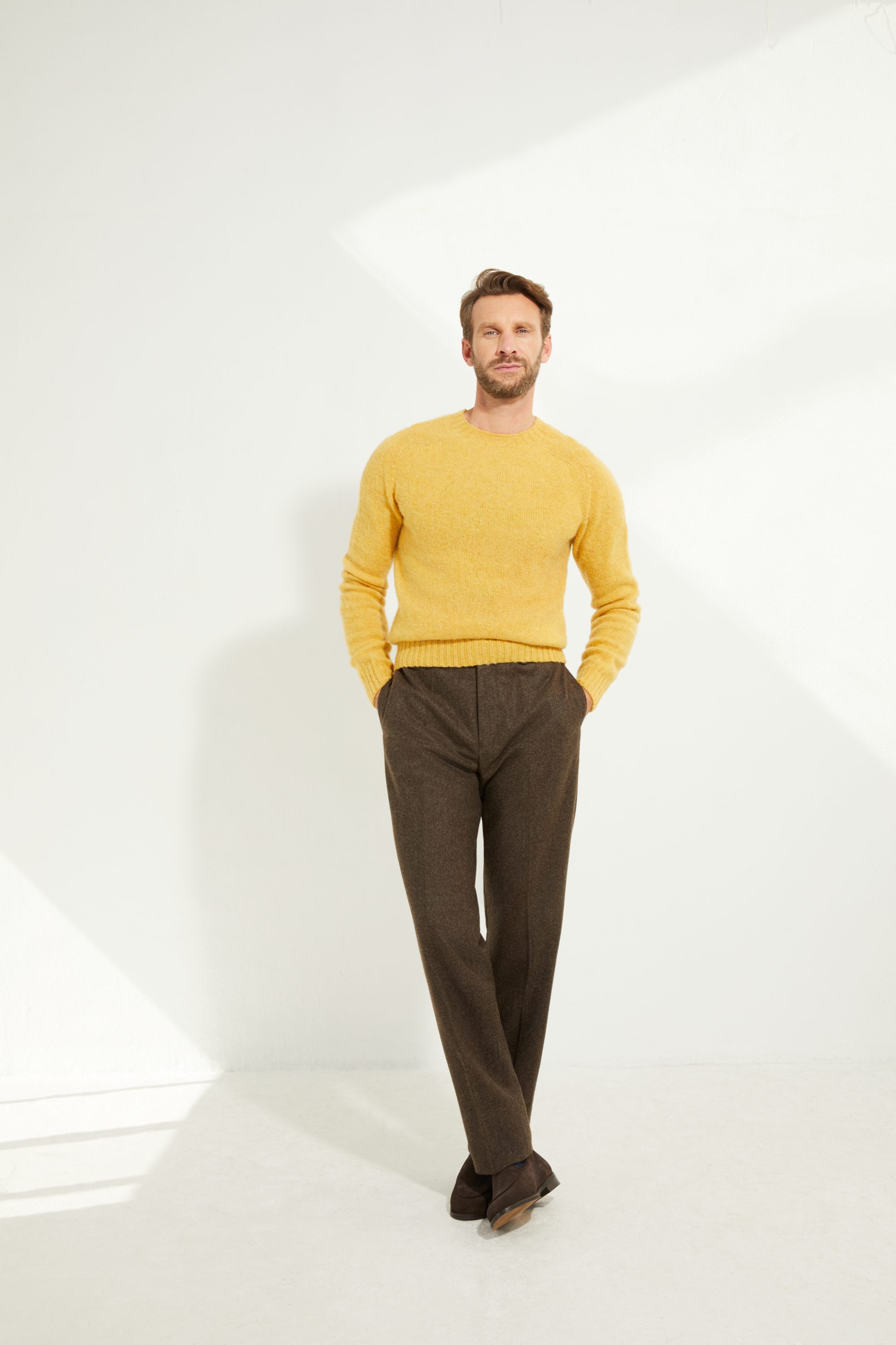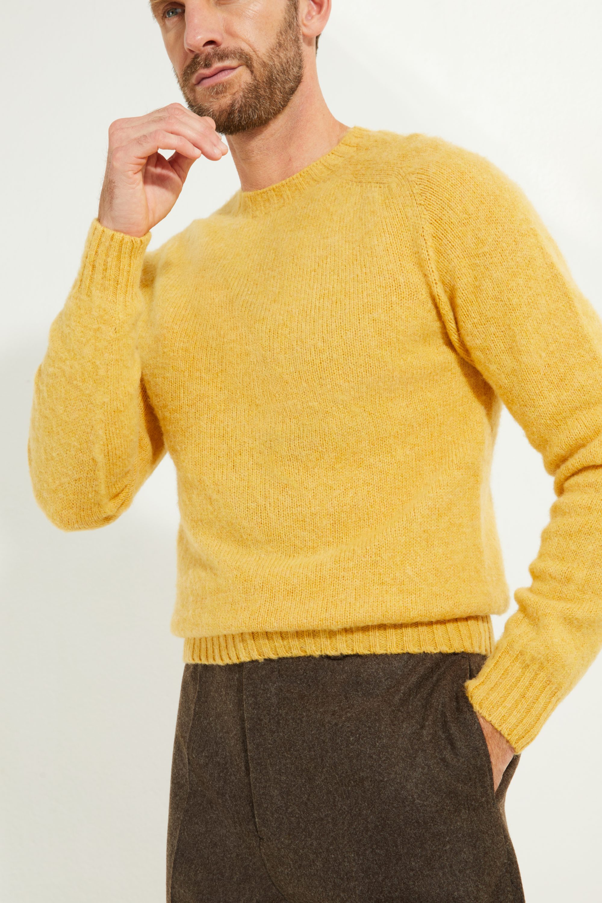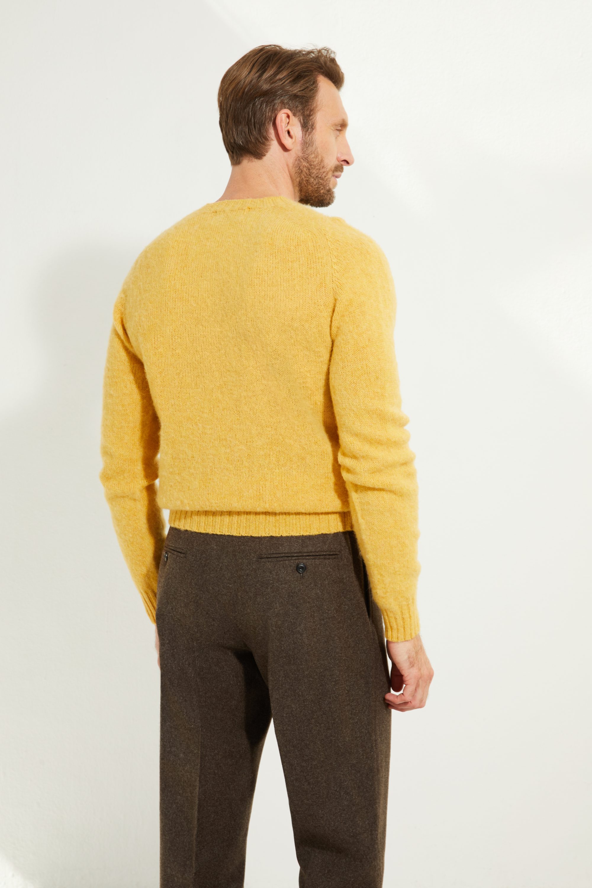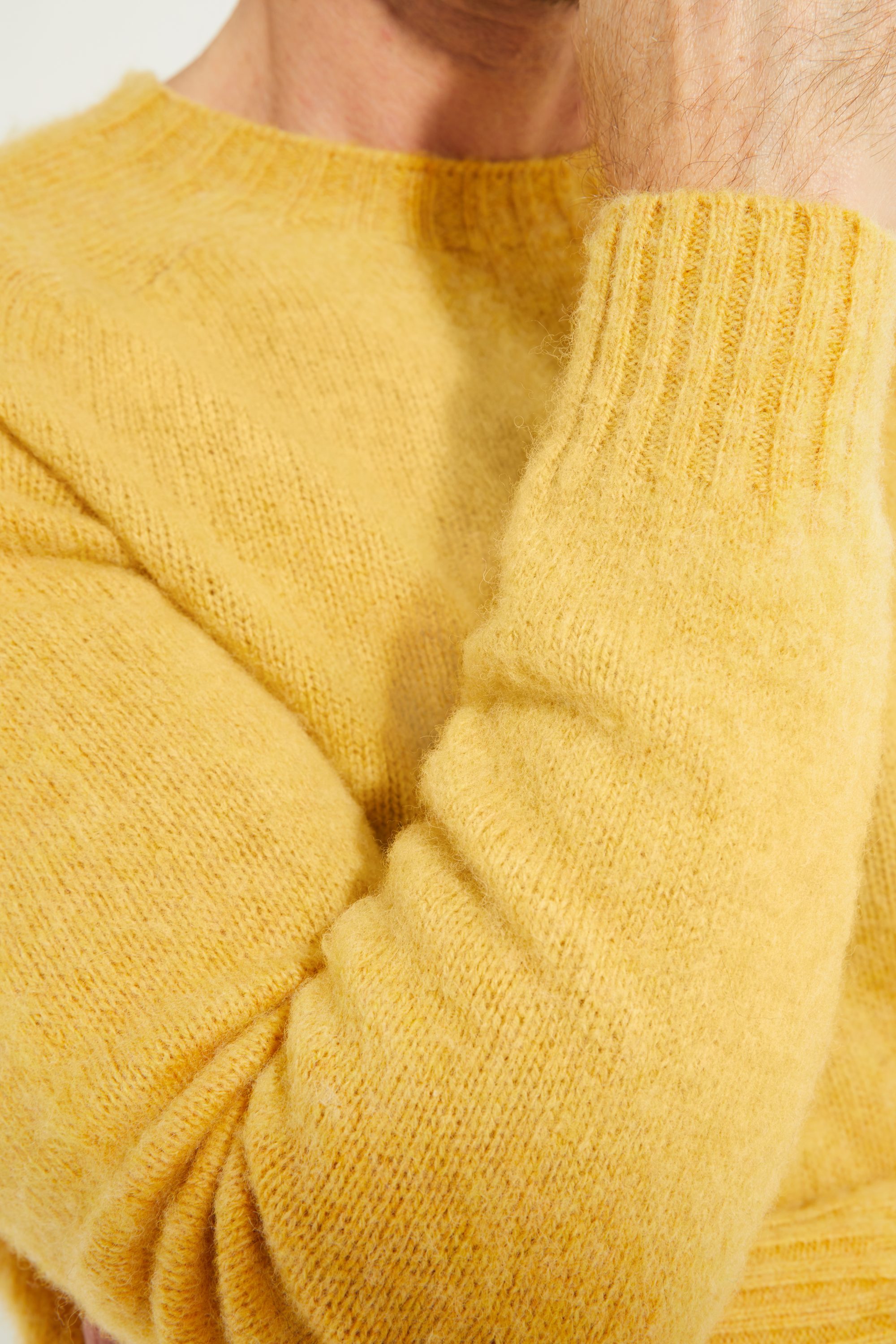 Our pure Shetland wool sweater, crafted from a Scottish mill, stands out for its unique finish, brushed with natural teasels to give it a soft, fuzzy texture. The wool is gentle to the touch while retaining the durability of Shetland yarn.