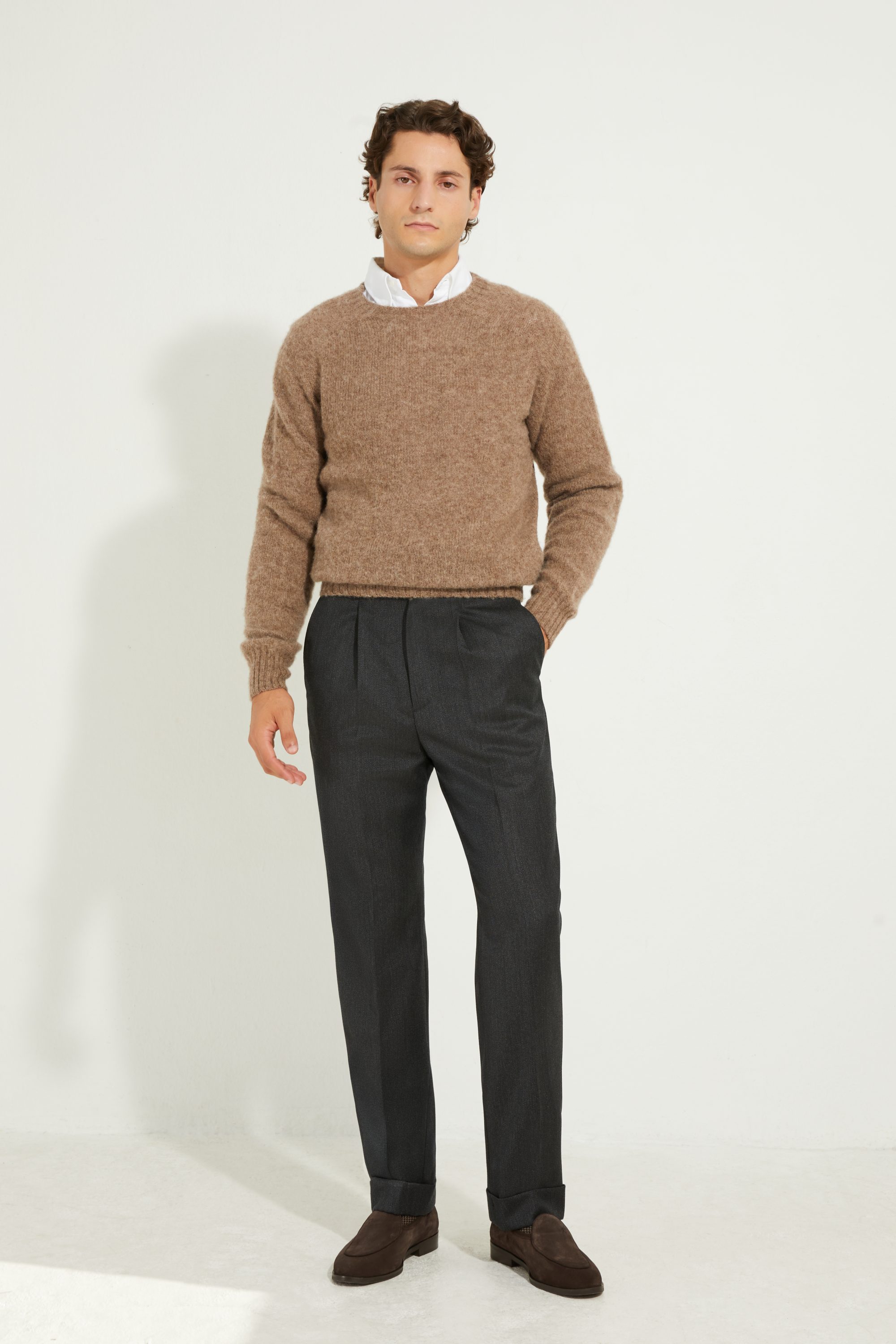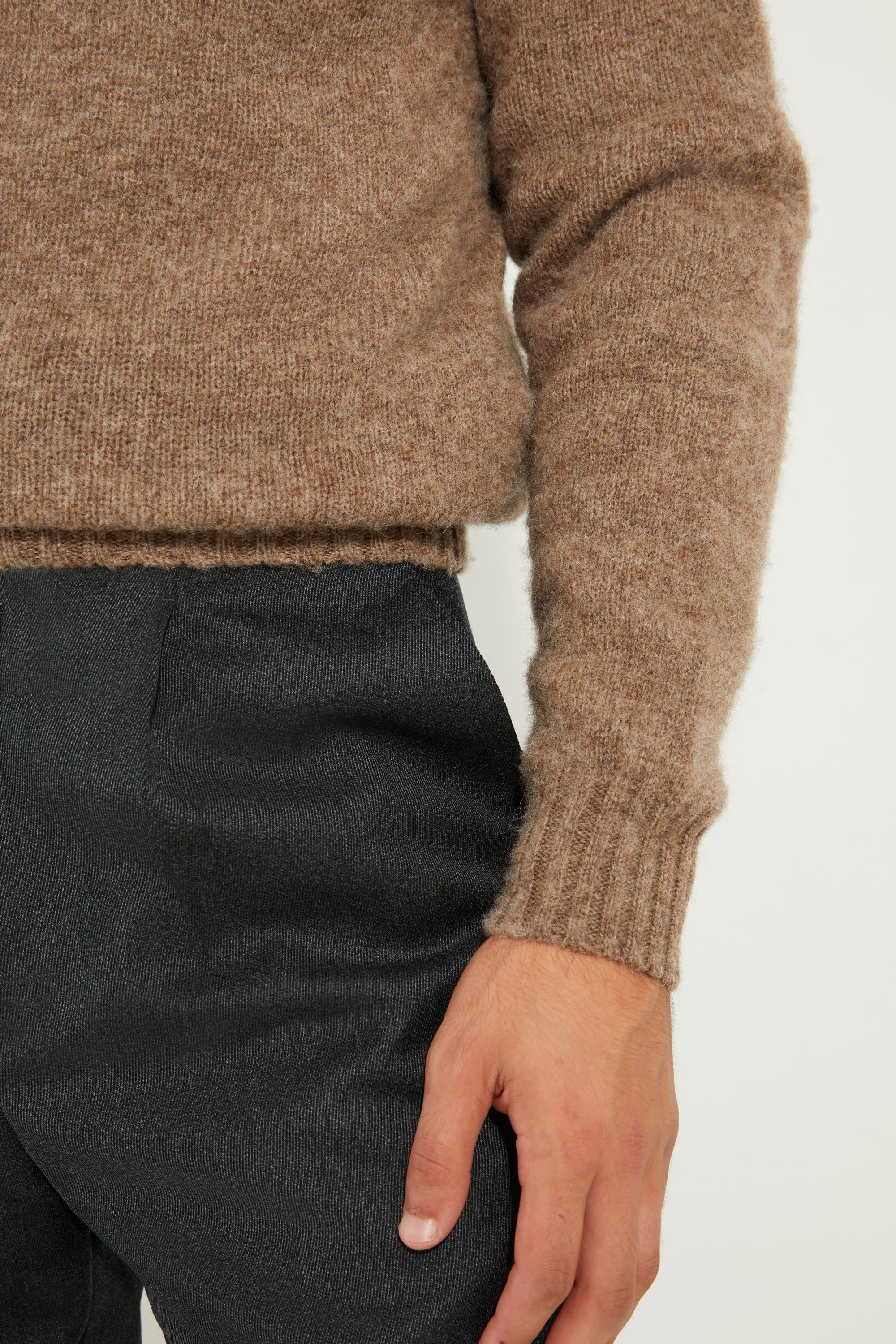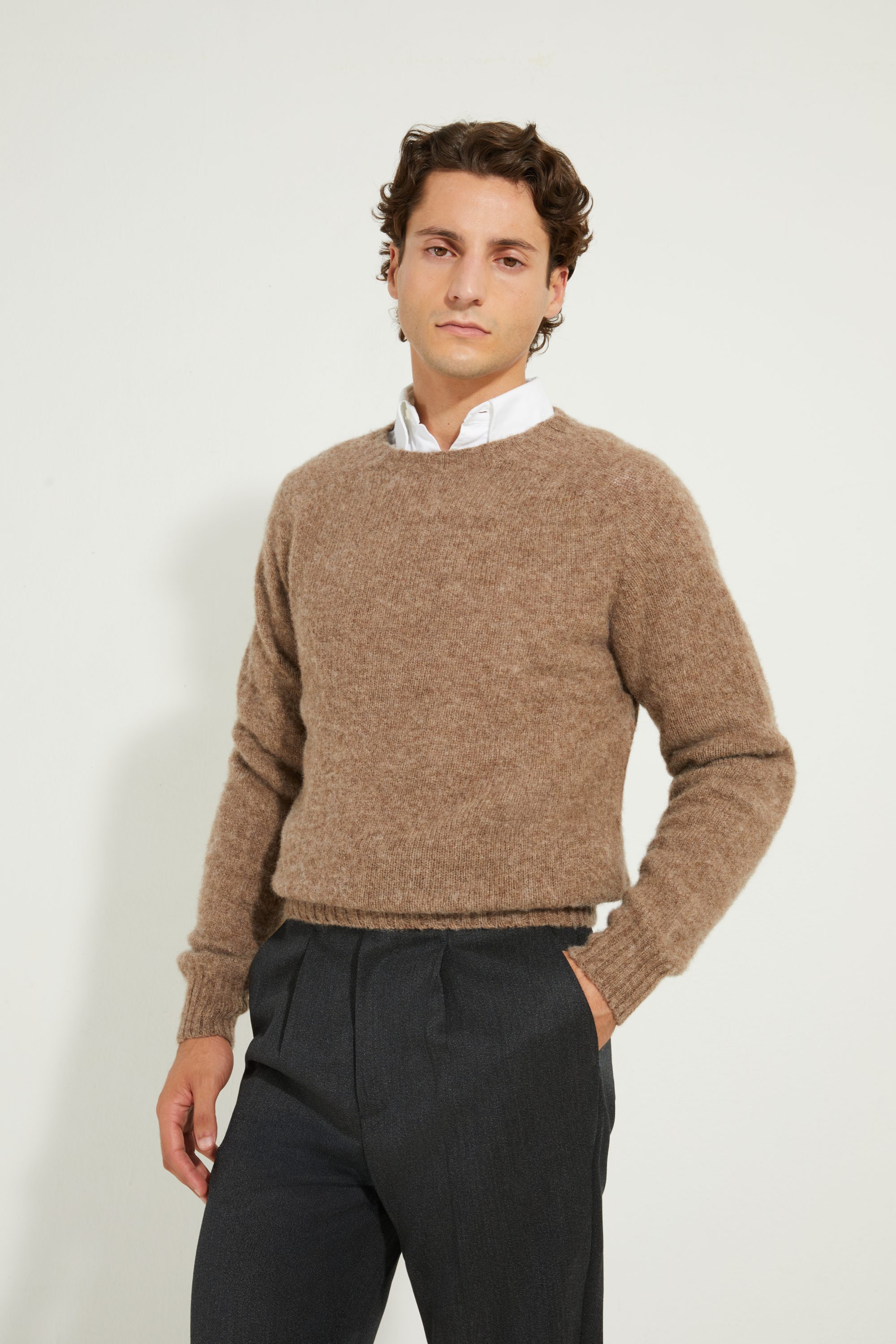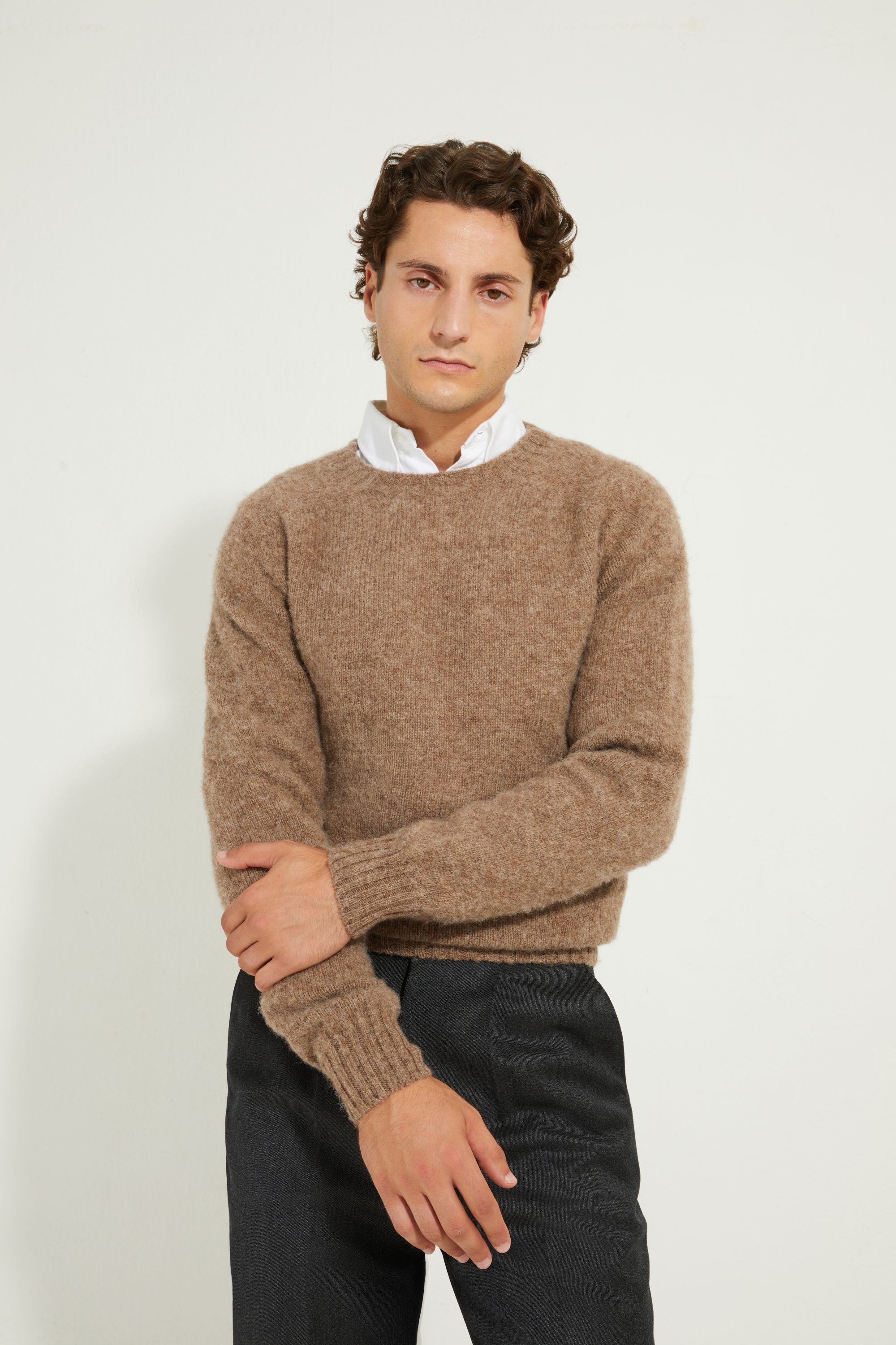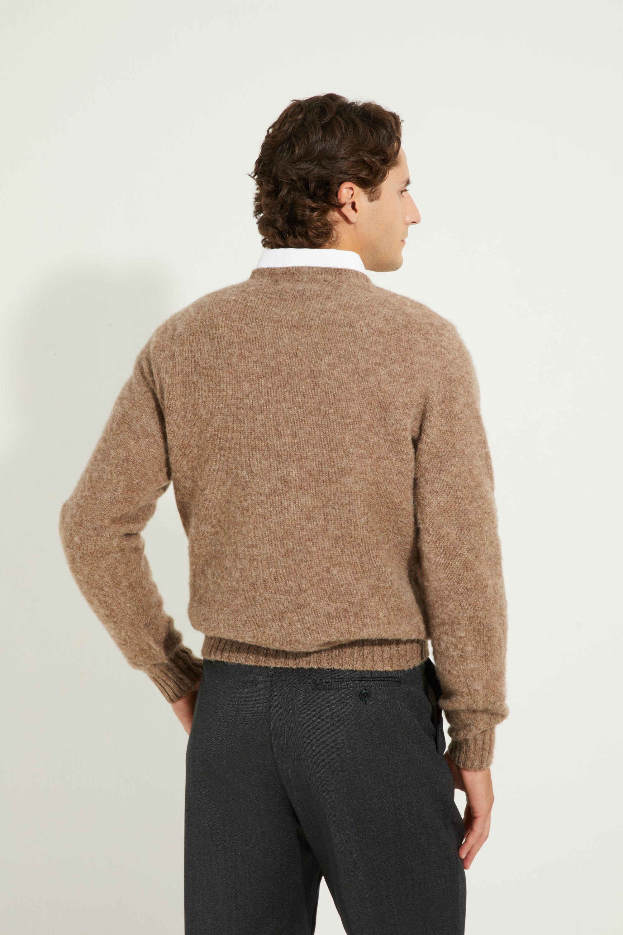 Our pure Shetland wool sweater, crafted from a Scottish mill, stands out for its unique finish, brushed with natural teasels to give it a soft, fuzzy texture. The wool is gentle to the touch while retaining the durability of Shetland yarn.