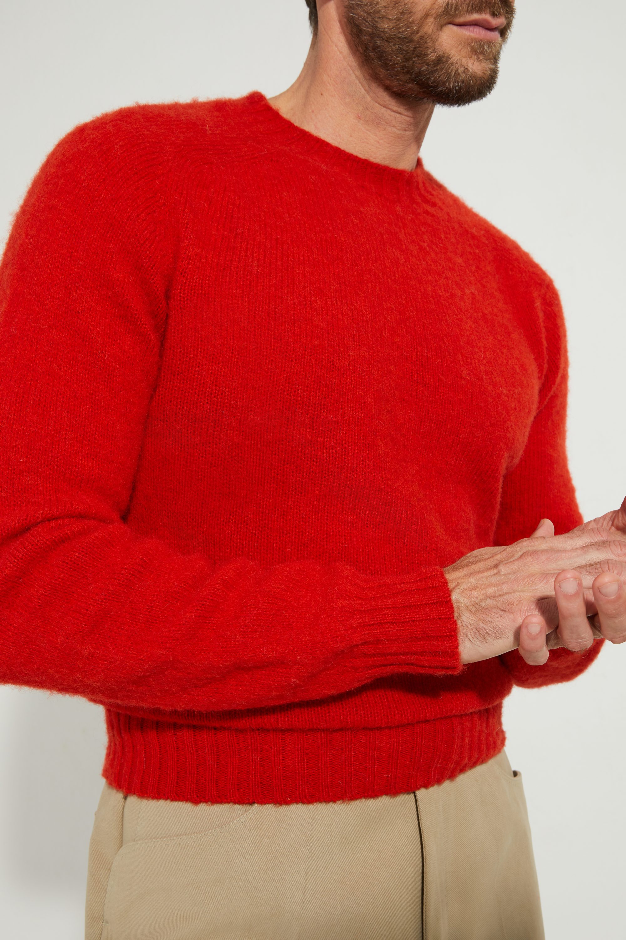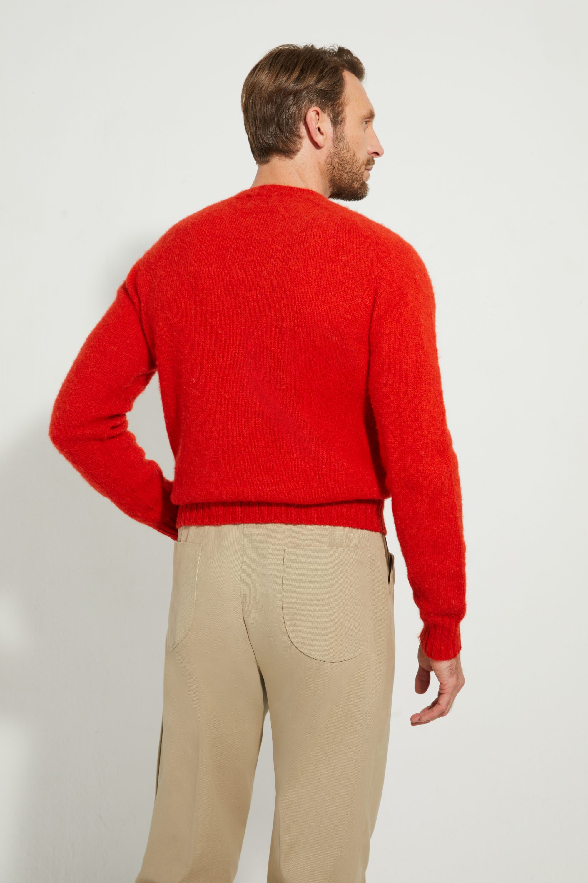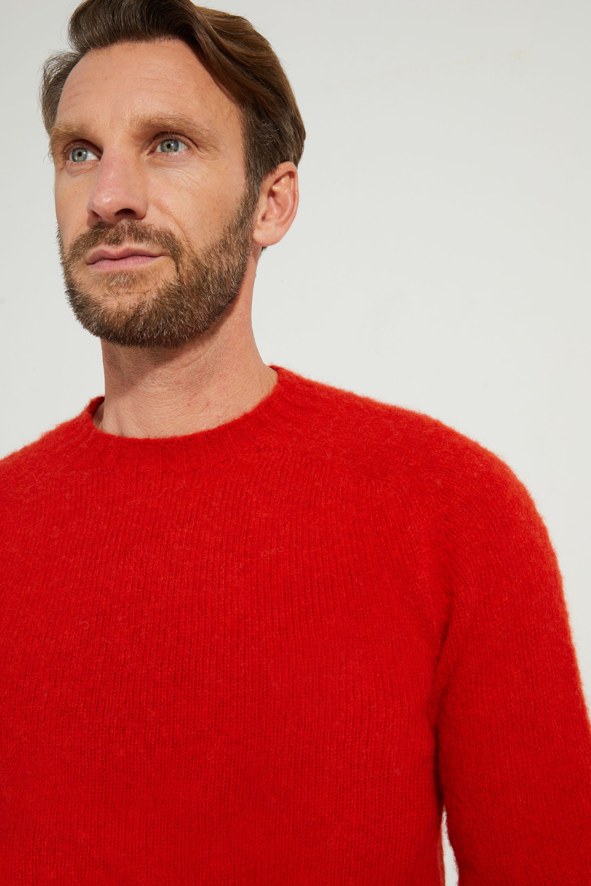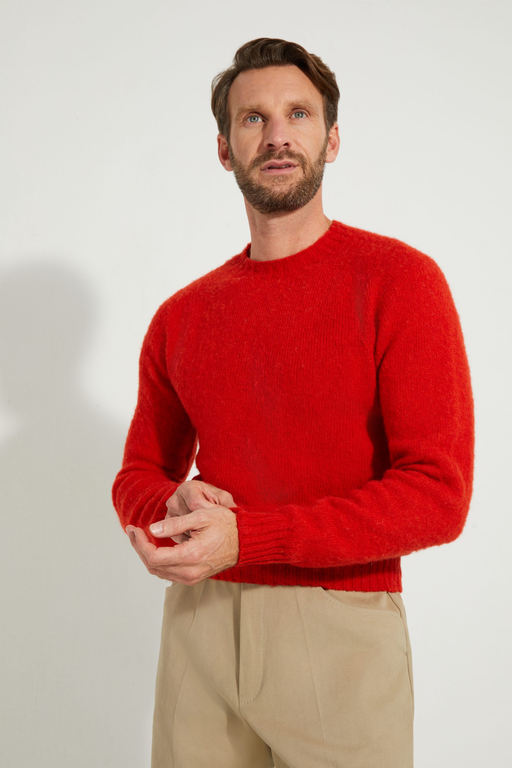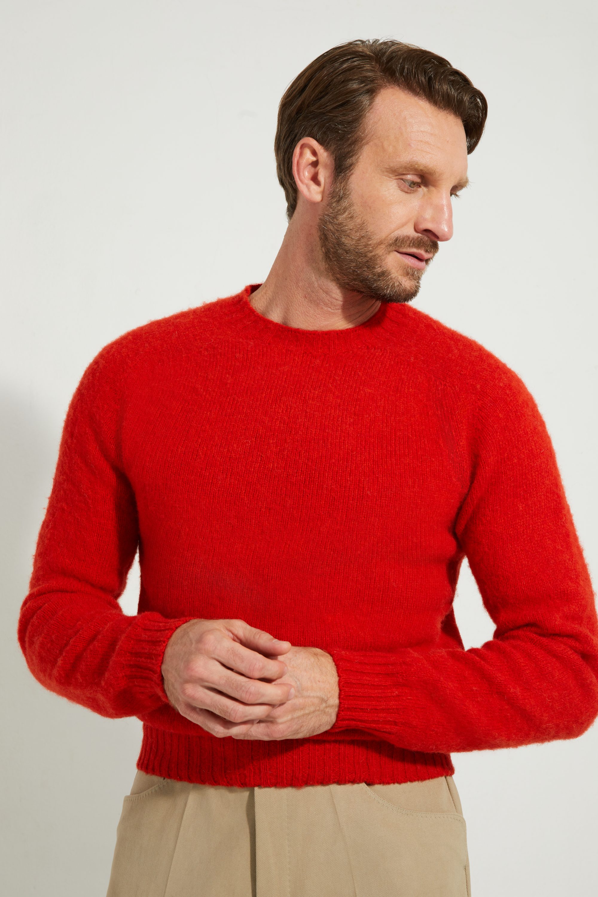 Our pure Shetland wool sweater, crafted from a Scottish mill, stands out for its unique finish, brushed with natural teasels to give it a soft, fuzzy texture. The wool is gentle to the touch while retaining the durability of Shetland yarn.
