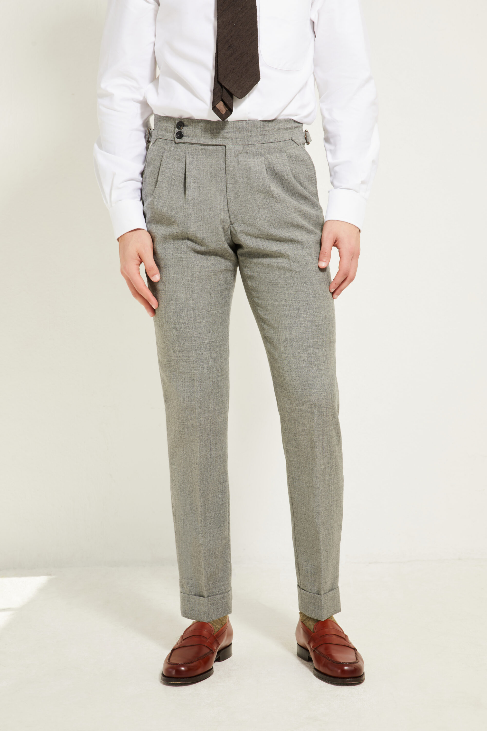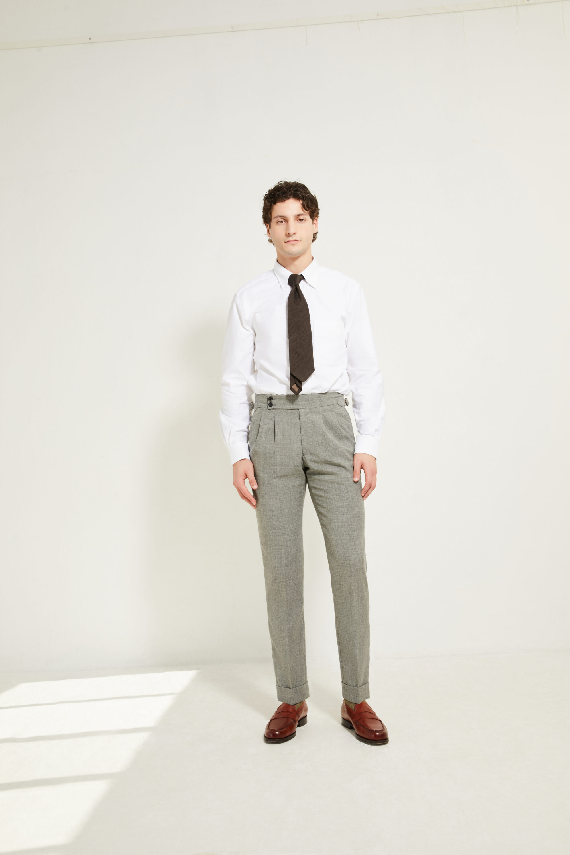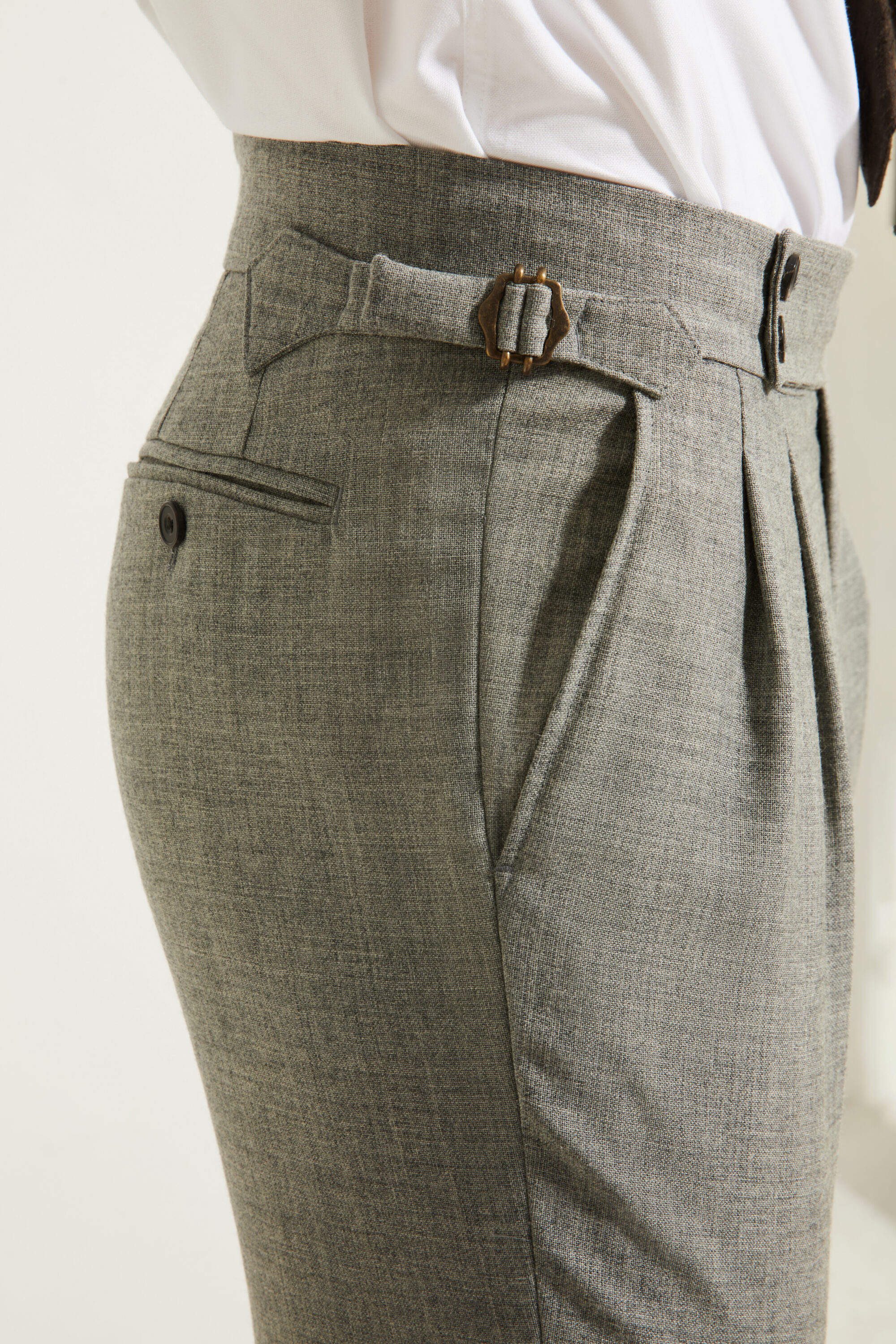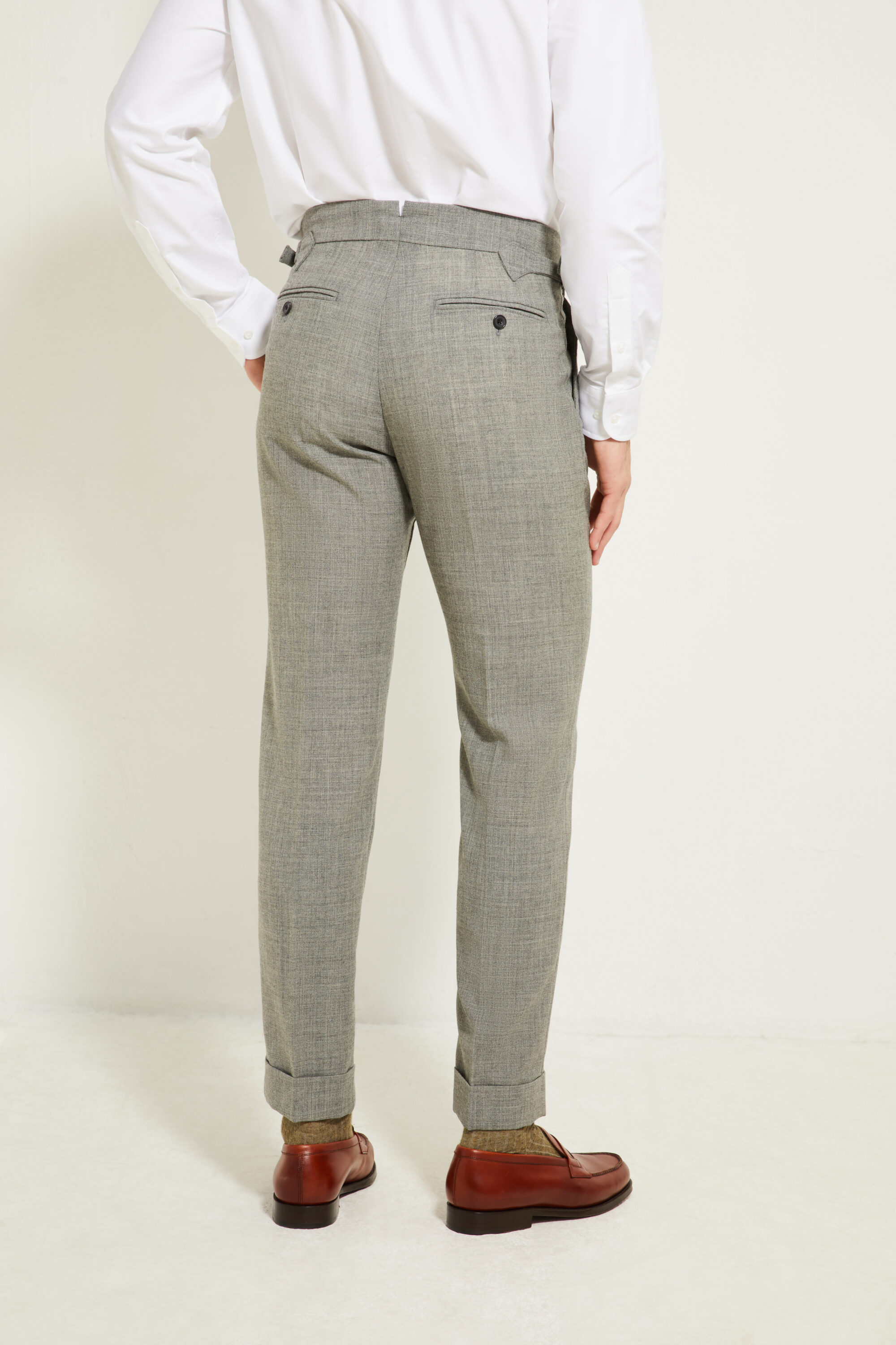Notre pantalon adopte une coupe ajustée, inspirée du style italien : une ligne plus proche de la jambe, fuselée, nette et élégante, pensée pour accompagner une silhouette contemporaine tout en restant sartoriale.