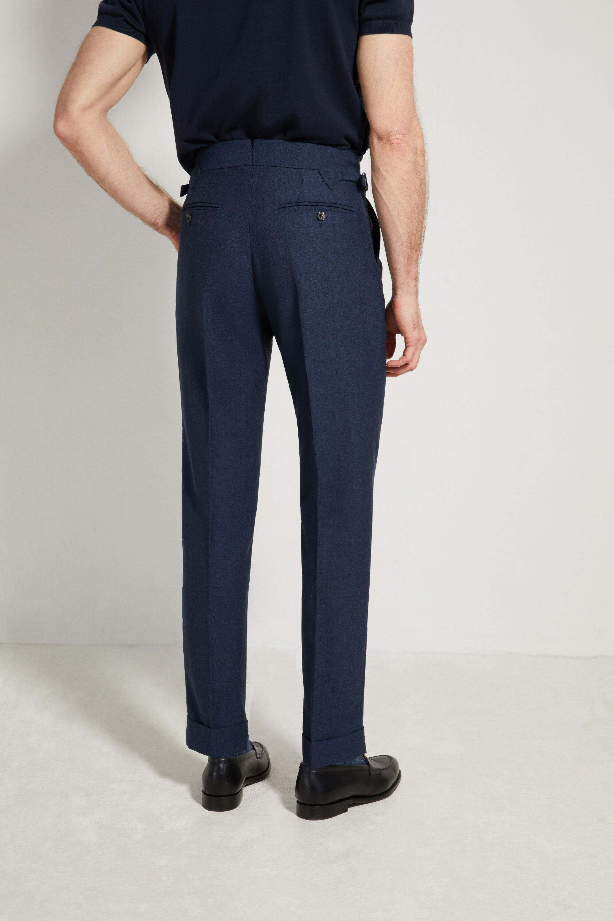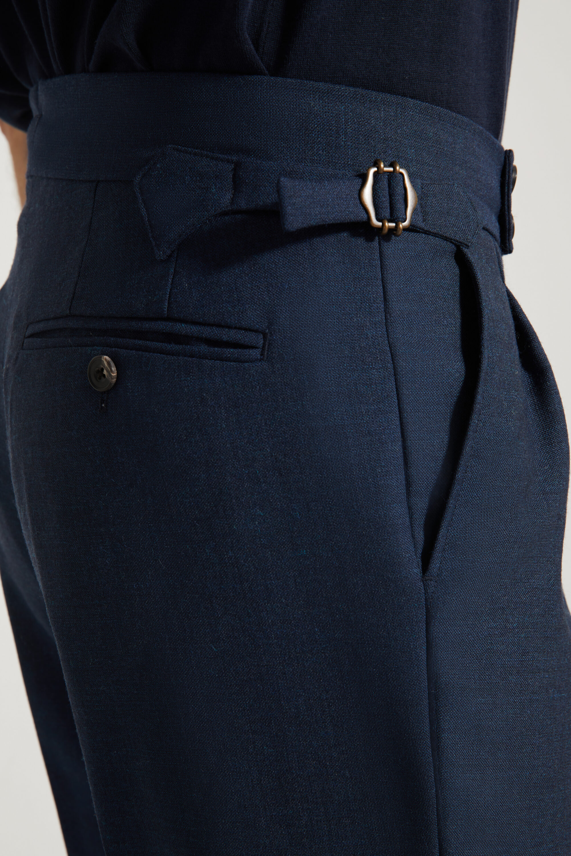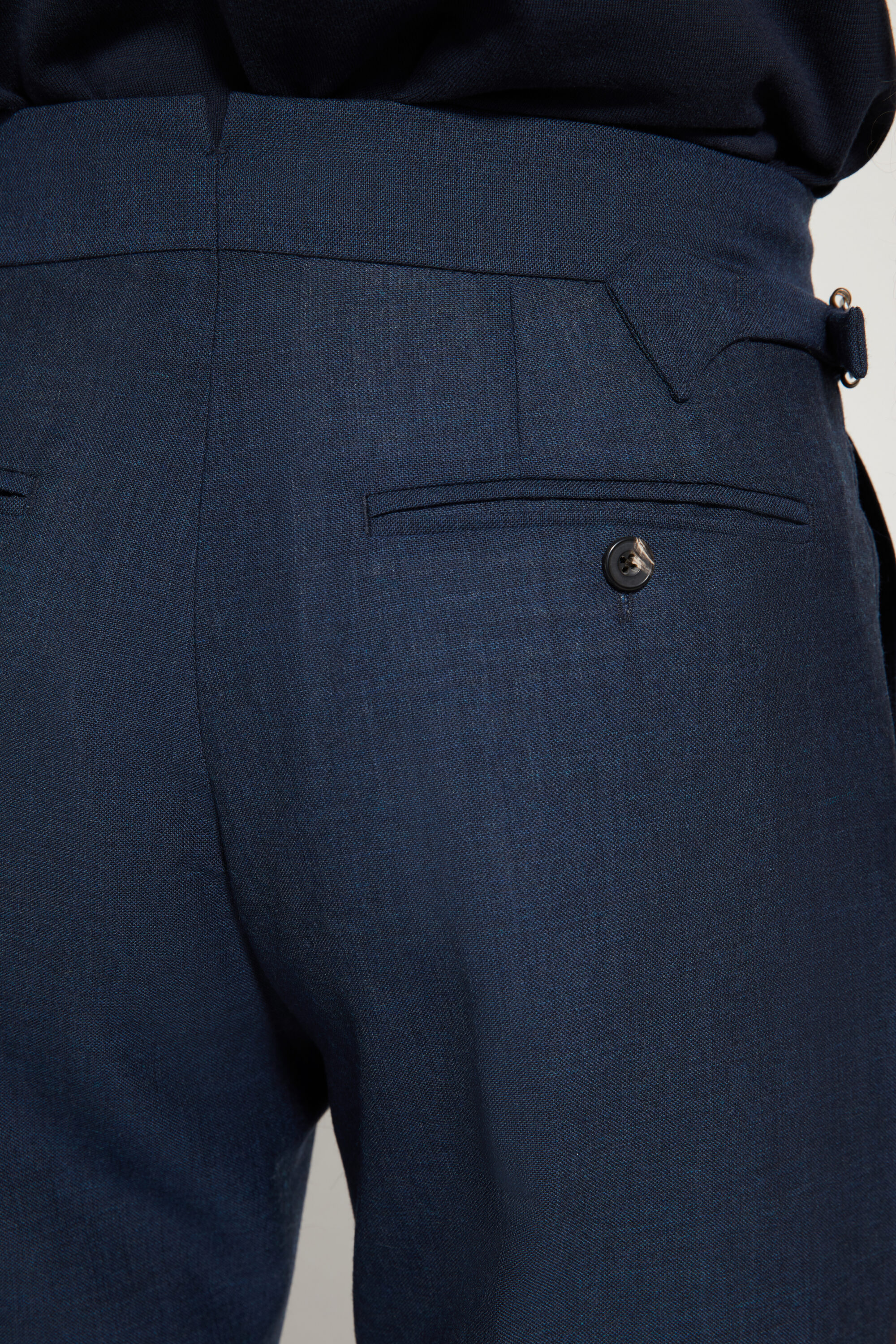 •⁠ ⁠Deux poches arrière passepoilées, fermées par boutons en corne véritable