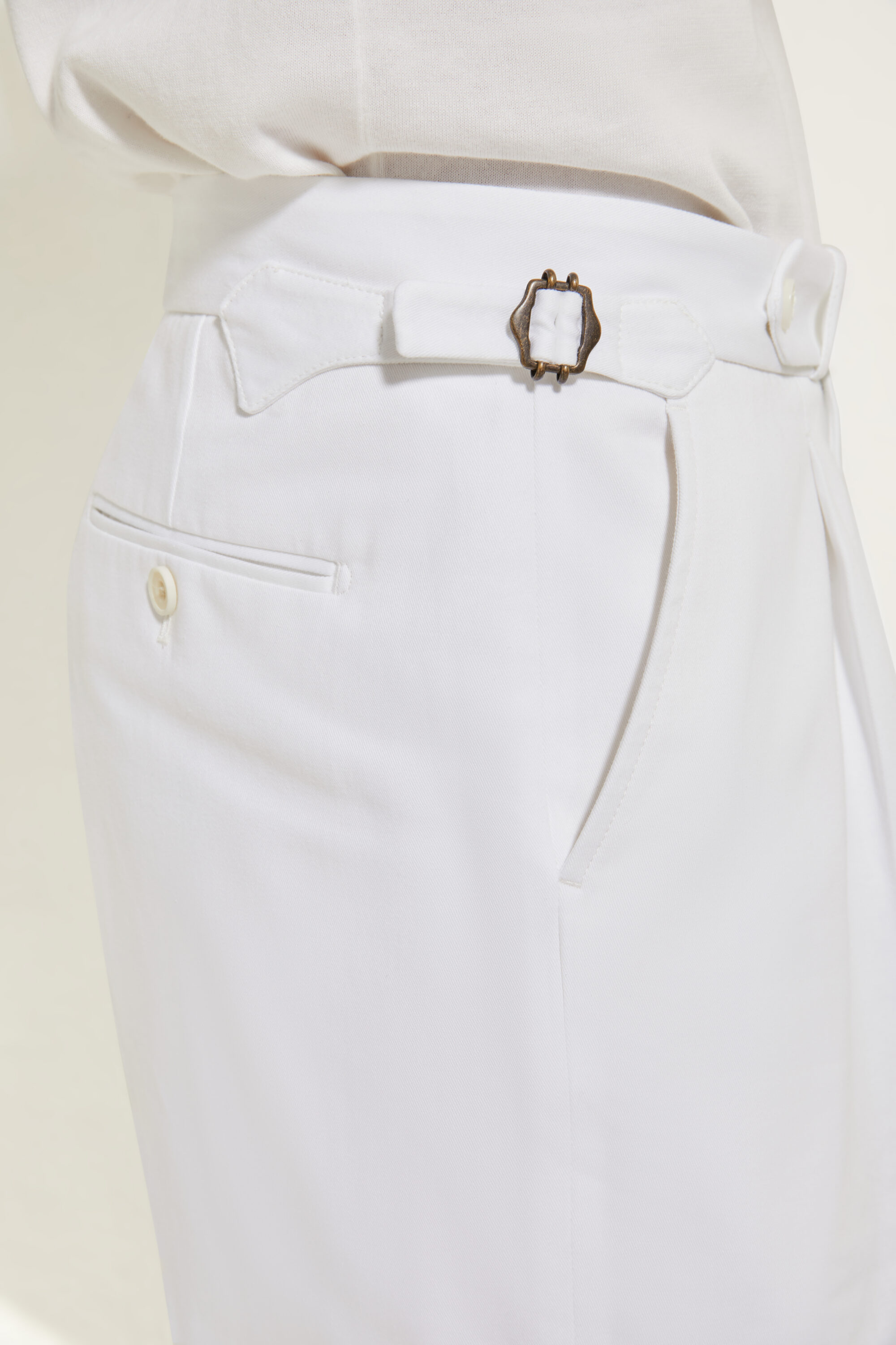 Fabriqué dans un coton sergé italien, ce pantalon est conçu pour être porté pendant les saisons les plus chaudes.