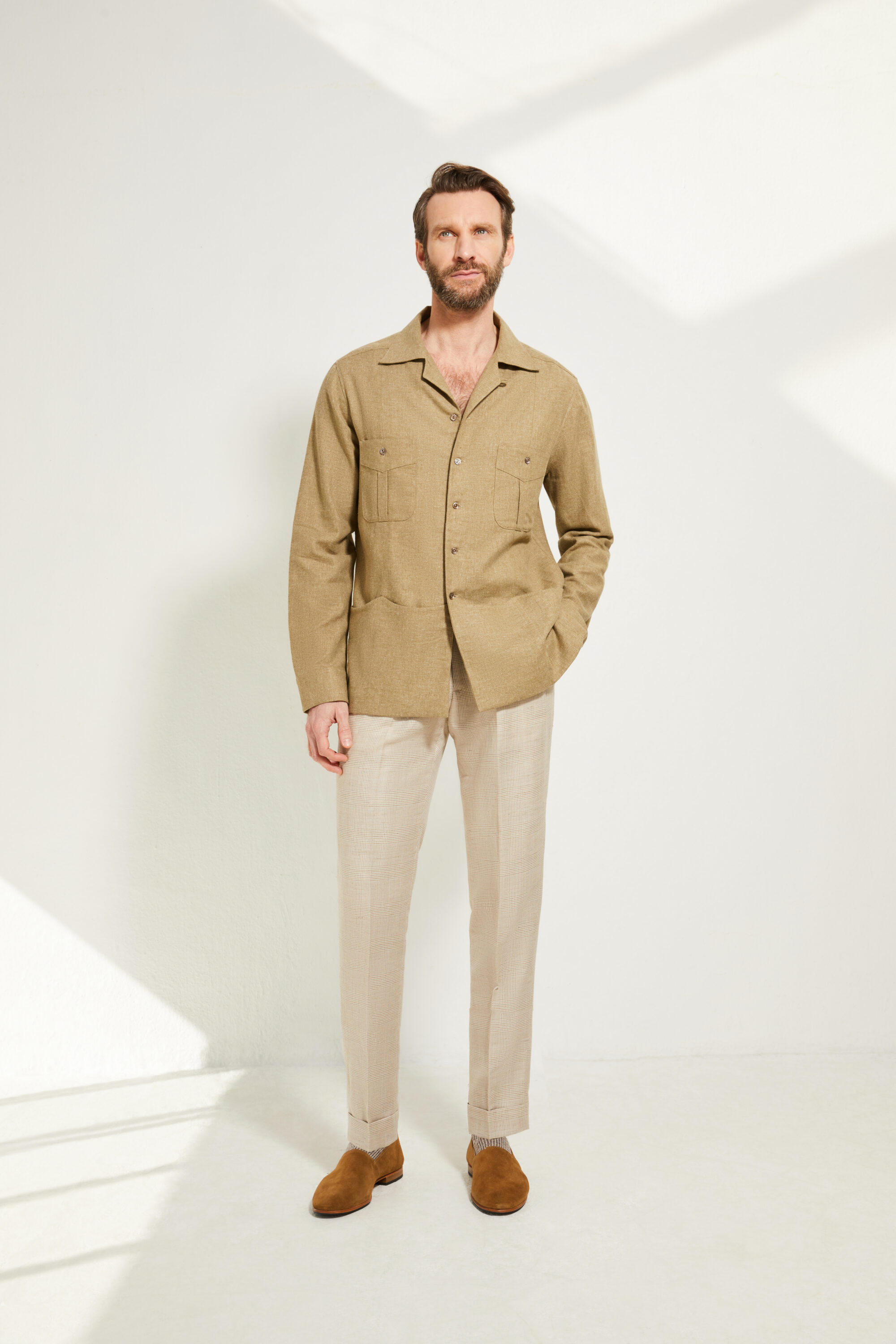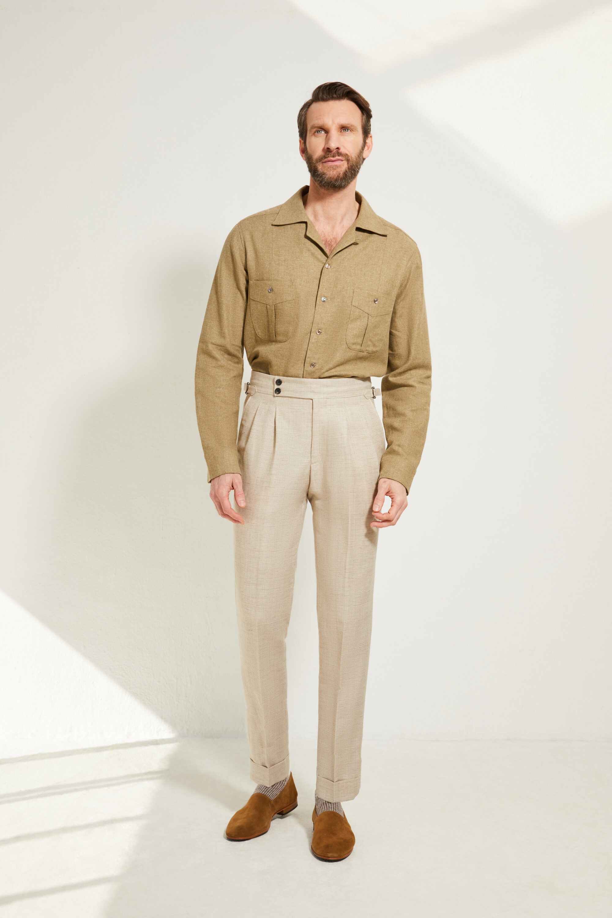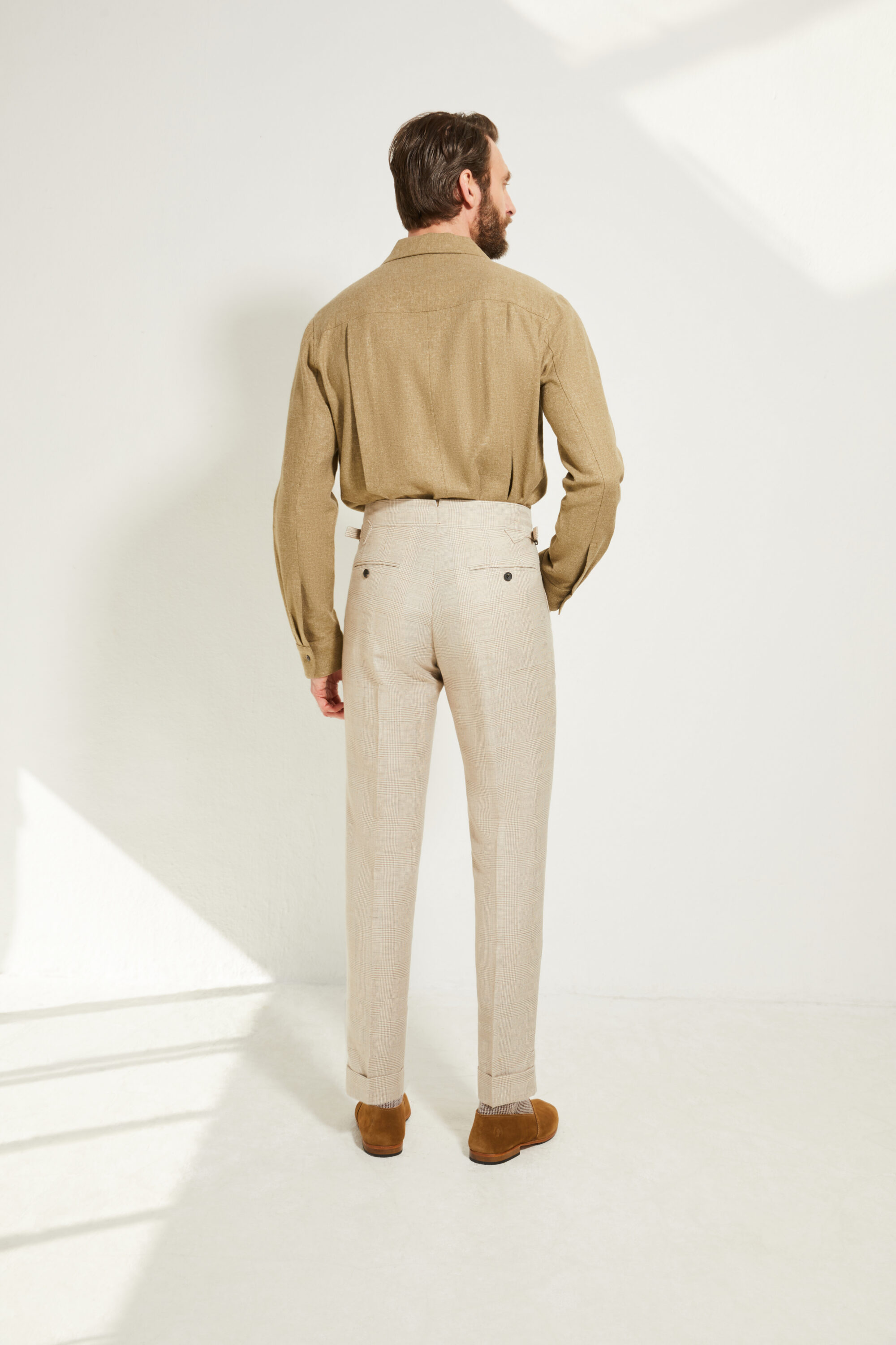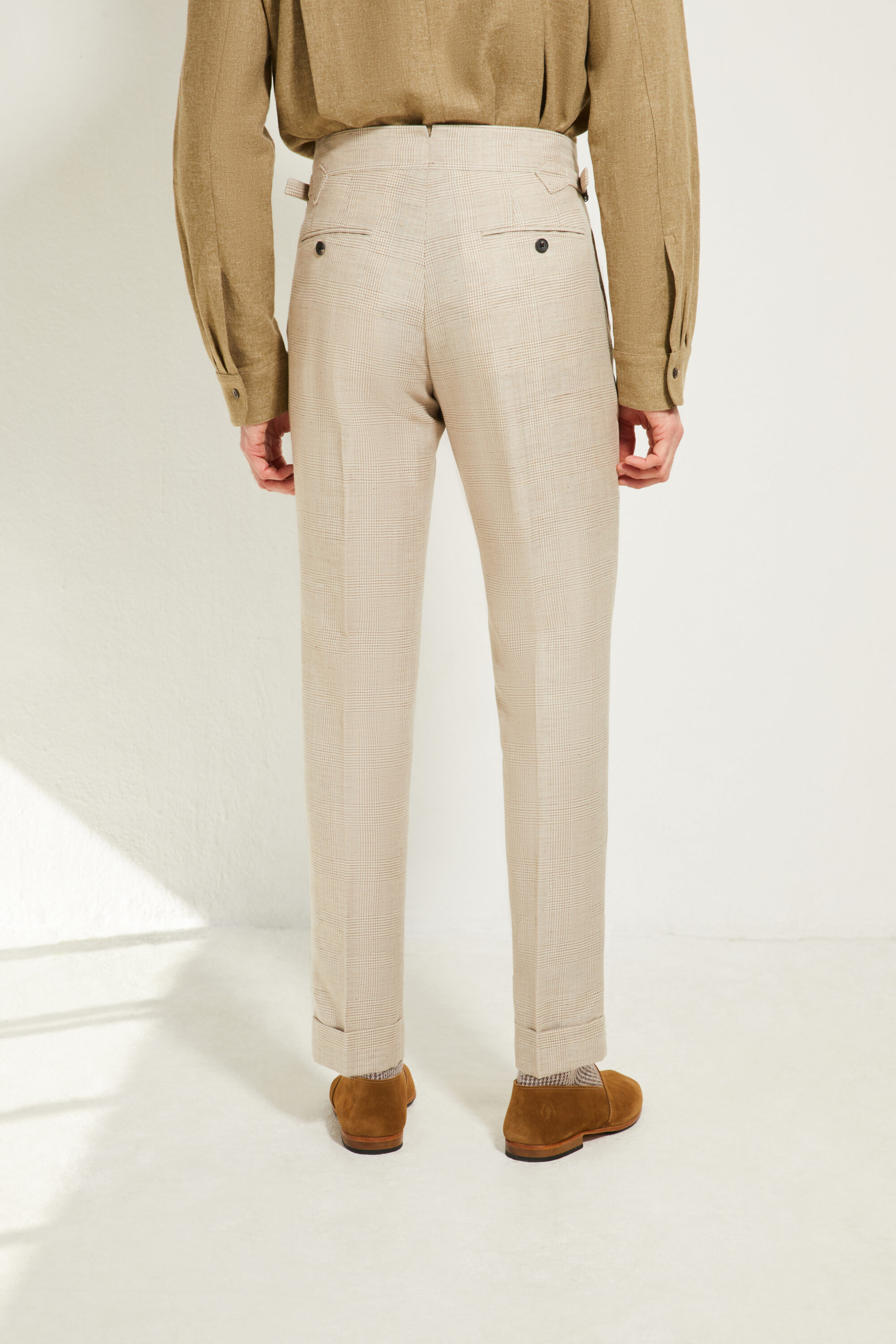 Notre pantalon adopte une coupe ajustée, inspirée du style italien : une ligne plus proche de la jambe, fuselée, nette et élégante, pensée pour accompagner une silhouette contemporaine tout en restant sartoriale.
