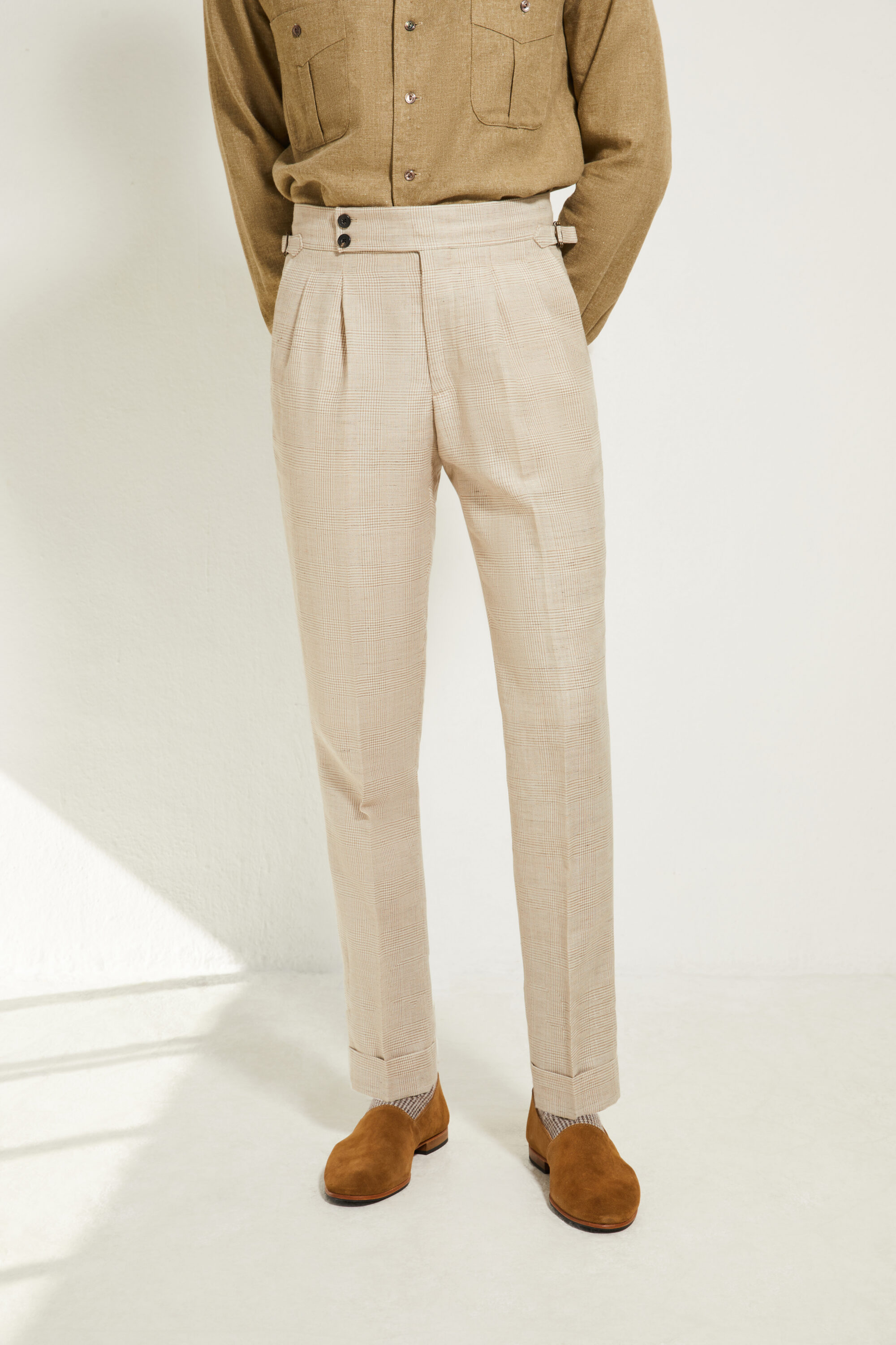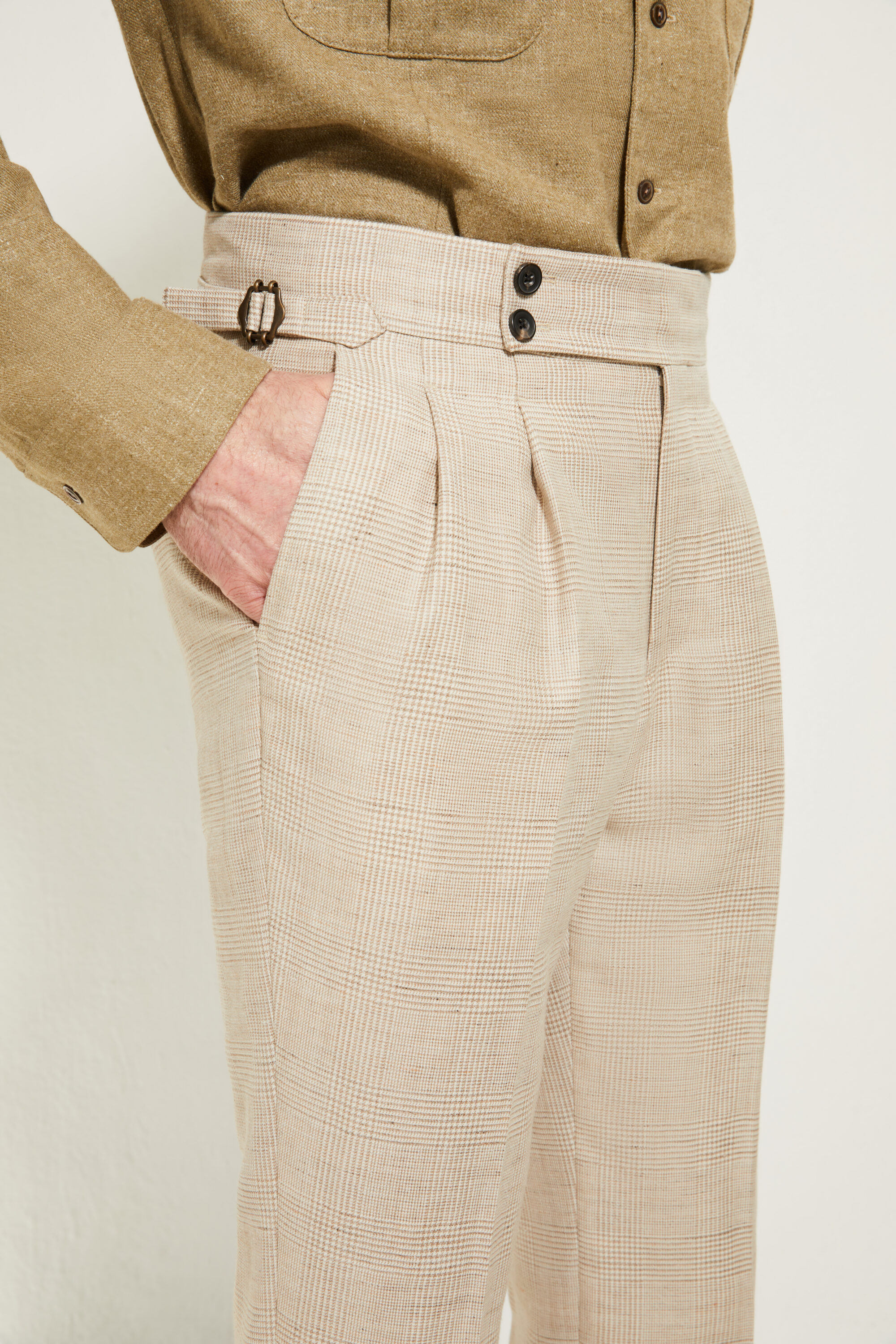 Réalisé dans une toile de laine et lin anglais signée Alfred Brown (fondée en 1915), ce pantalon associe la tenue de la laine à la fraîcheur et à la légèreté du lin. Cette étoffe offre un tombé net, une belle main sèche et un confort particulièrement adapté aux saisons les plus chaudes, tout en conservant une allure résolument tailleur.