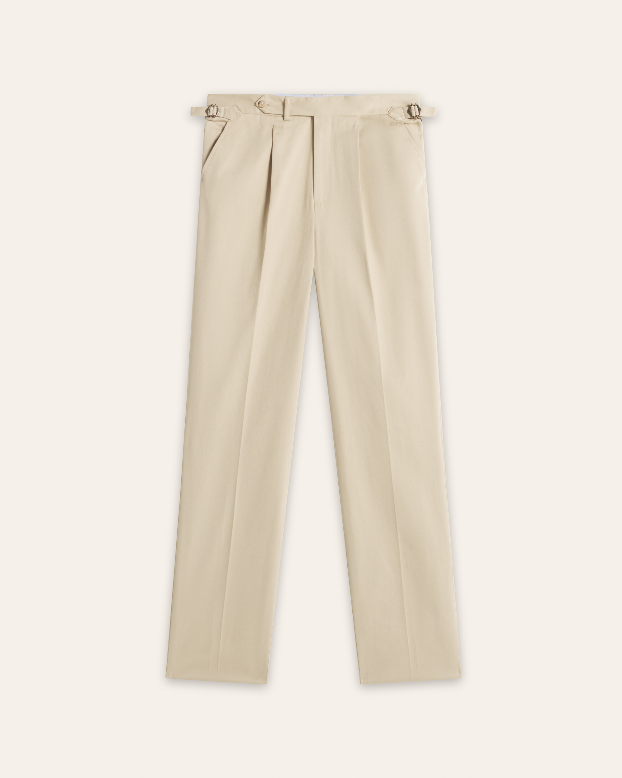 Fabriqué dans un coton sergé Dragoni (Italie), ce pantalon est conçu pour être porté pendant les saisons chaudes.
