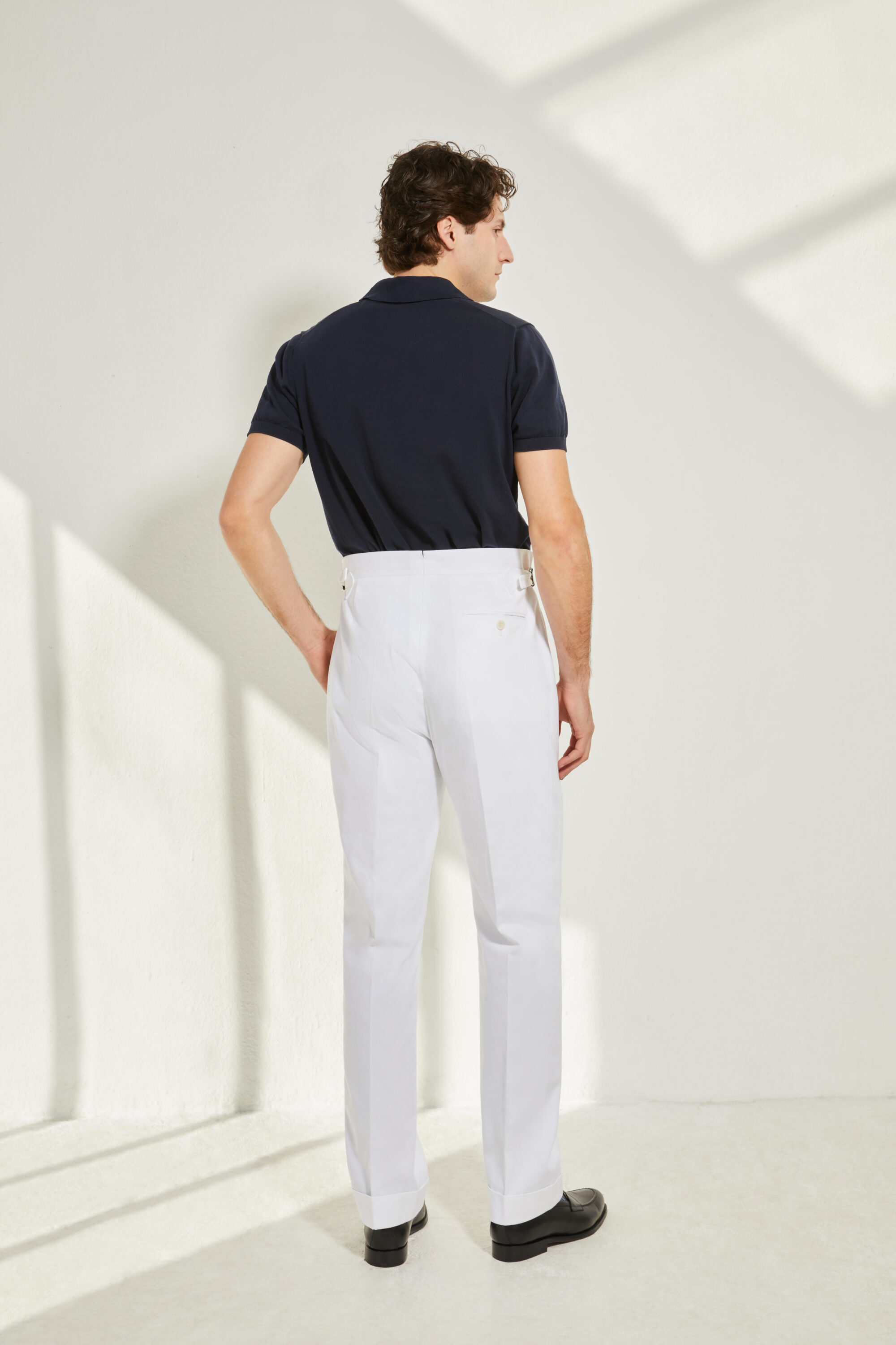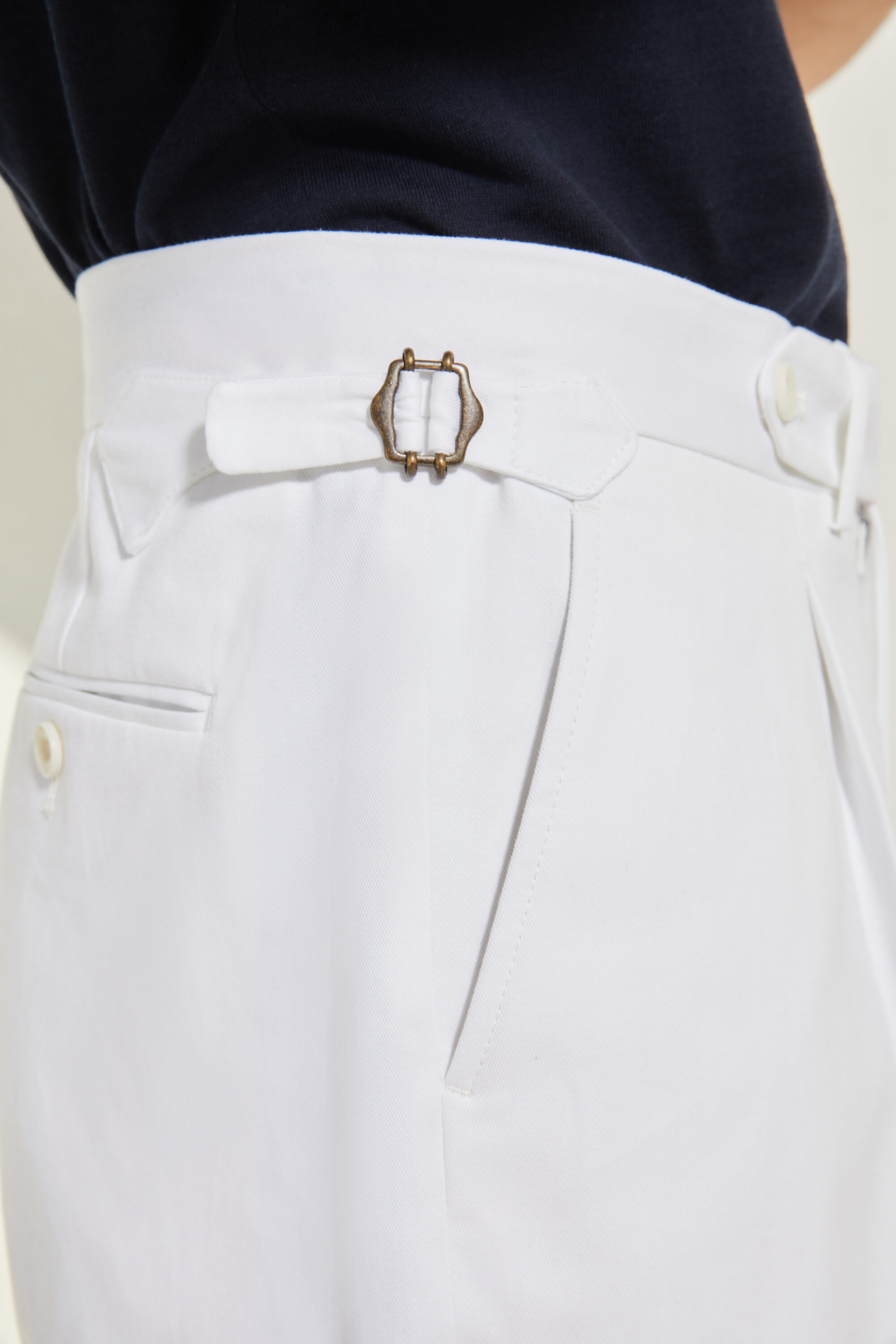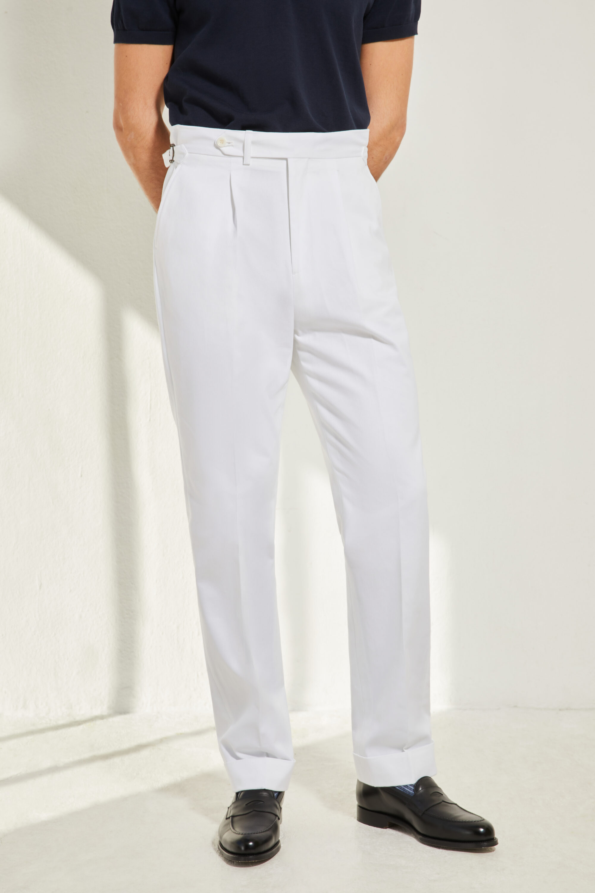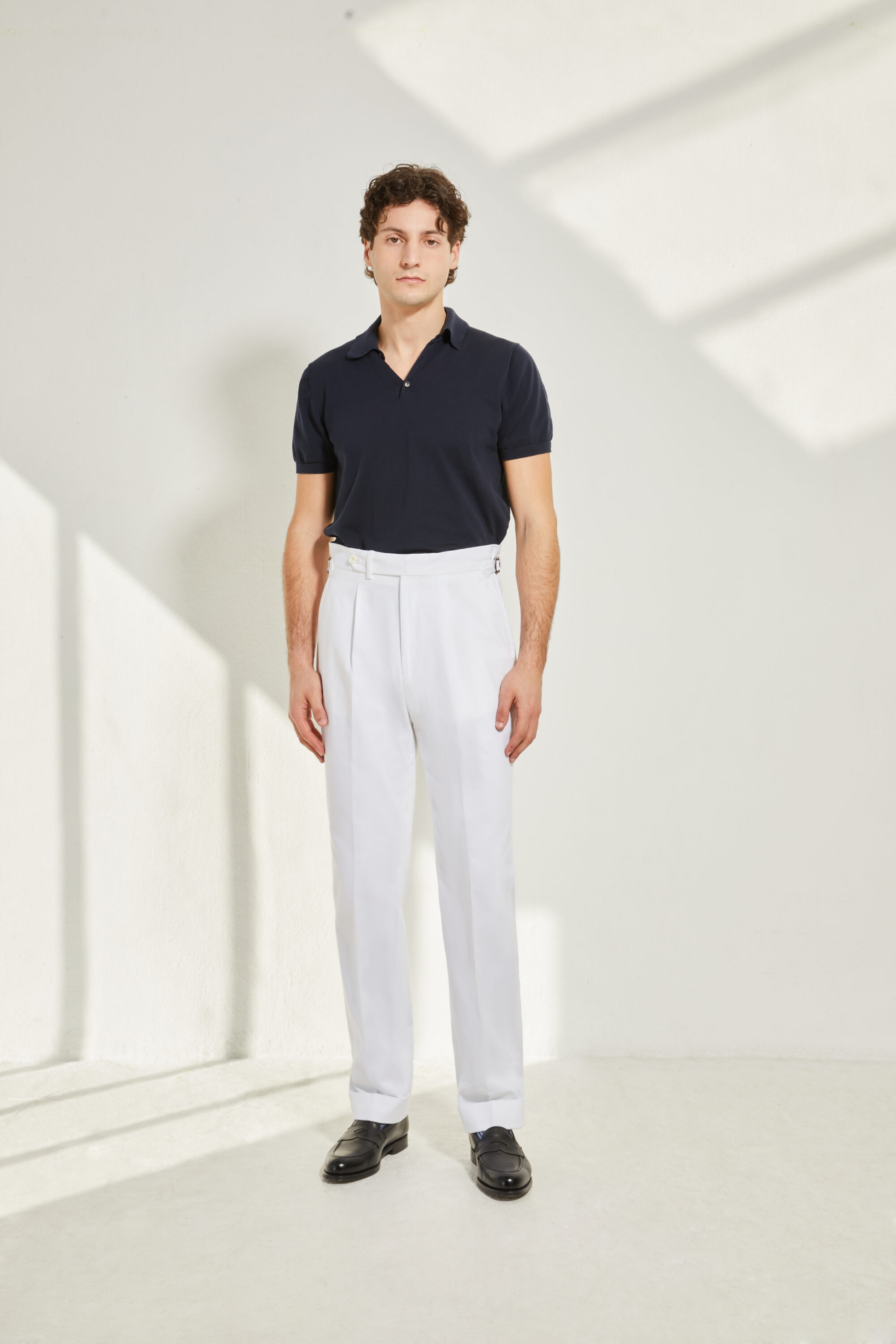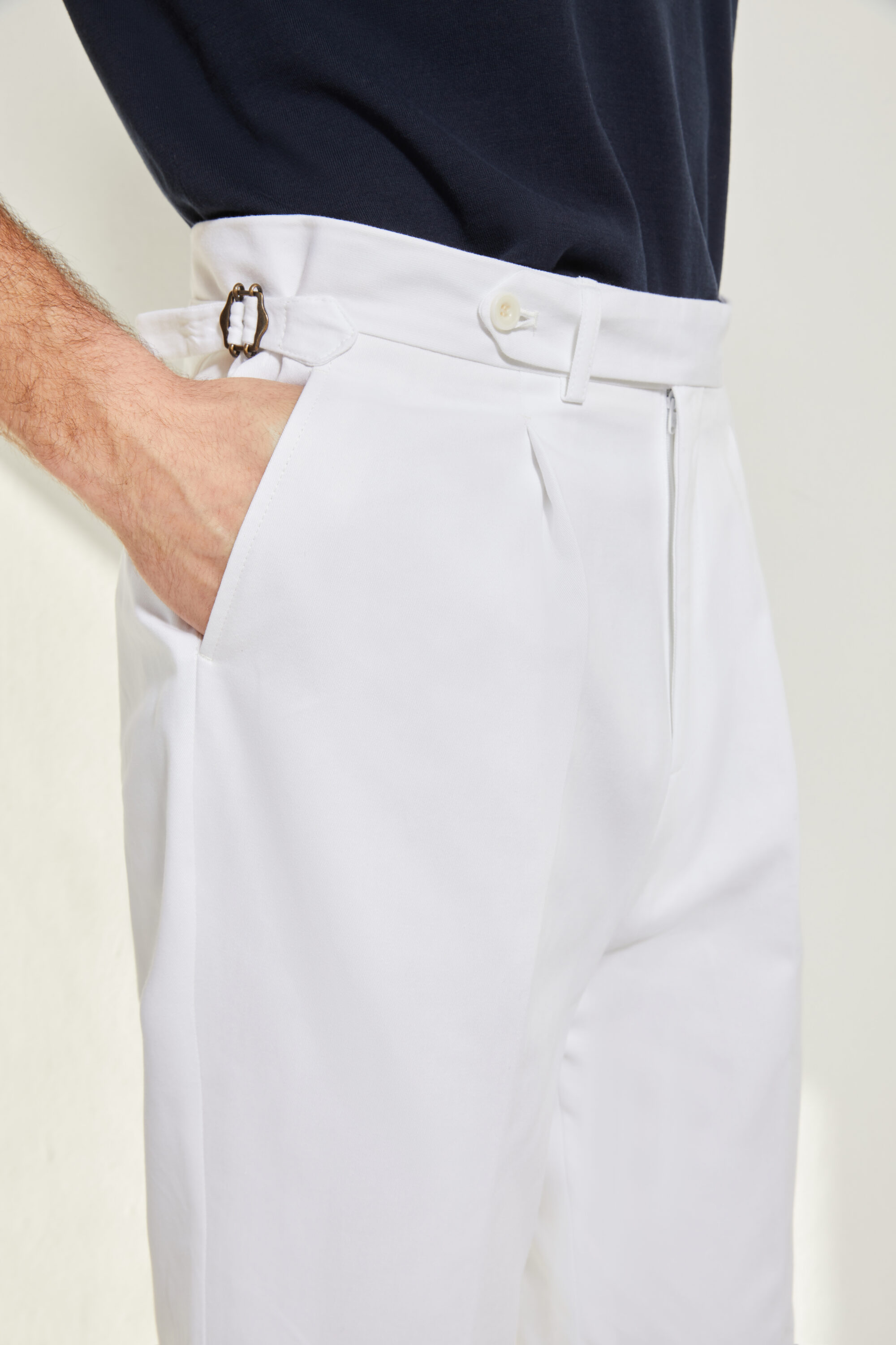 Fabriqué dans un coton sergé italien, ce pantalon est conçu pour être porté pendant les saisons les plus chaudes.