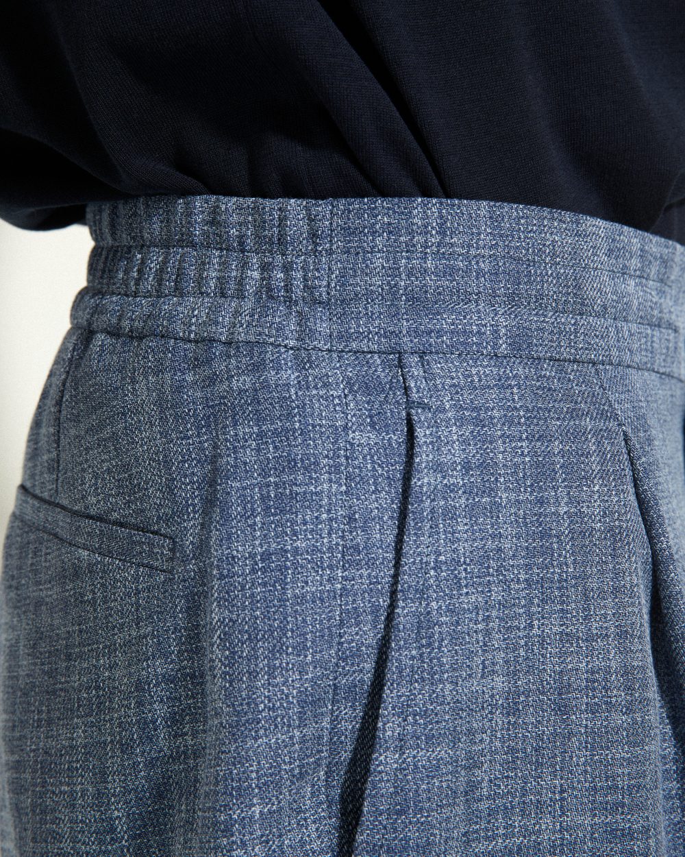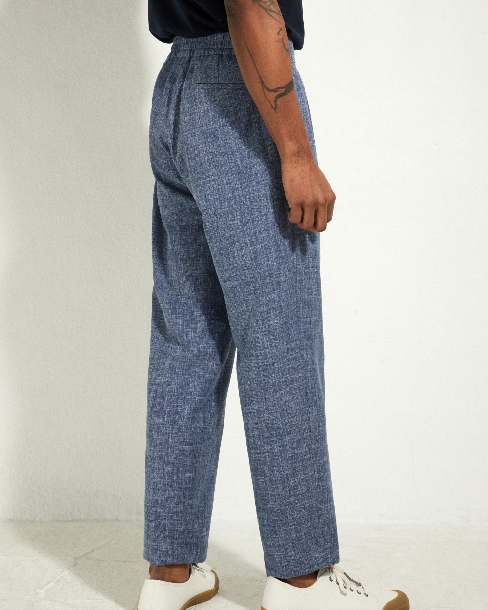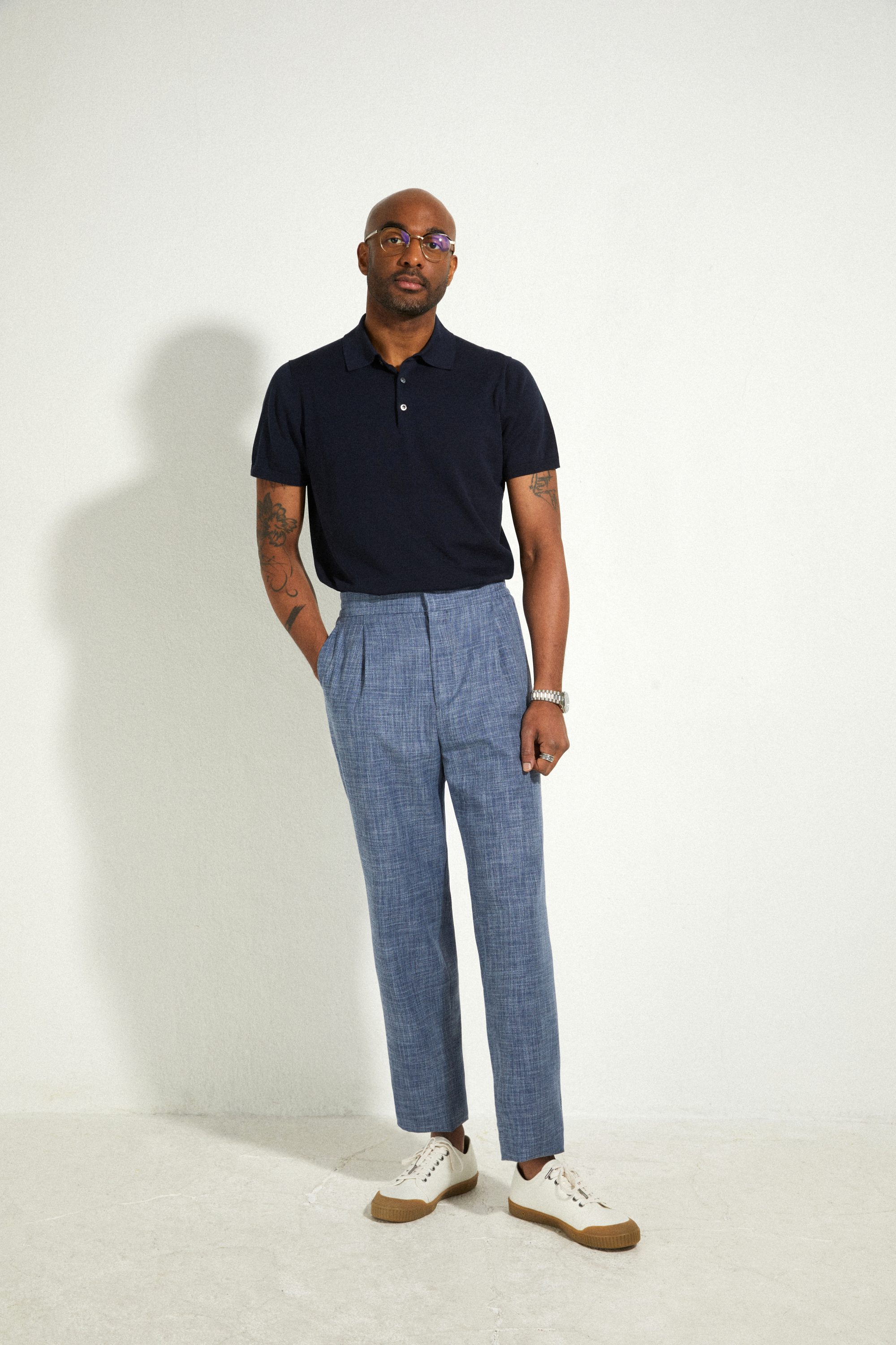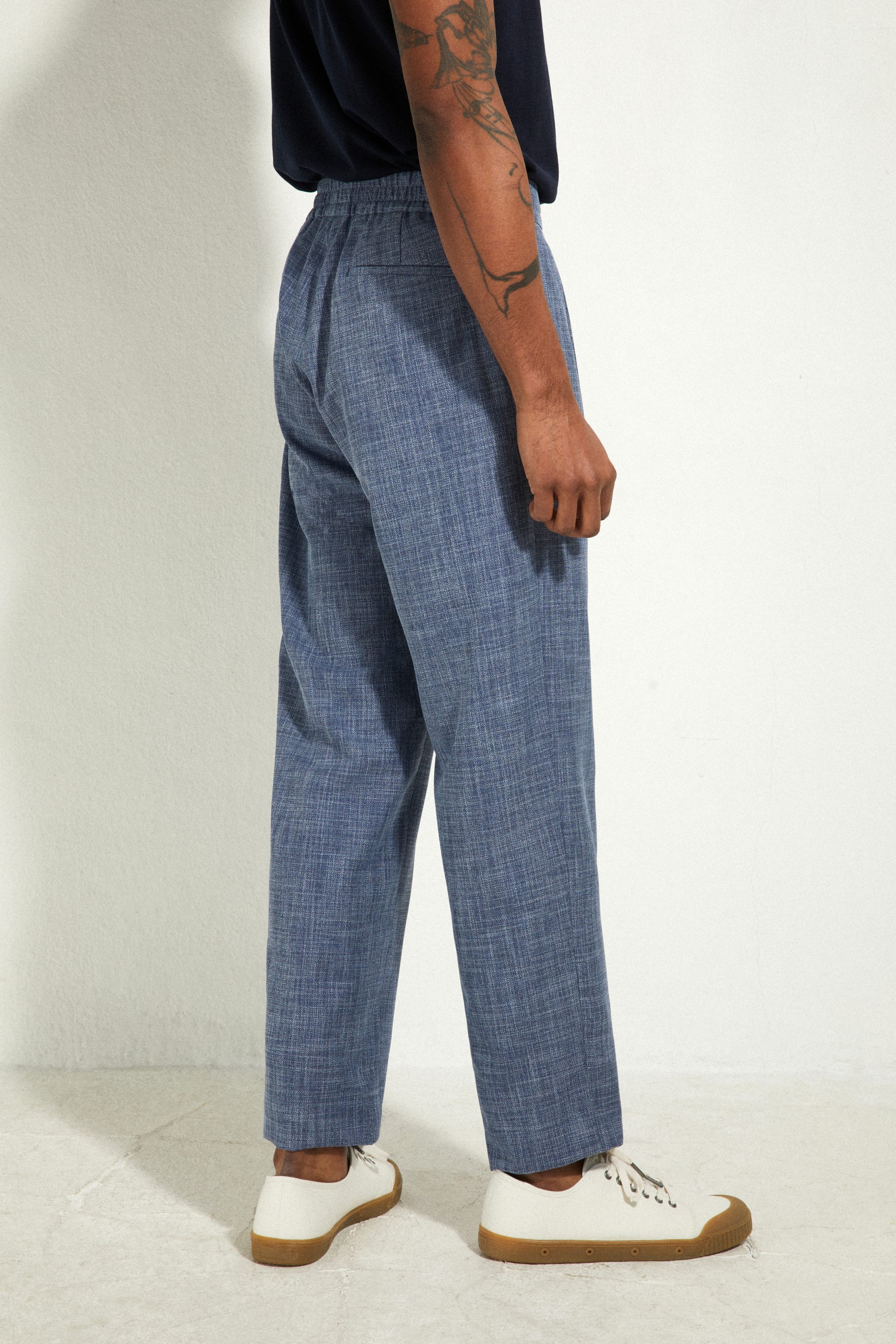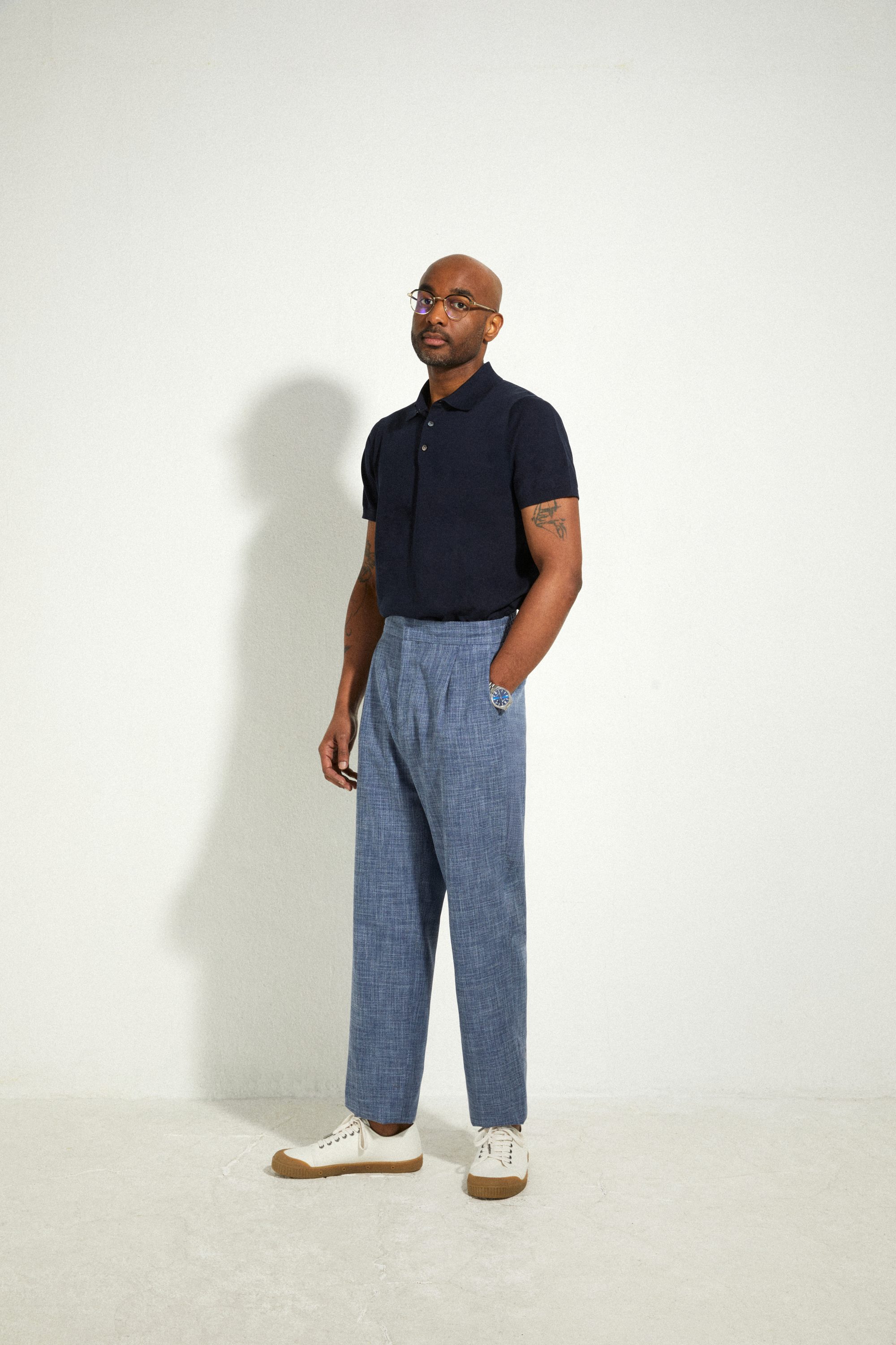 Designed to be worn with a T-shirt or a lightweight jacket. The comfort of lounge trousers, the line of tailored ones. That’s the whole point.