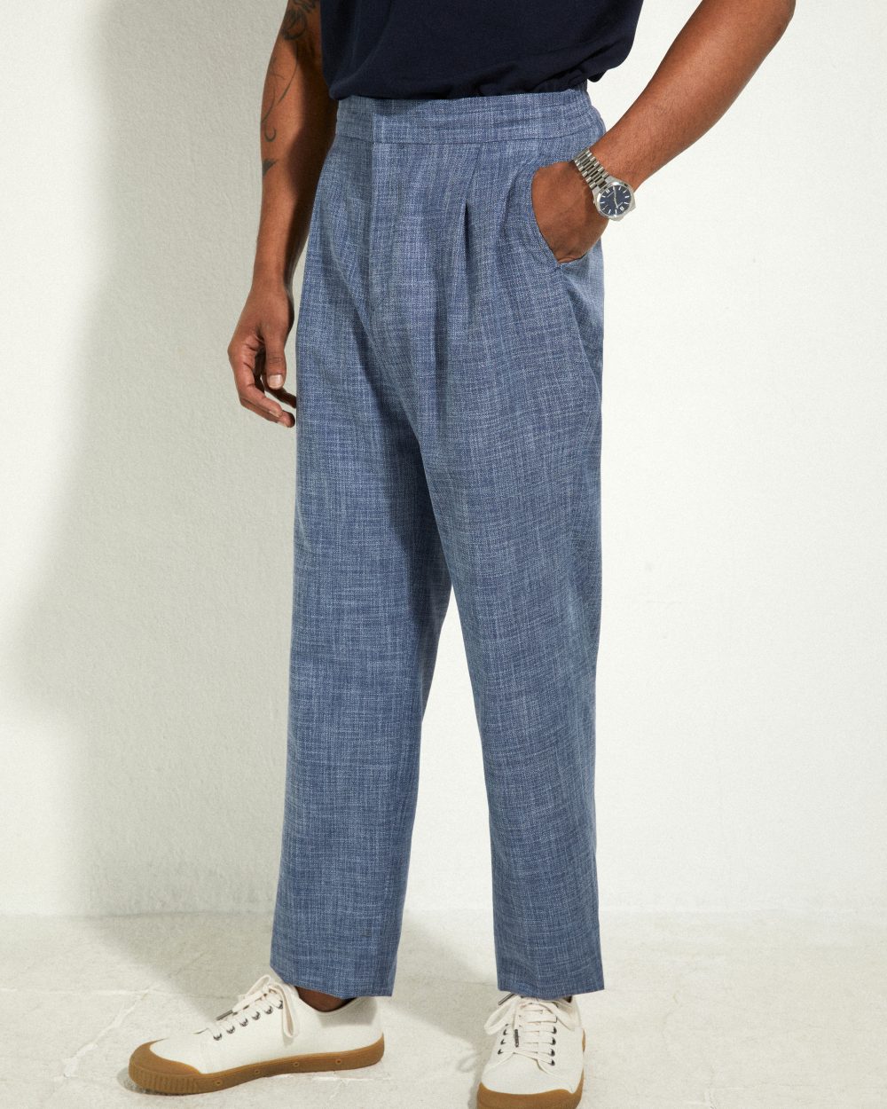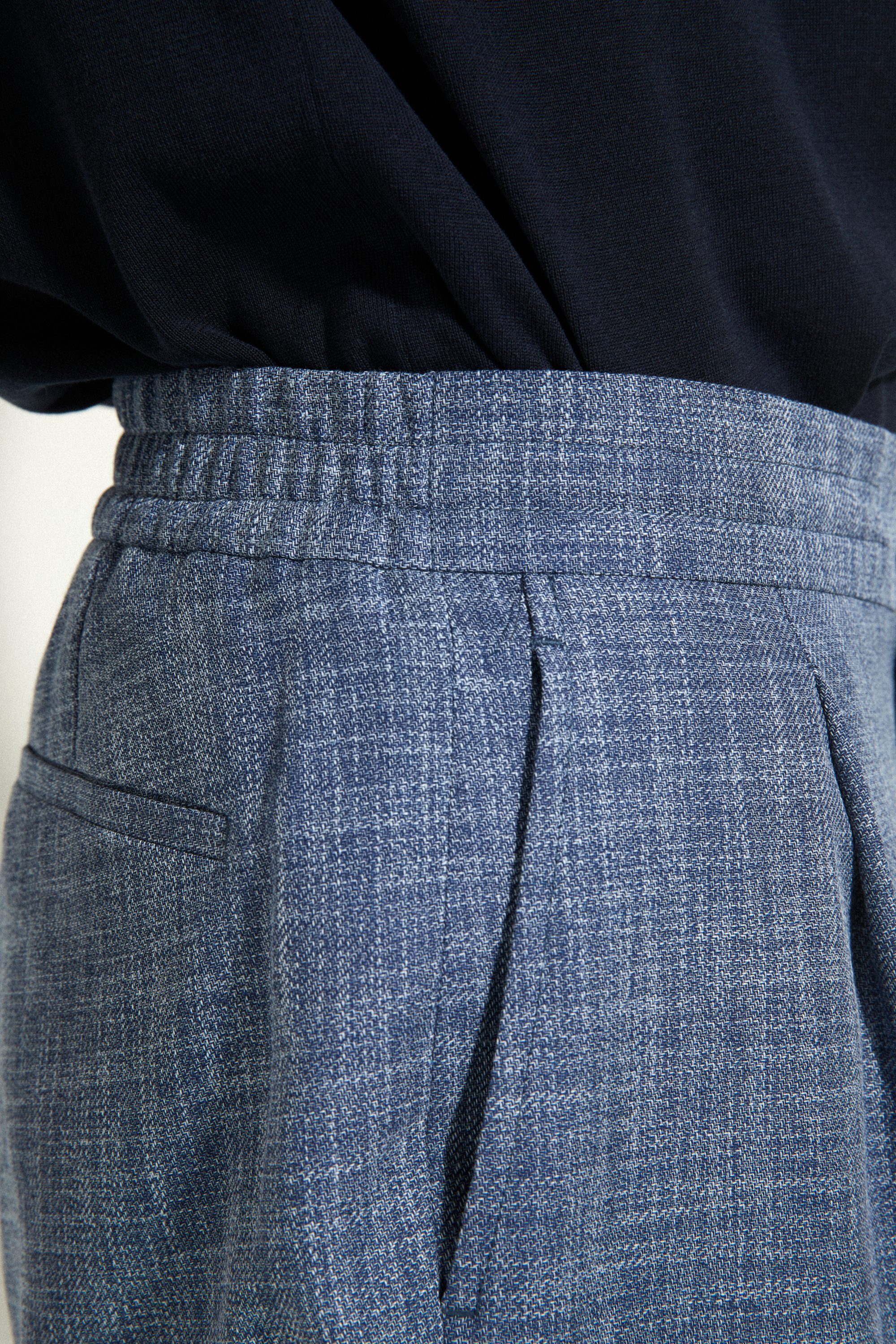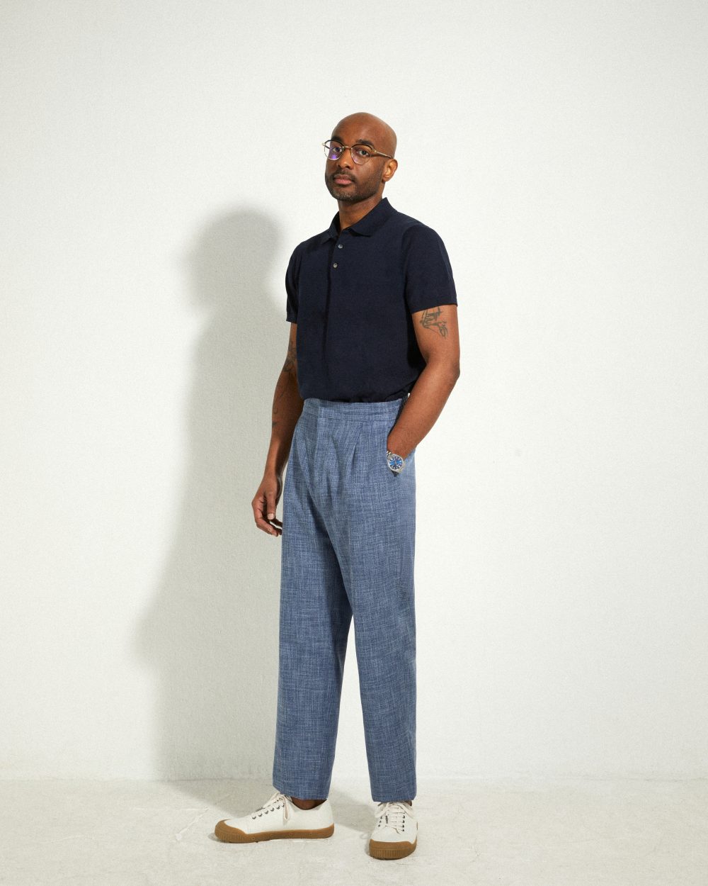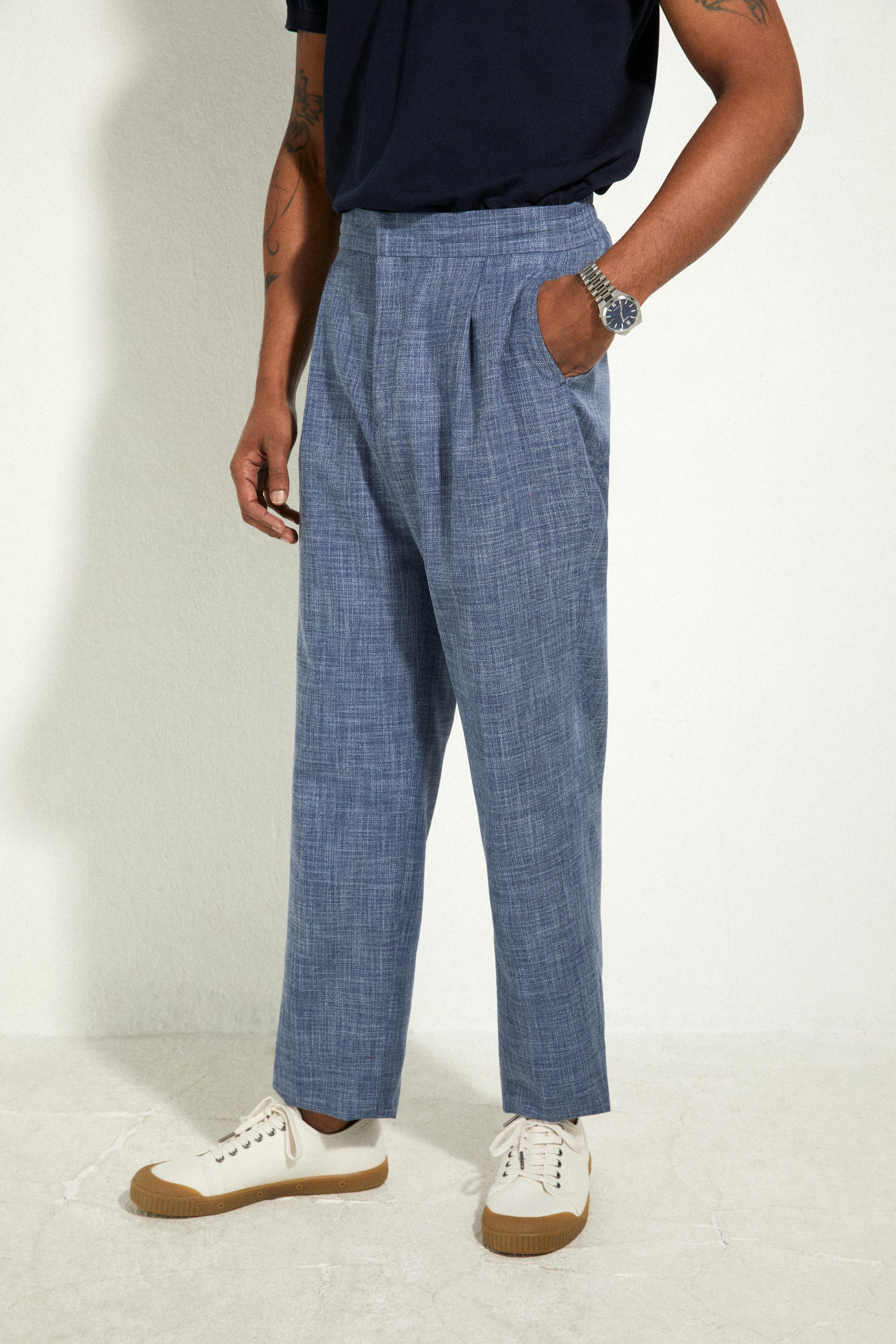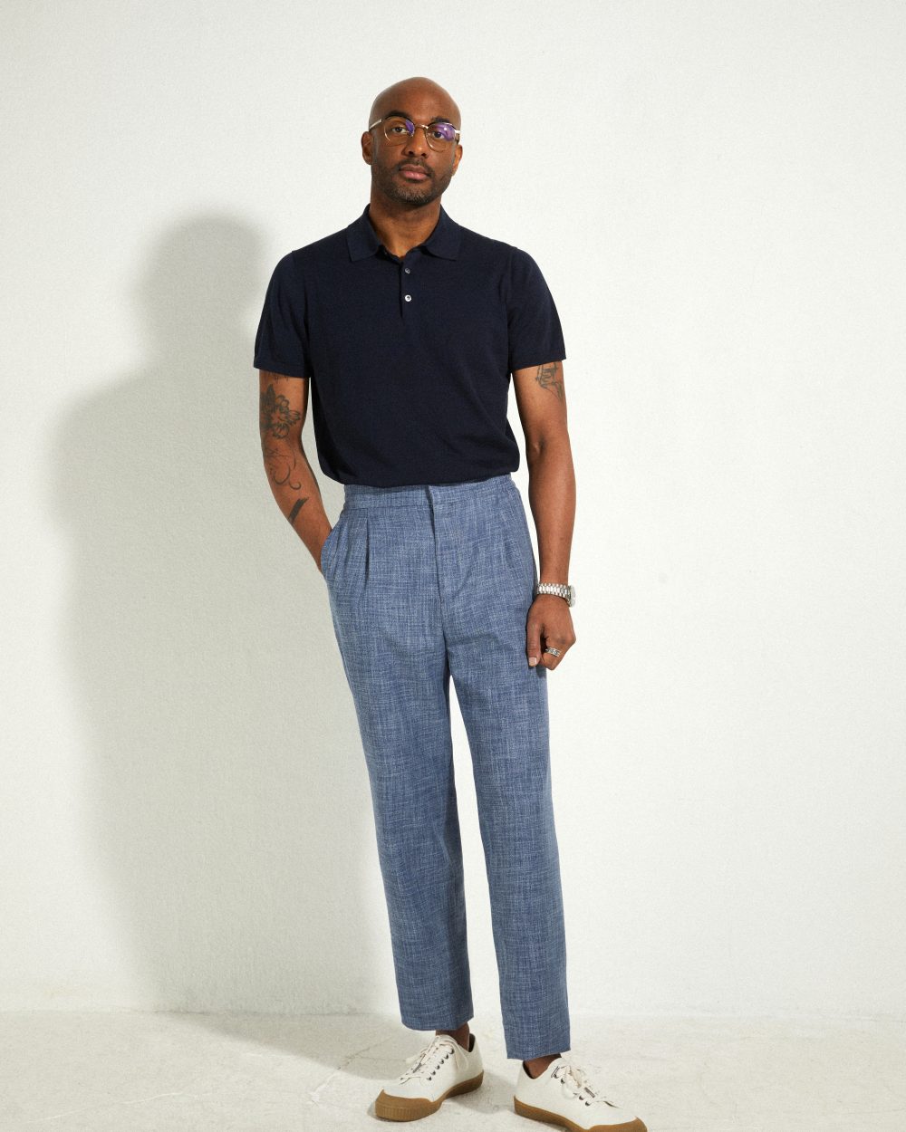 Designed to be worn with a T-shirt or a lightweight jacket. The comfort of lounge trousers, the line of tailored ones. That’s the whole point.