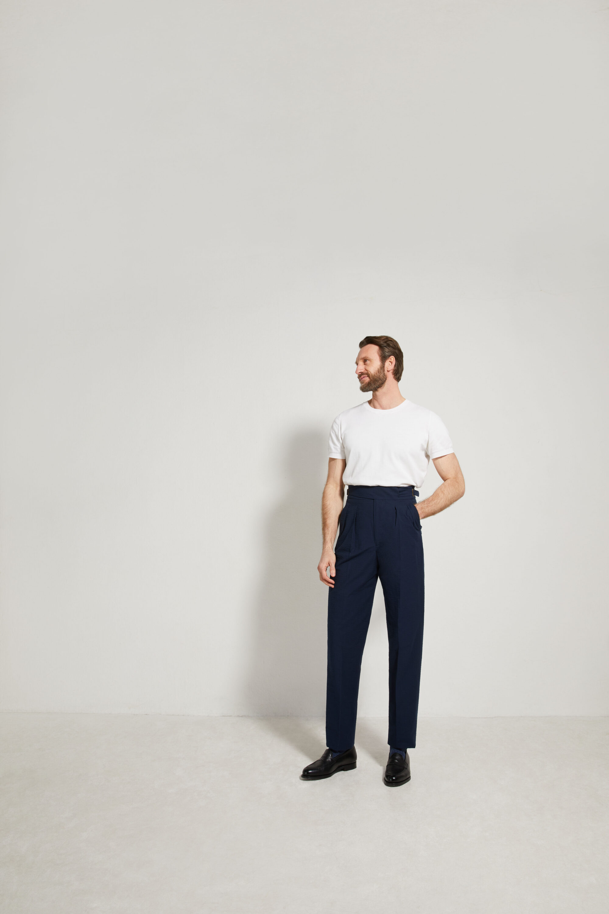 • Taille haute, coupe droite, avec de l’aisance au niveau des cuisses jusqu’au bas de jambe pour un tombé droit.