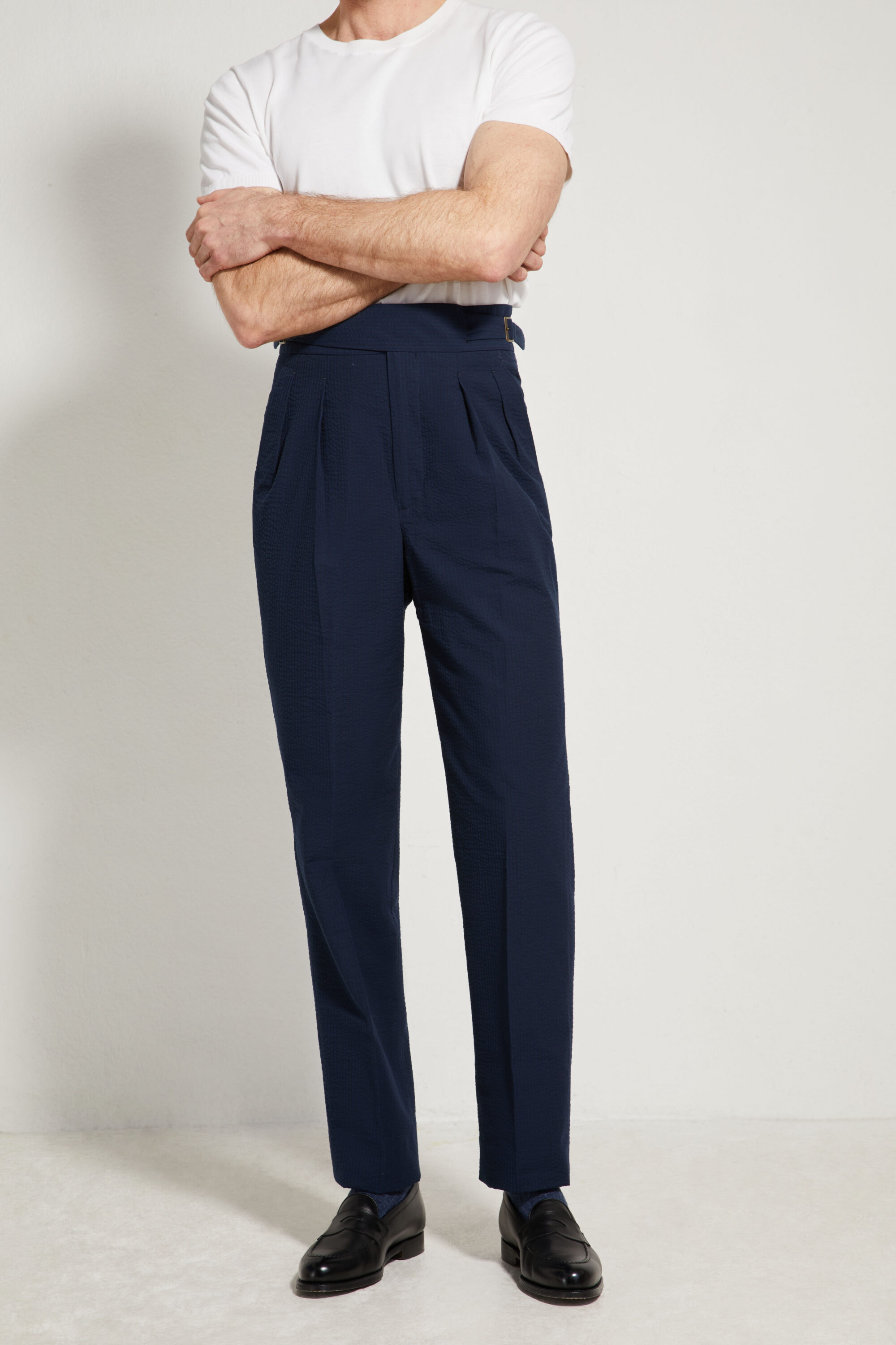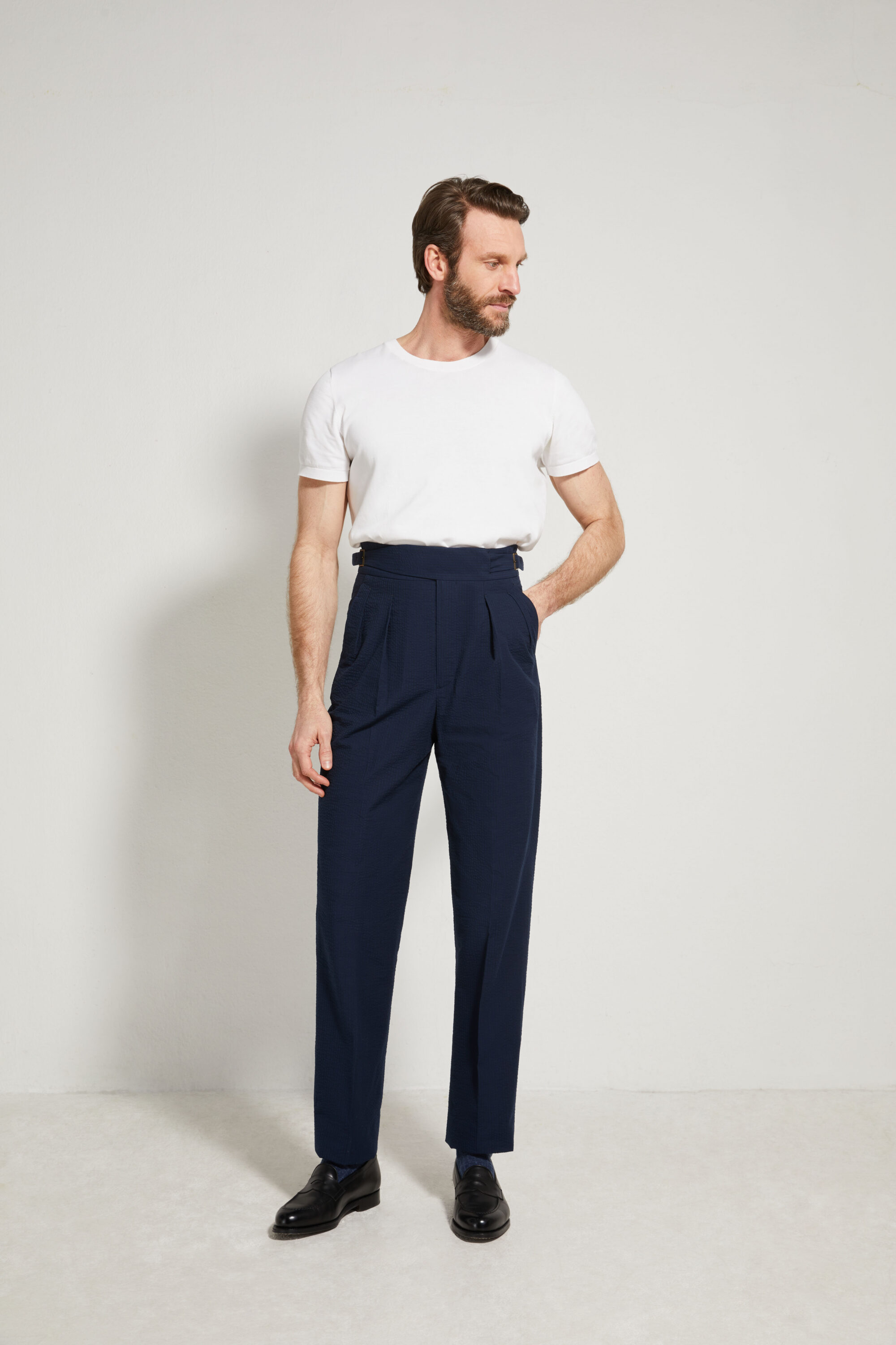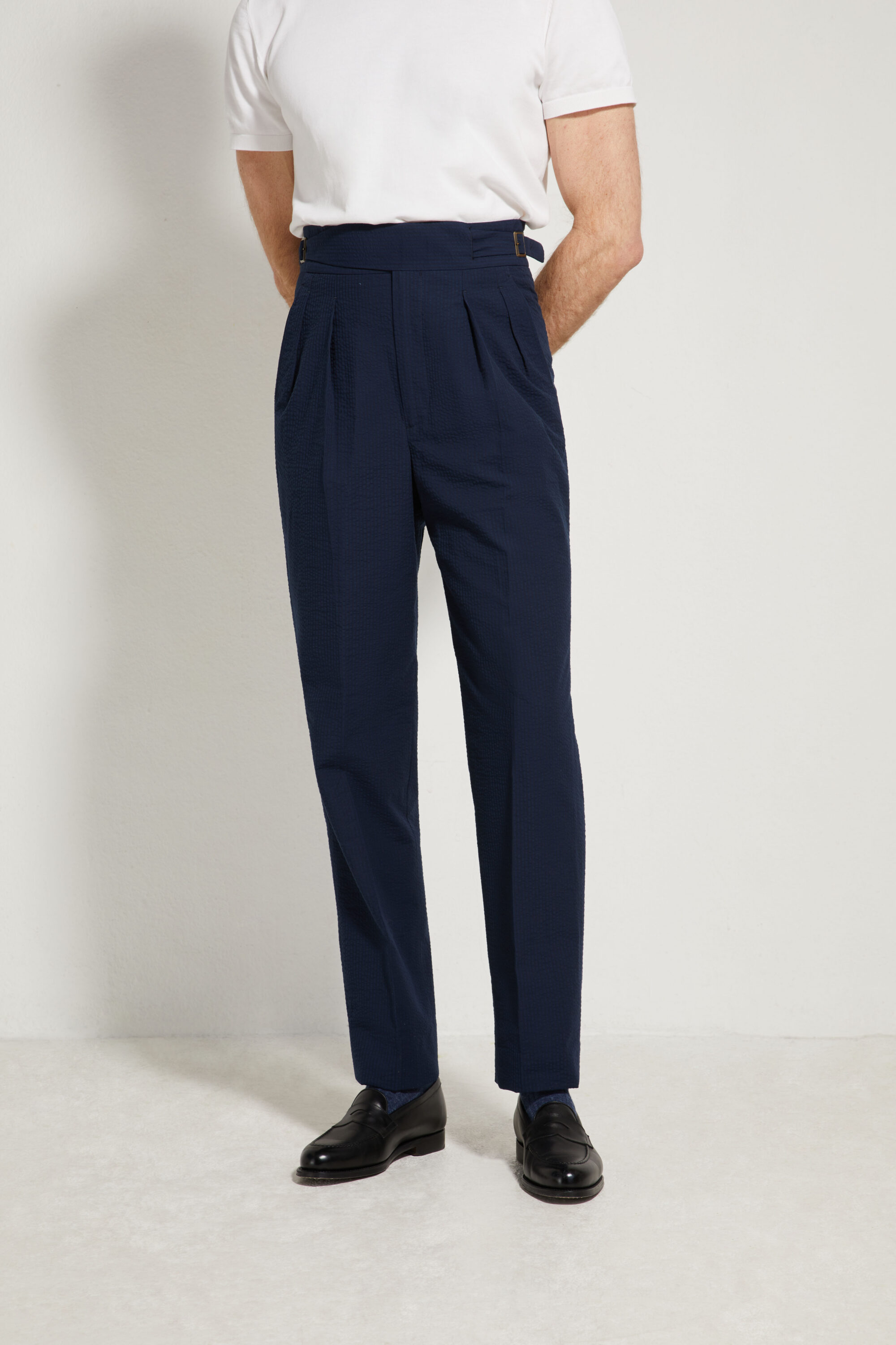 Le pantalon Gurkha est un modèle emblématique d’inspiration militaire, reconnaissable à sa taille haute et à son système de fermeture caractéristique composé de deux sangles croisées venant se boutonner sur le devant.