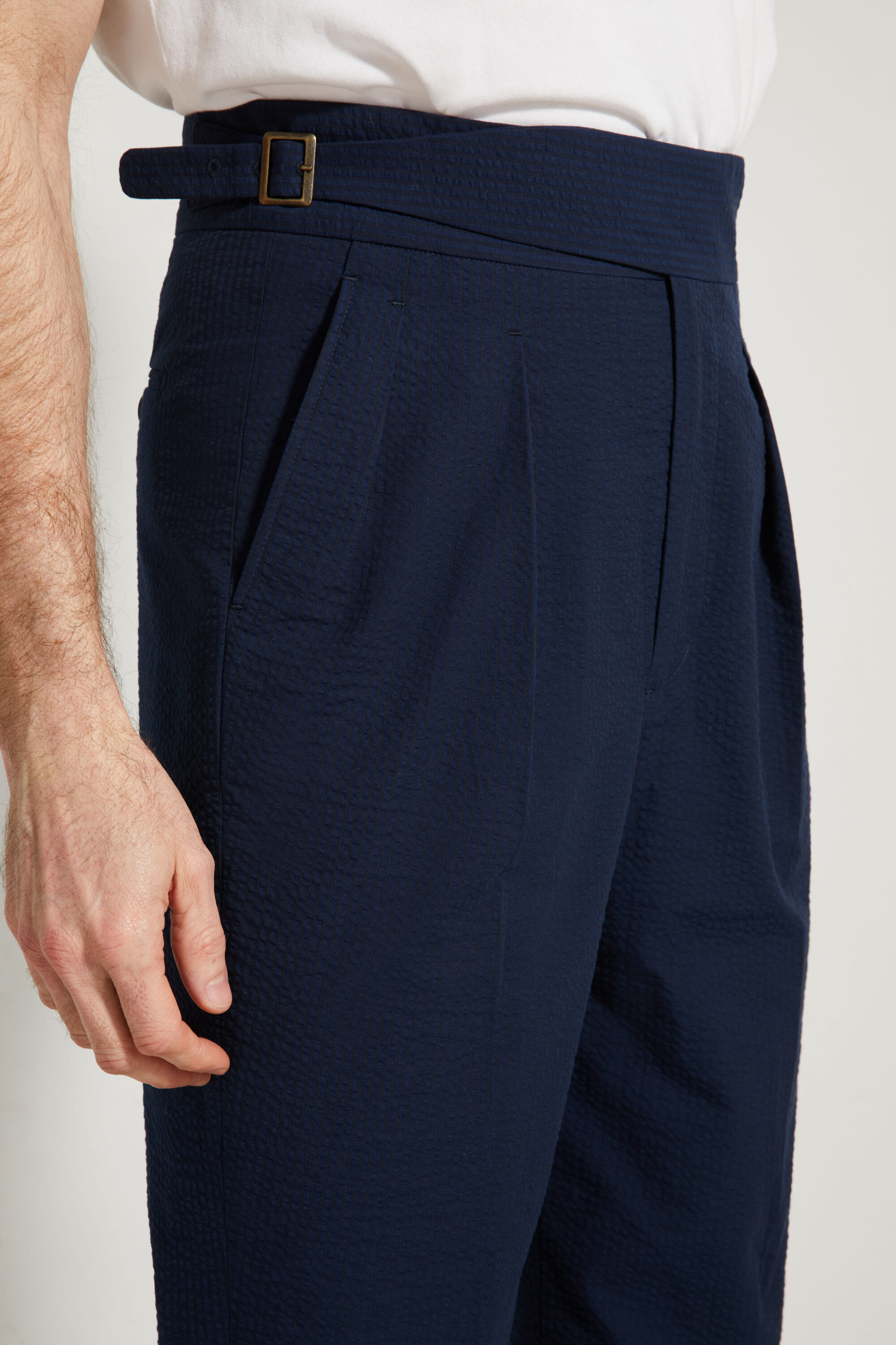 Fabriqué dans un coton seersucker, ce pantalon est conçu pour être porté pendant les saisons les plus chaudes.