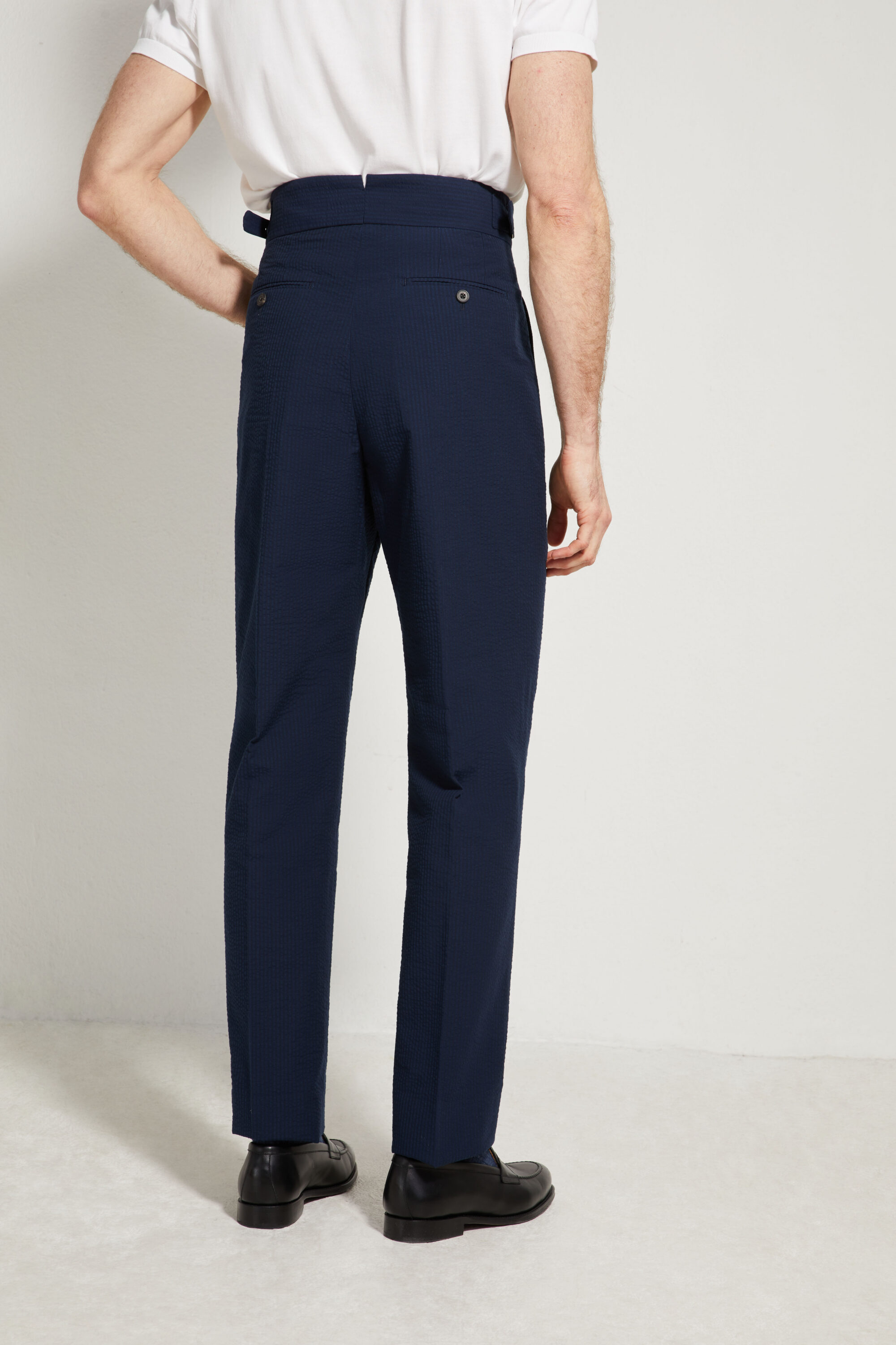 •⁠ ⁠Deux poches arrière passepoilées, fermées par un bouton en corne véritable
