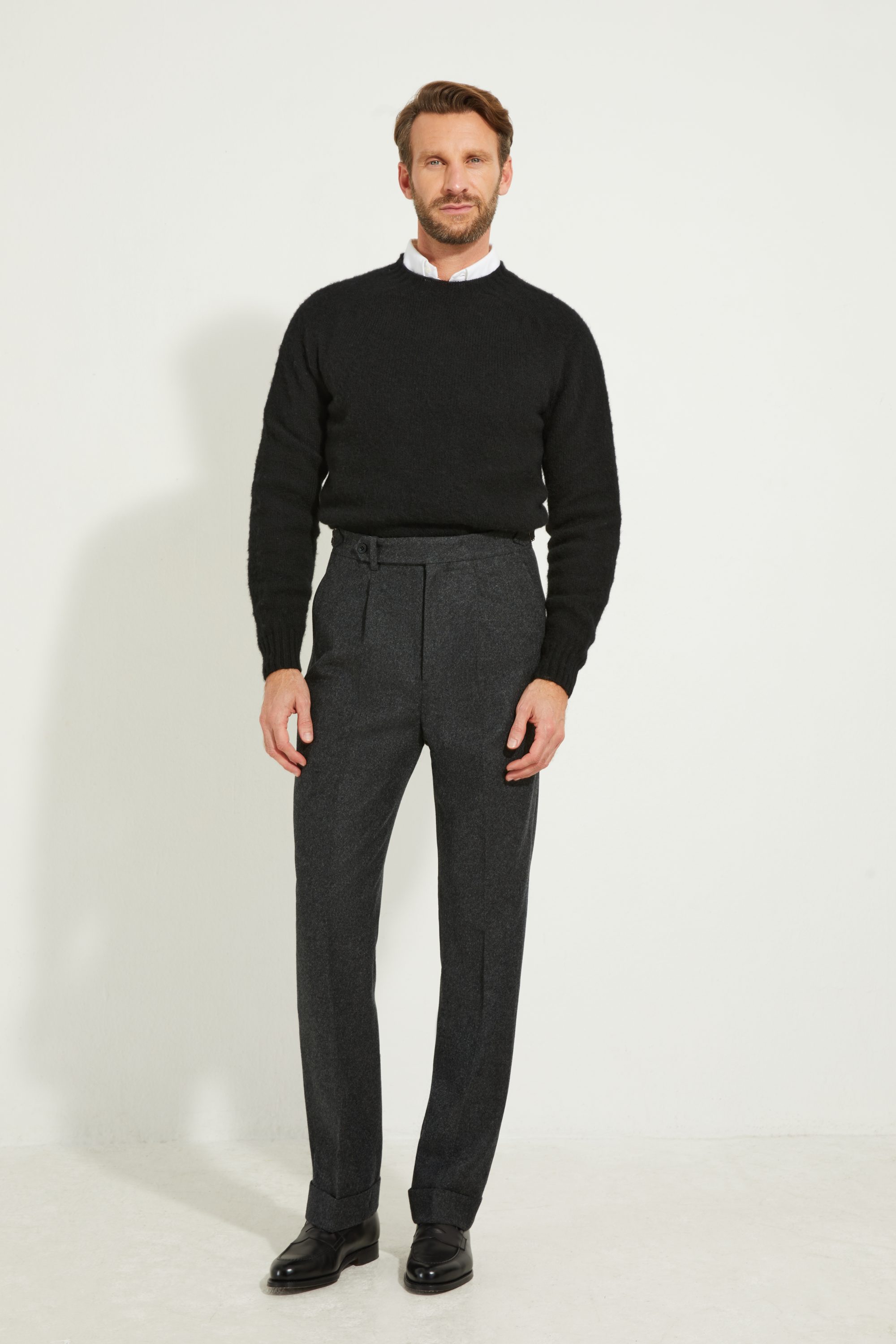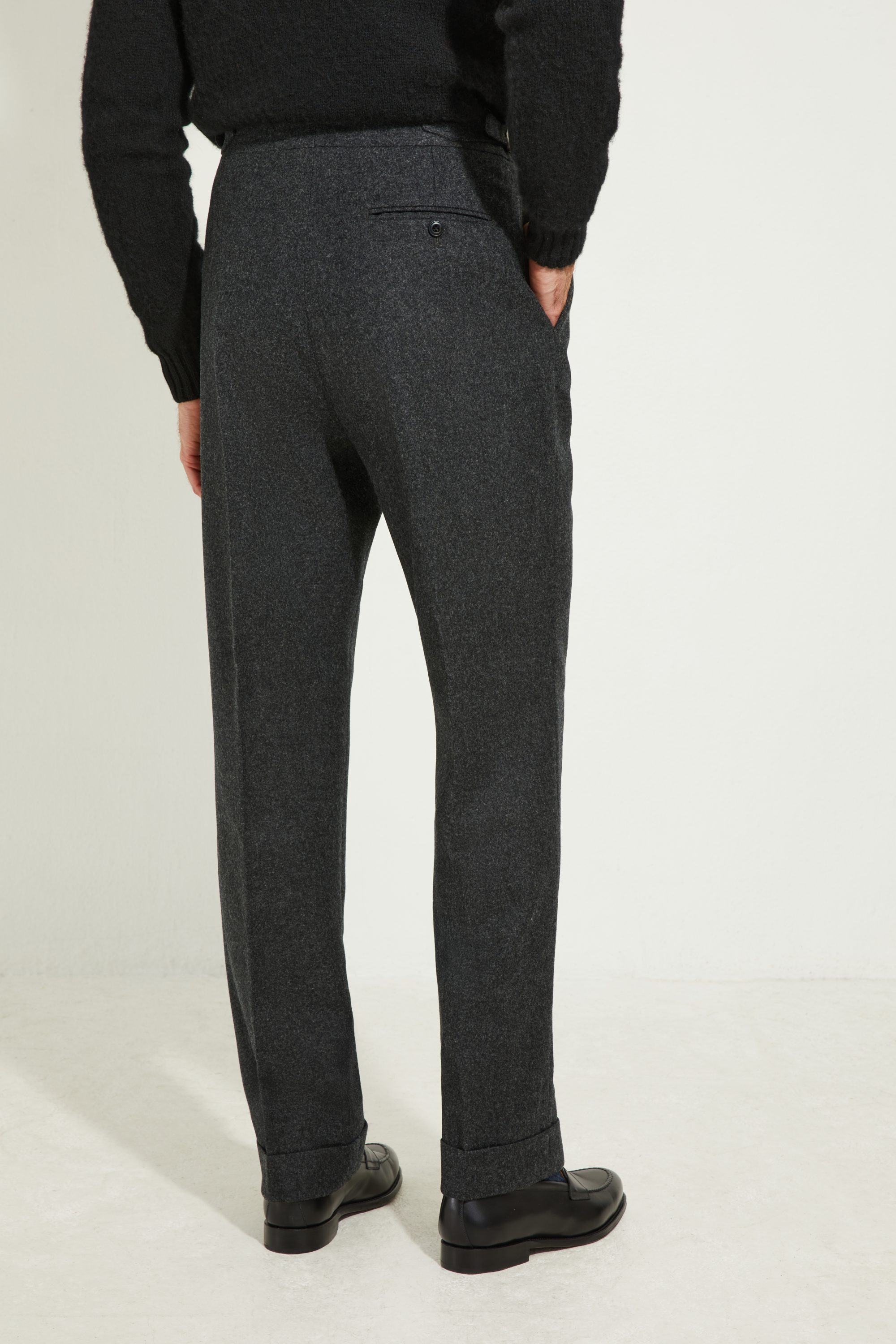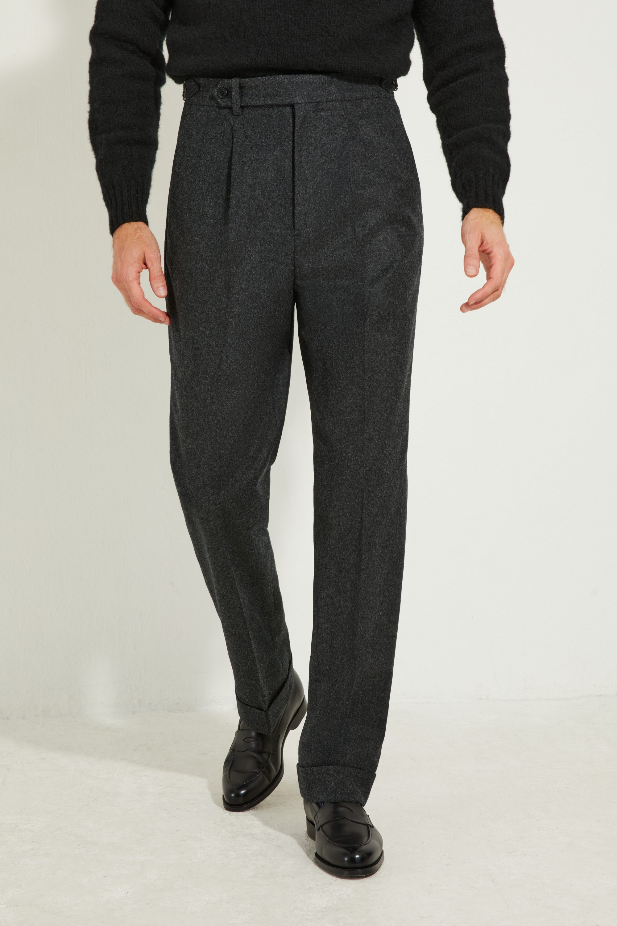Notre pantalon de flanelle est coupé avec une taille haute, conçu pour être porté à la taille avec une pince pour plus de confort et un style classique.