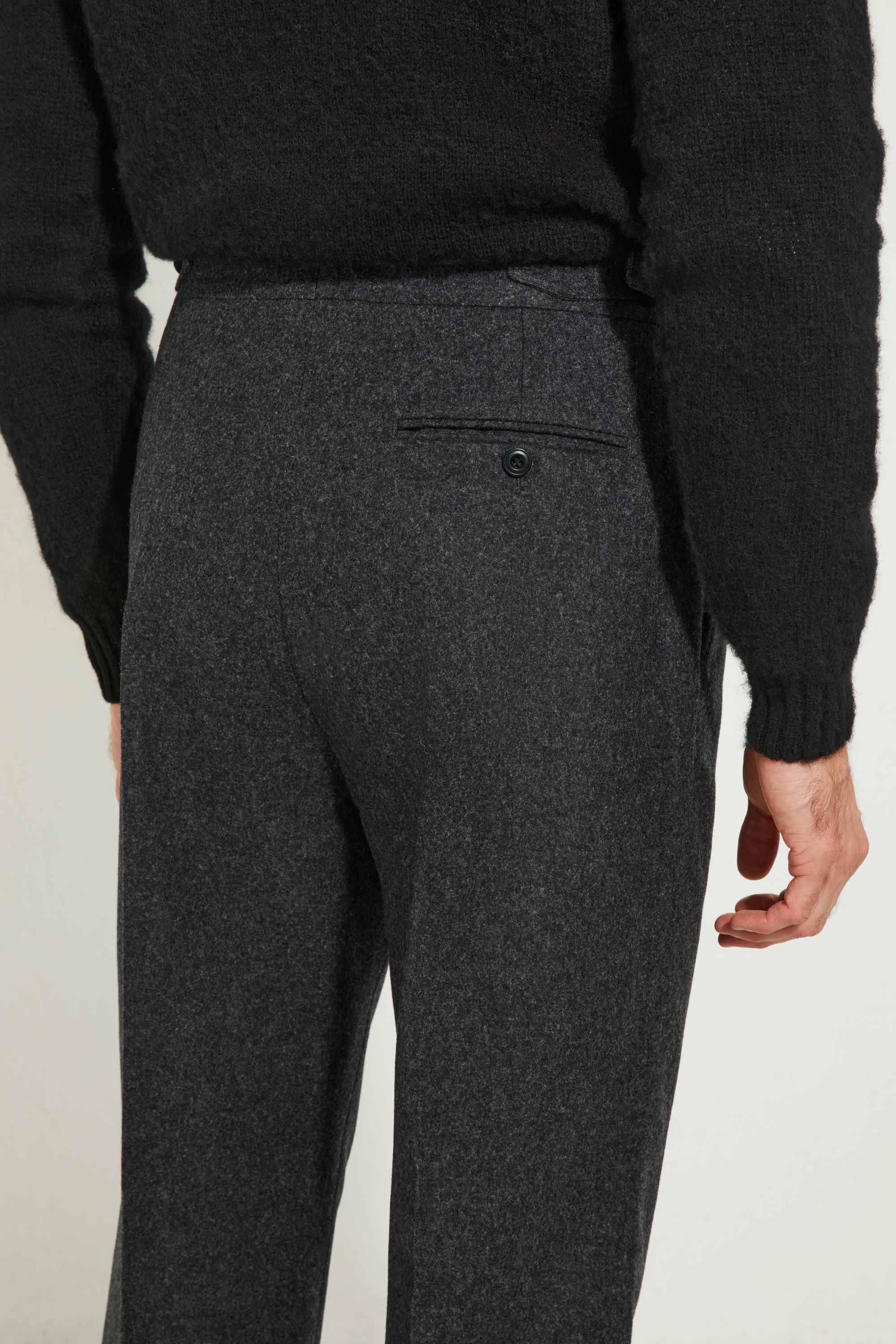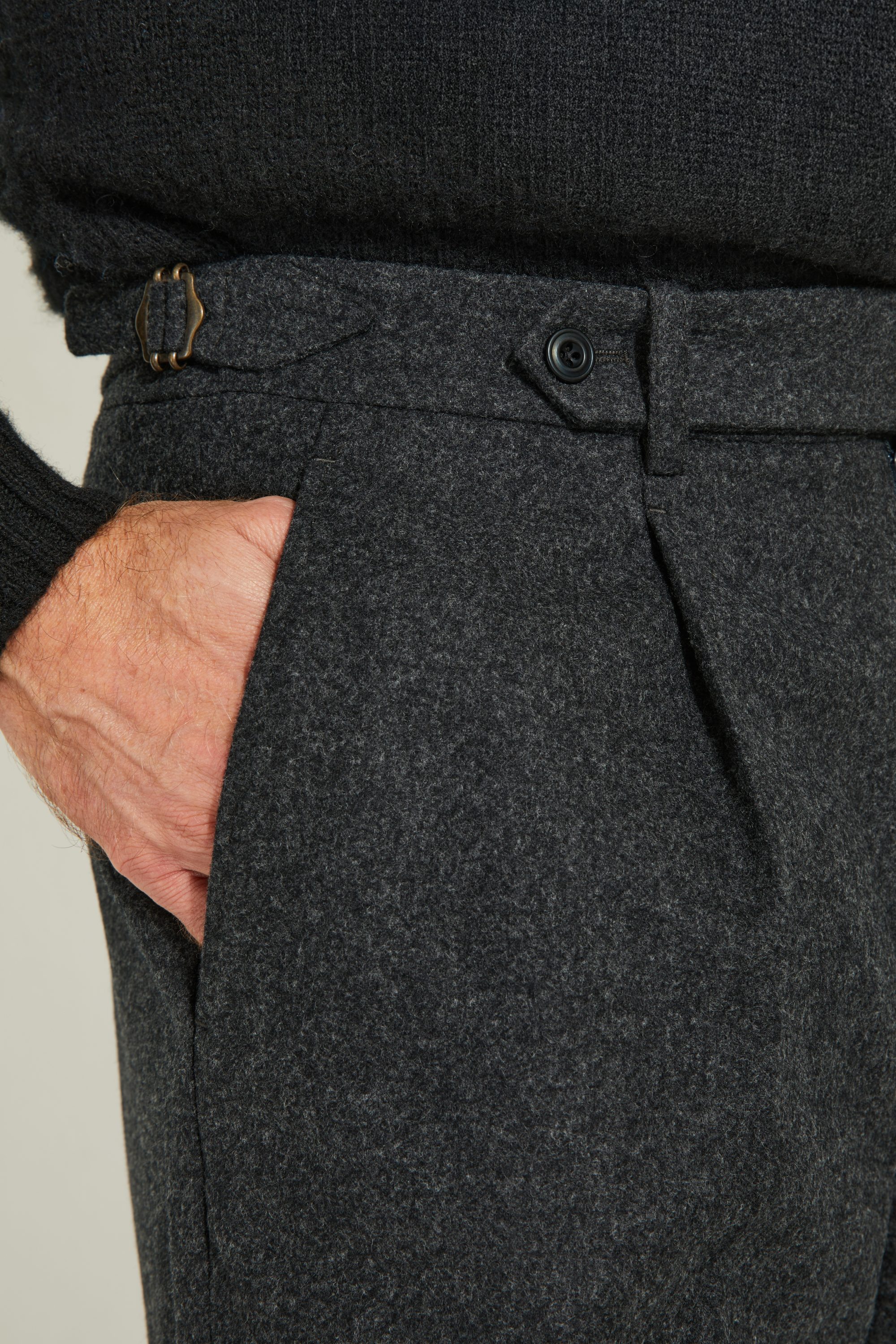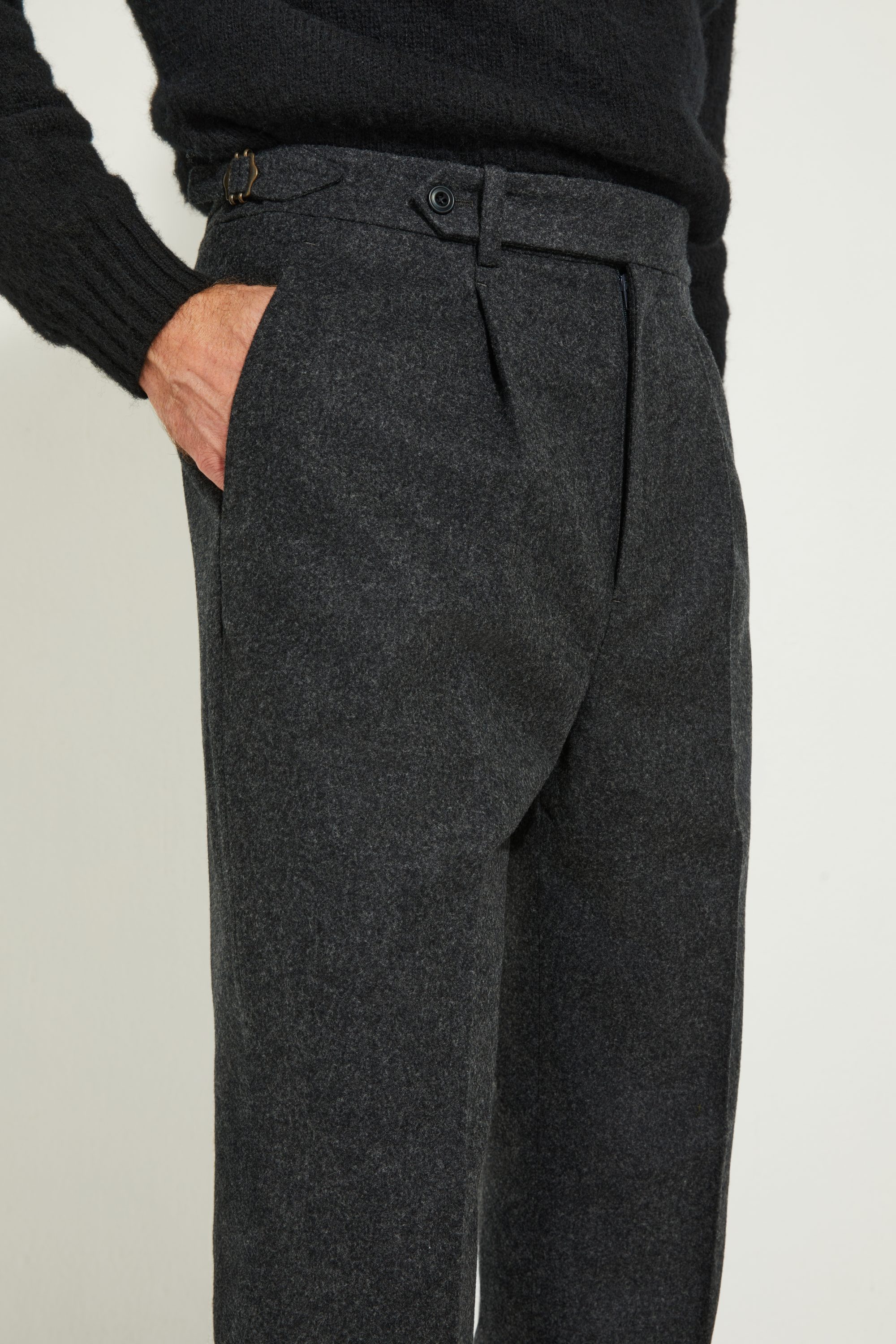 Notre pantalon de flanelle est coupé avec une taille haute, conçu pour être porté à la taille avec une pince pour plus de confort et un style classique.